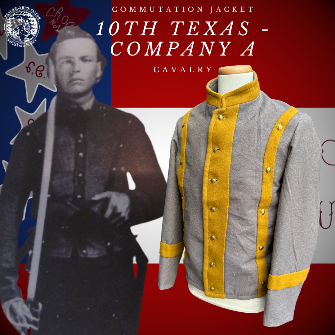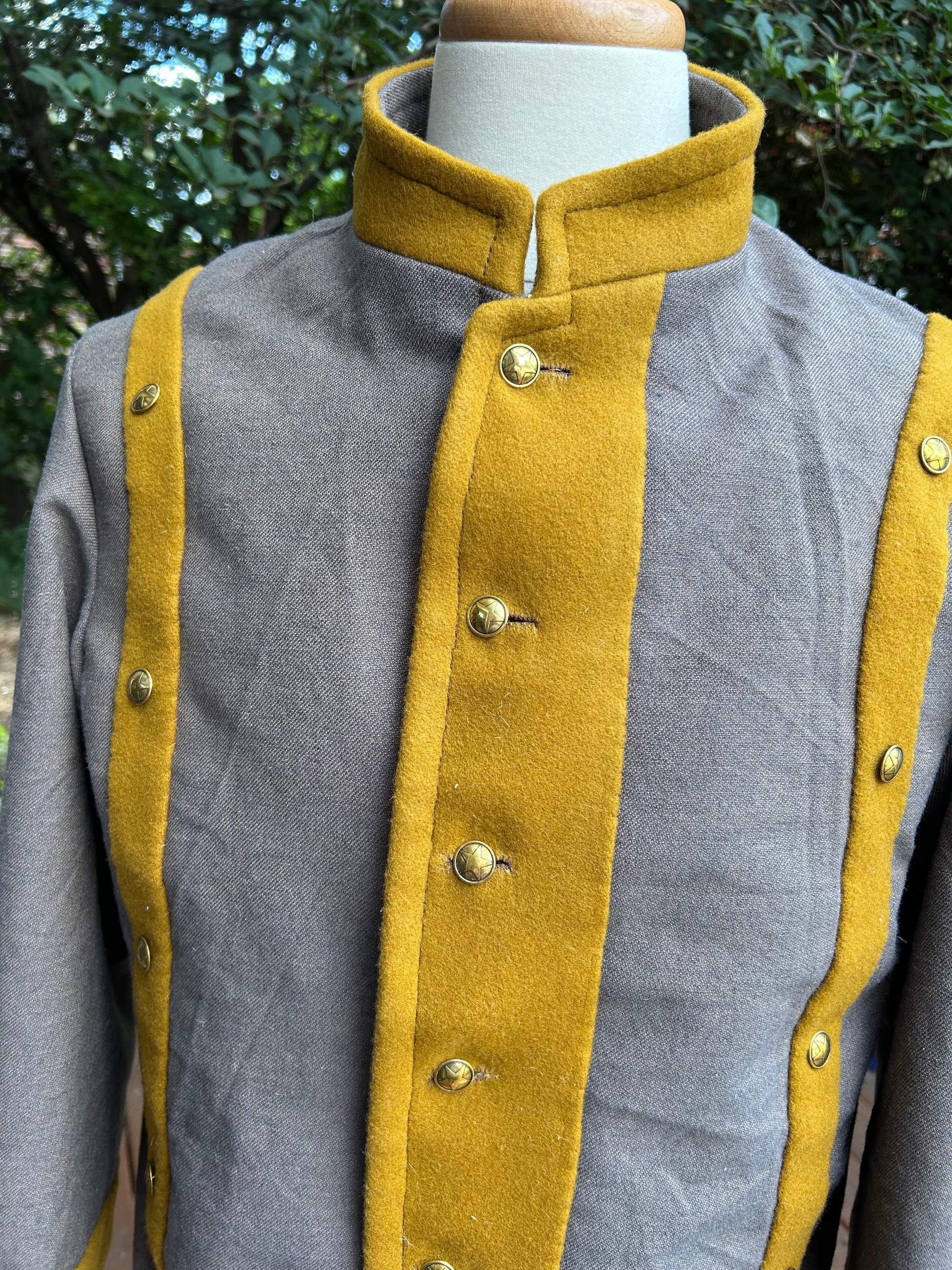 This jacket is based on the written description and images from the 10th Texas Cavalry. These jackets are tunic length, trimmed in rows of yellow and made from a grey jean cloth. The period images of these jackets shows some variation in the exact trim pattern and button count, with these minor variations available.