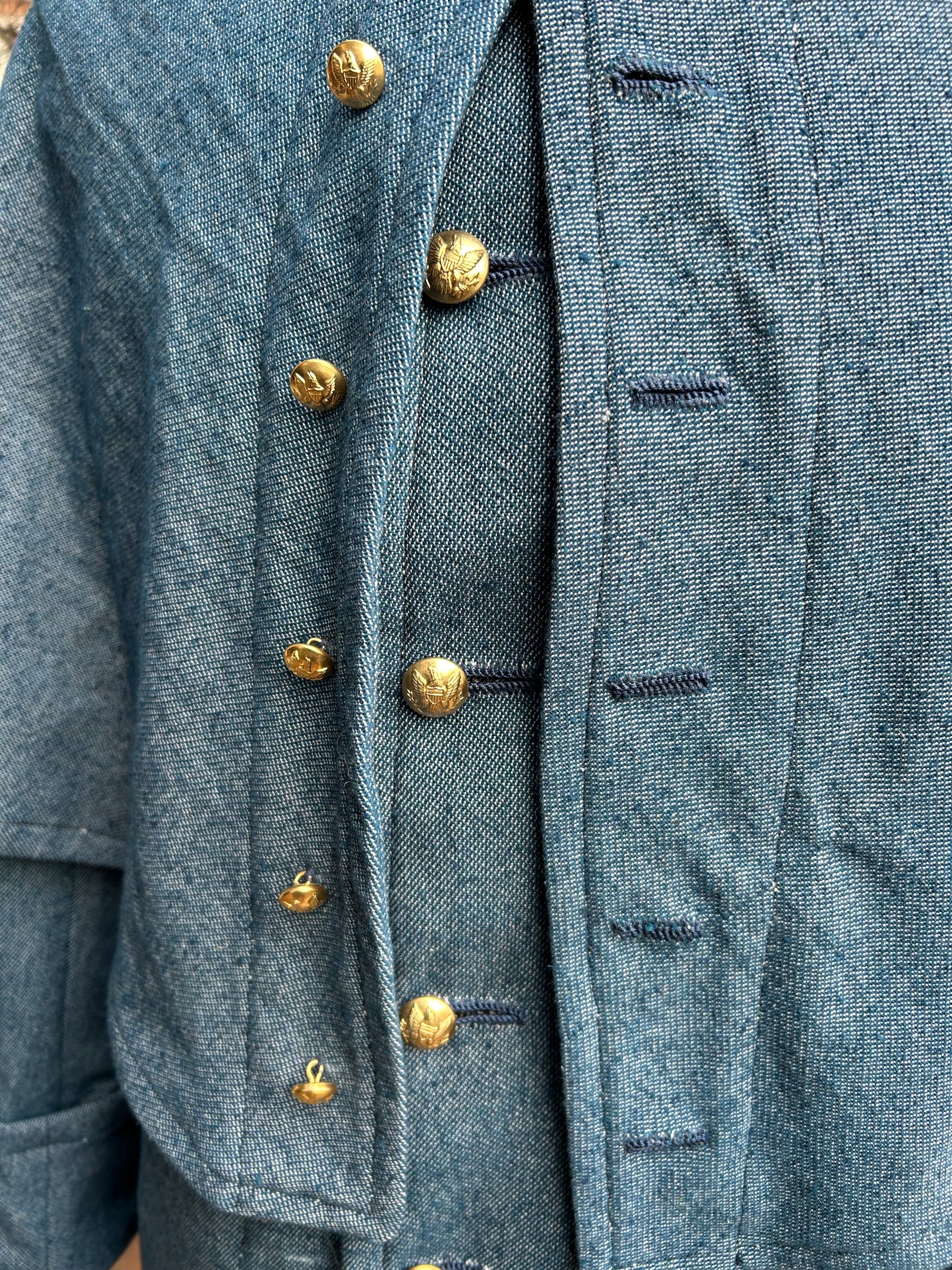 Based on a surviving example linked to a private in the 42nd Massachusetts Infantry, the coat is made from sky blue jean cloth. Given the nature of the cloth, the construction of the coat is significantly different than the kesery counterparts. All seams are machine felled, with the bottom edge being finished. The coat is lined in wool flannel and closed with the regulation M1851 General Service Buttons.