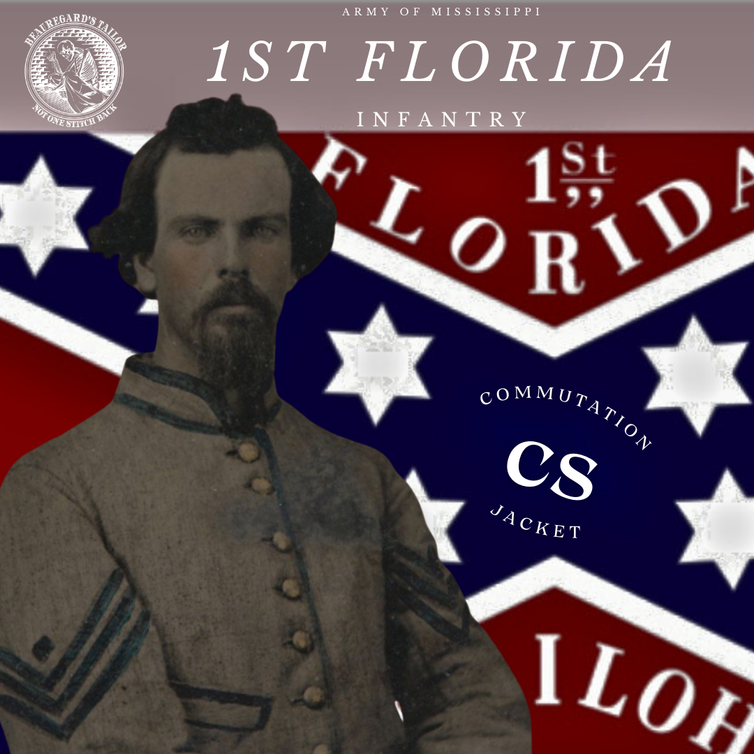 This example is from the 1st Florida Infantry and includes trimmed collar, trimmed front, and trimmed outside pocket. The jacket is made from gray wool jean and trimmed in sky blue.