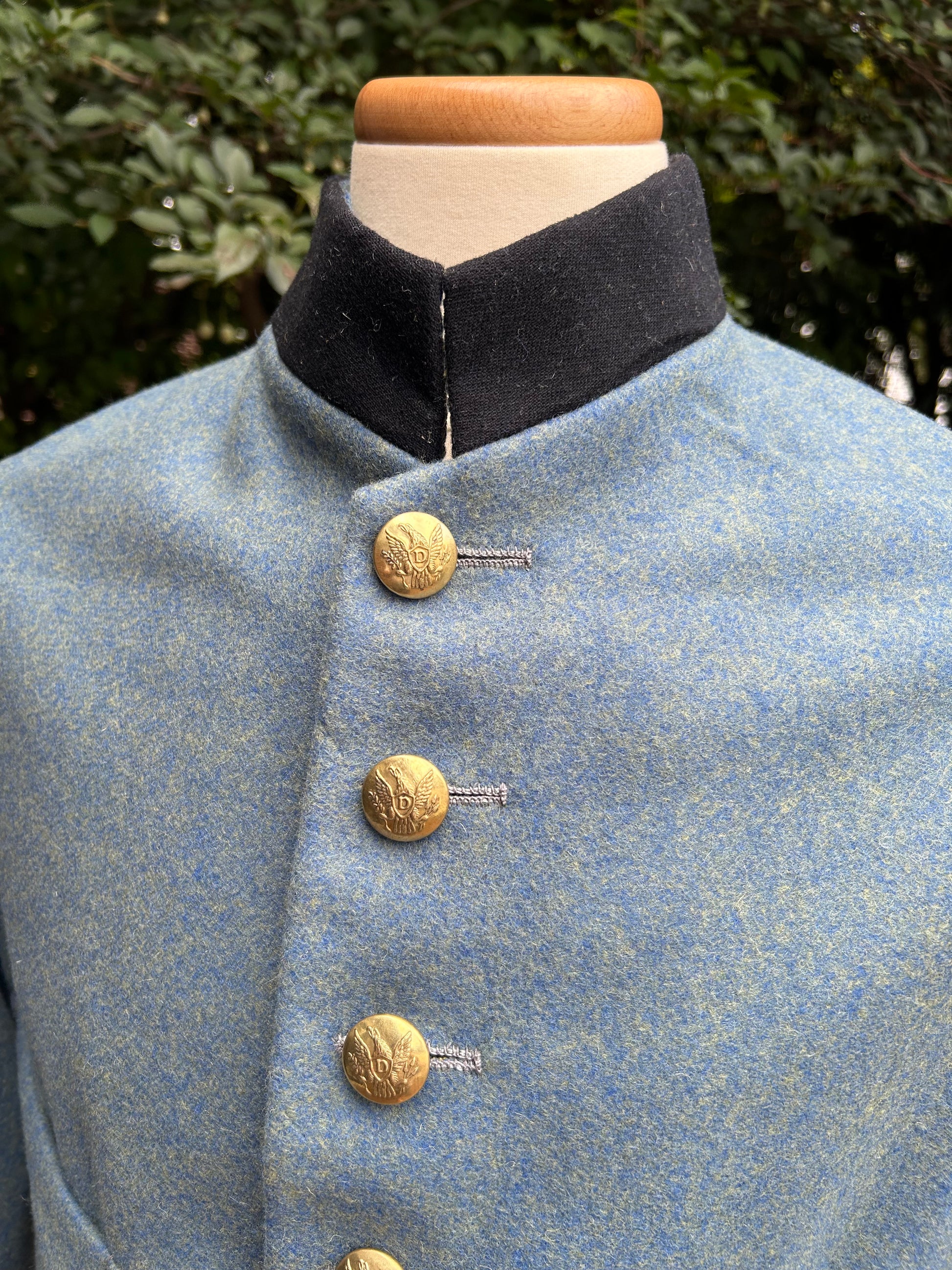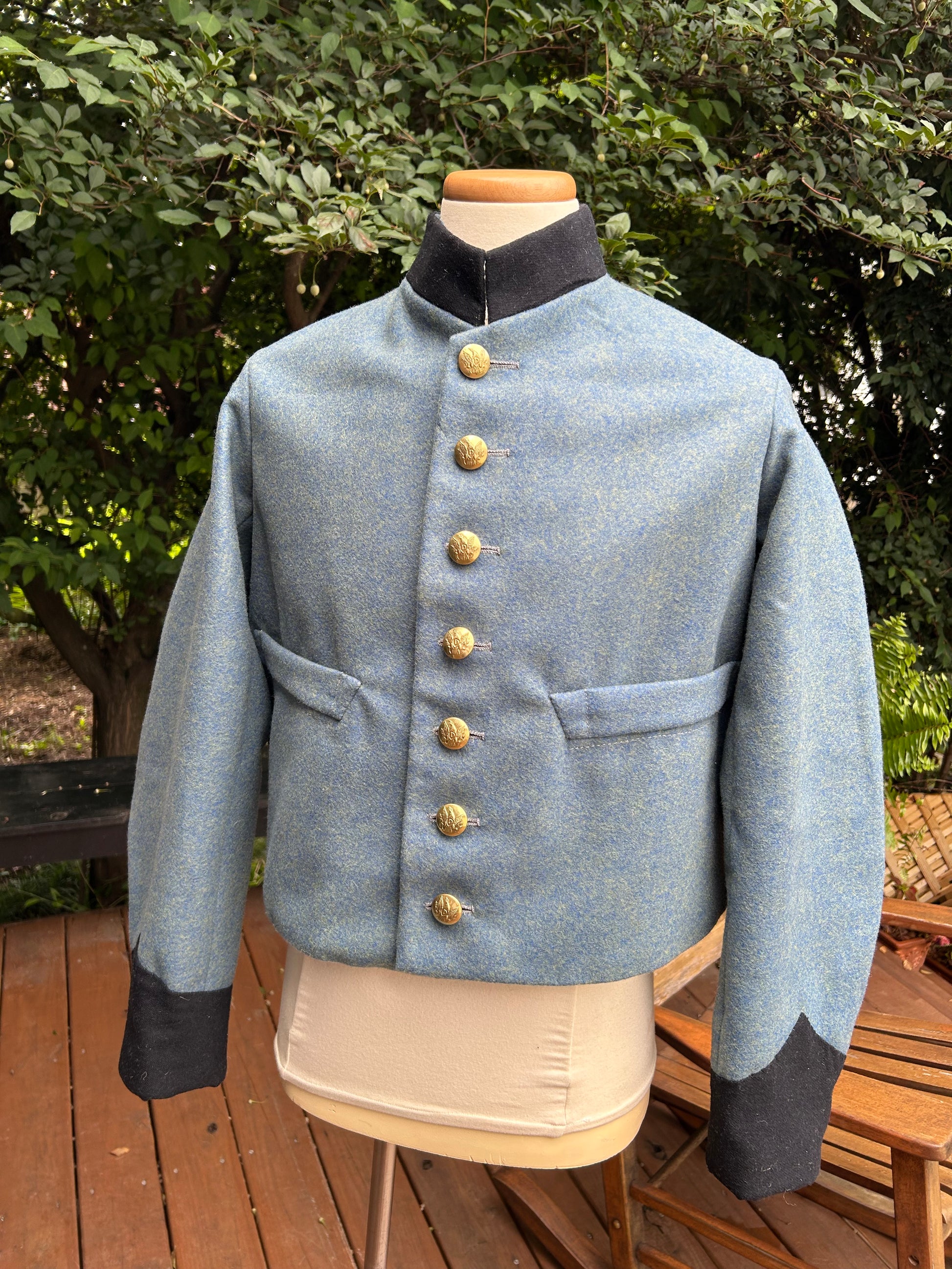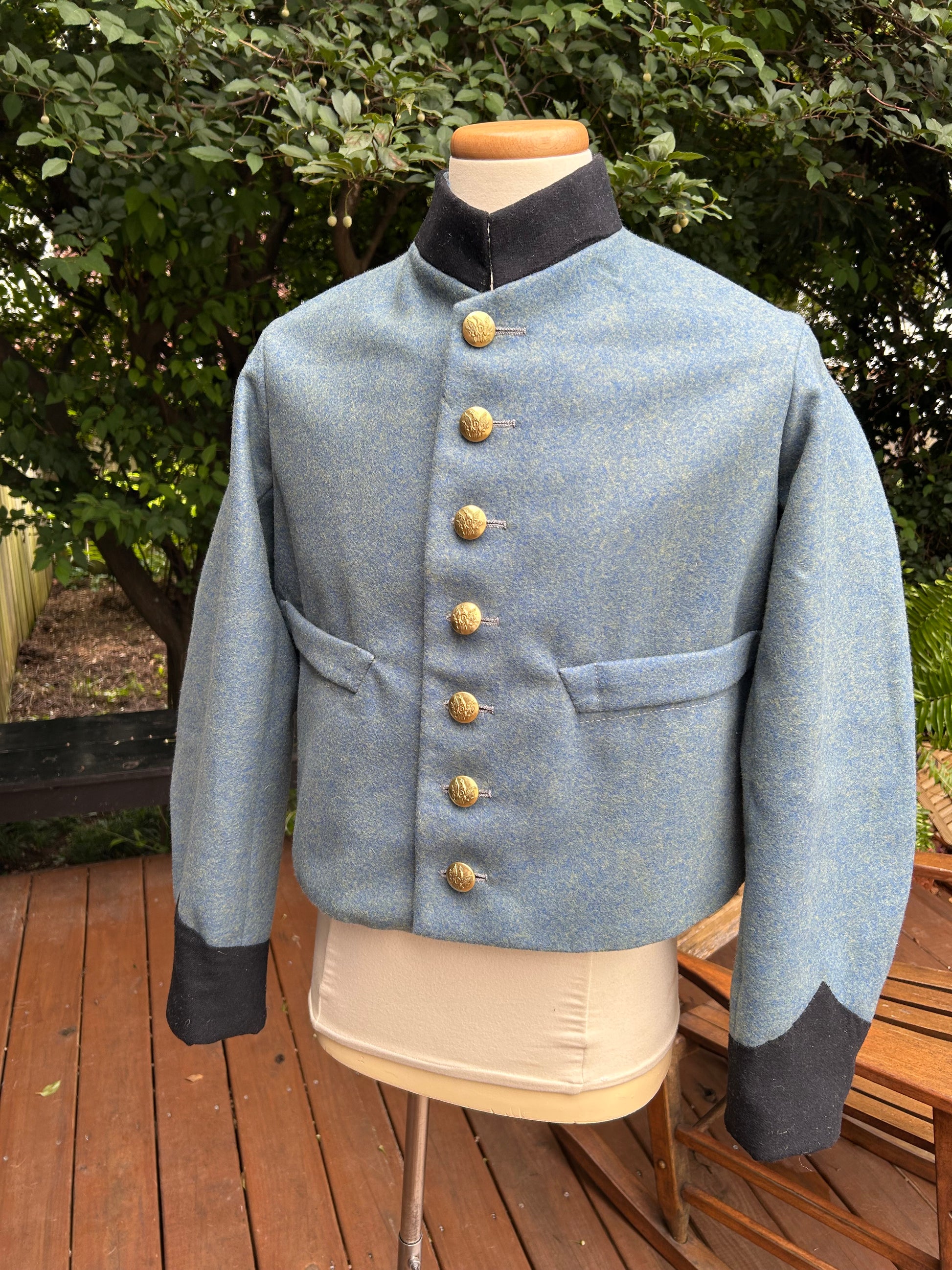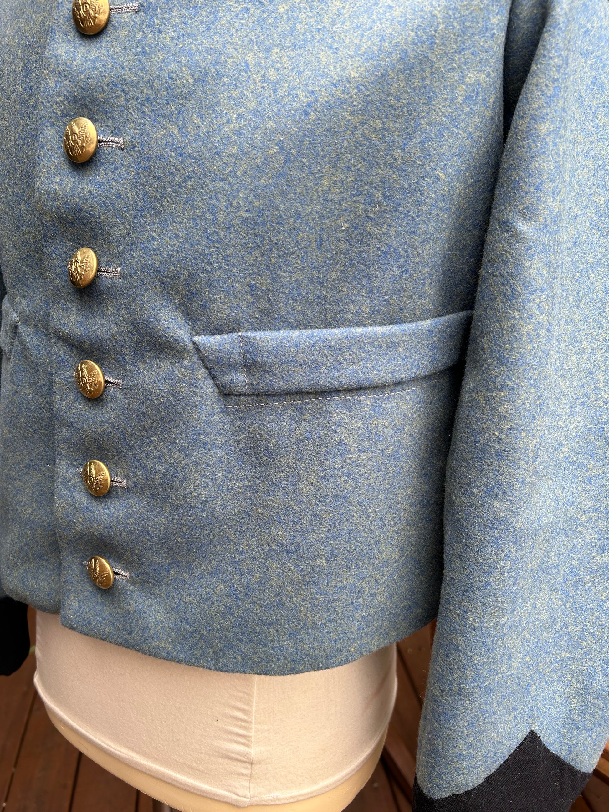 This Commutation System jacket is based on a surviving period photo from the 16th Mississippi - a similar example has also survived from the 24th Tennessee. The jacket has two exterior chest pockets, trimmed on the cuffs and collar in black, and closed with seven buttons.