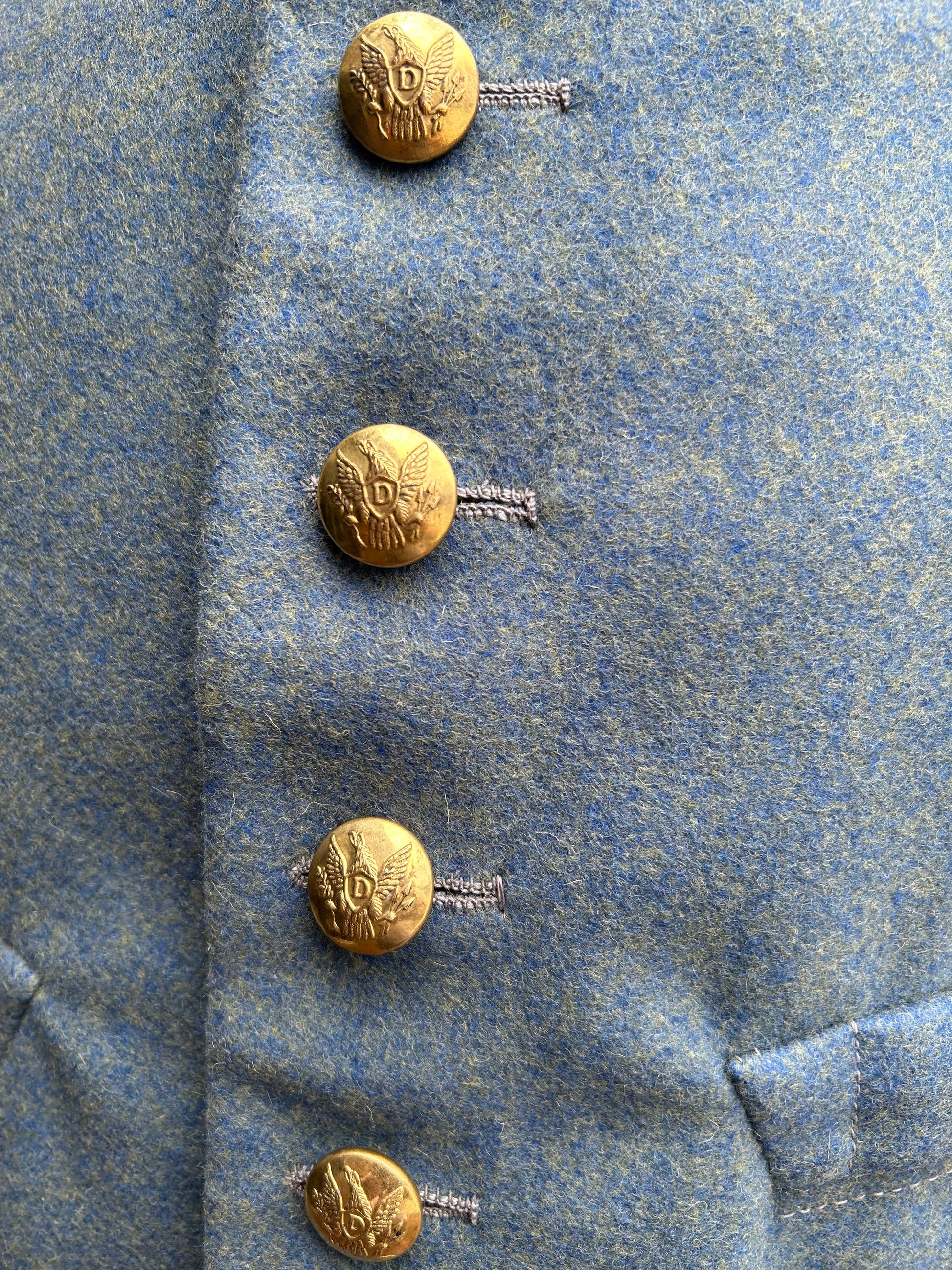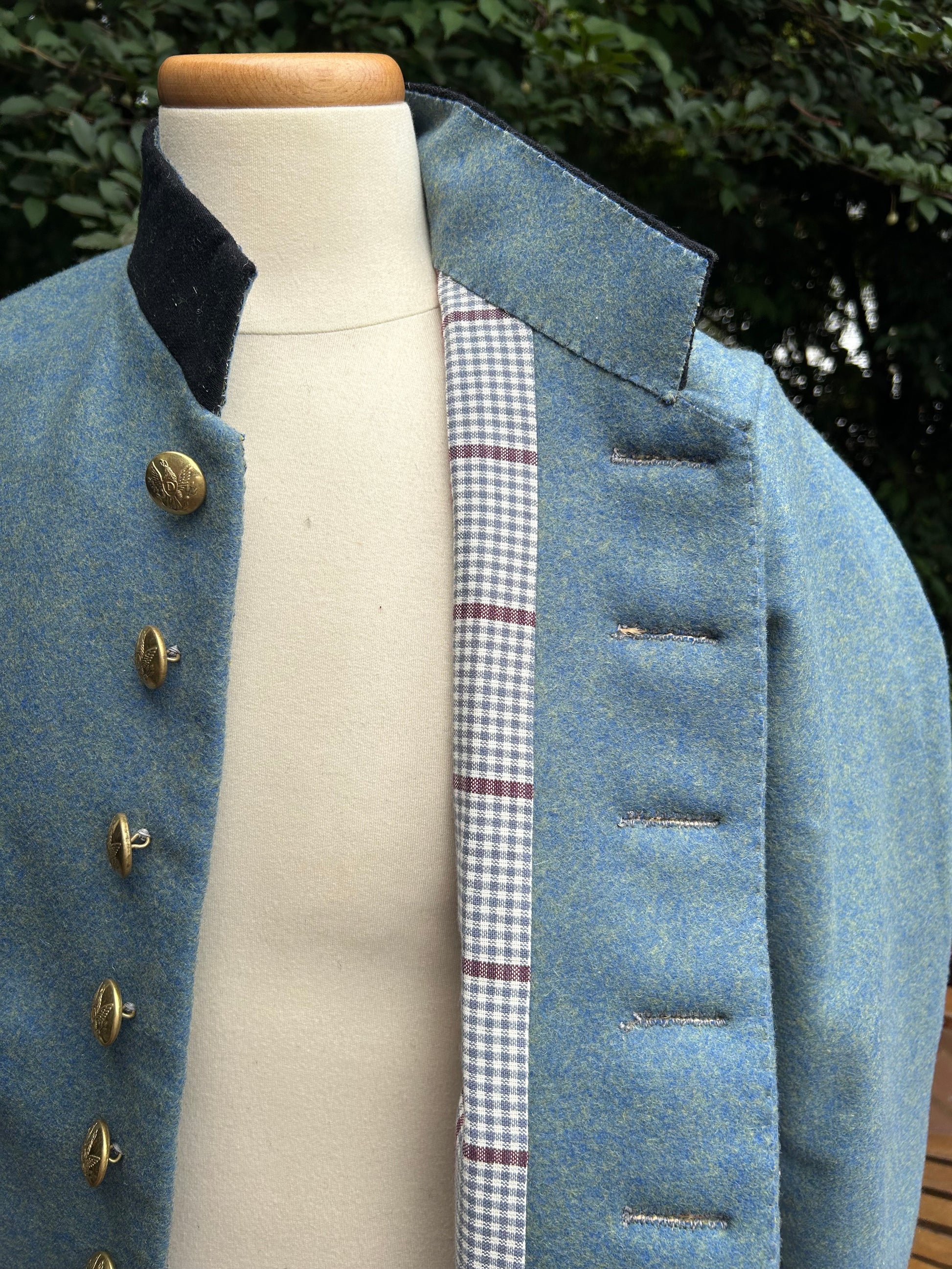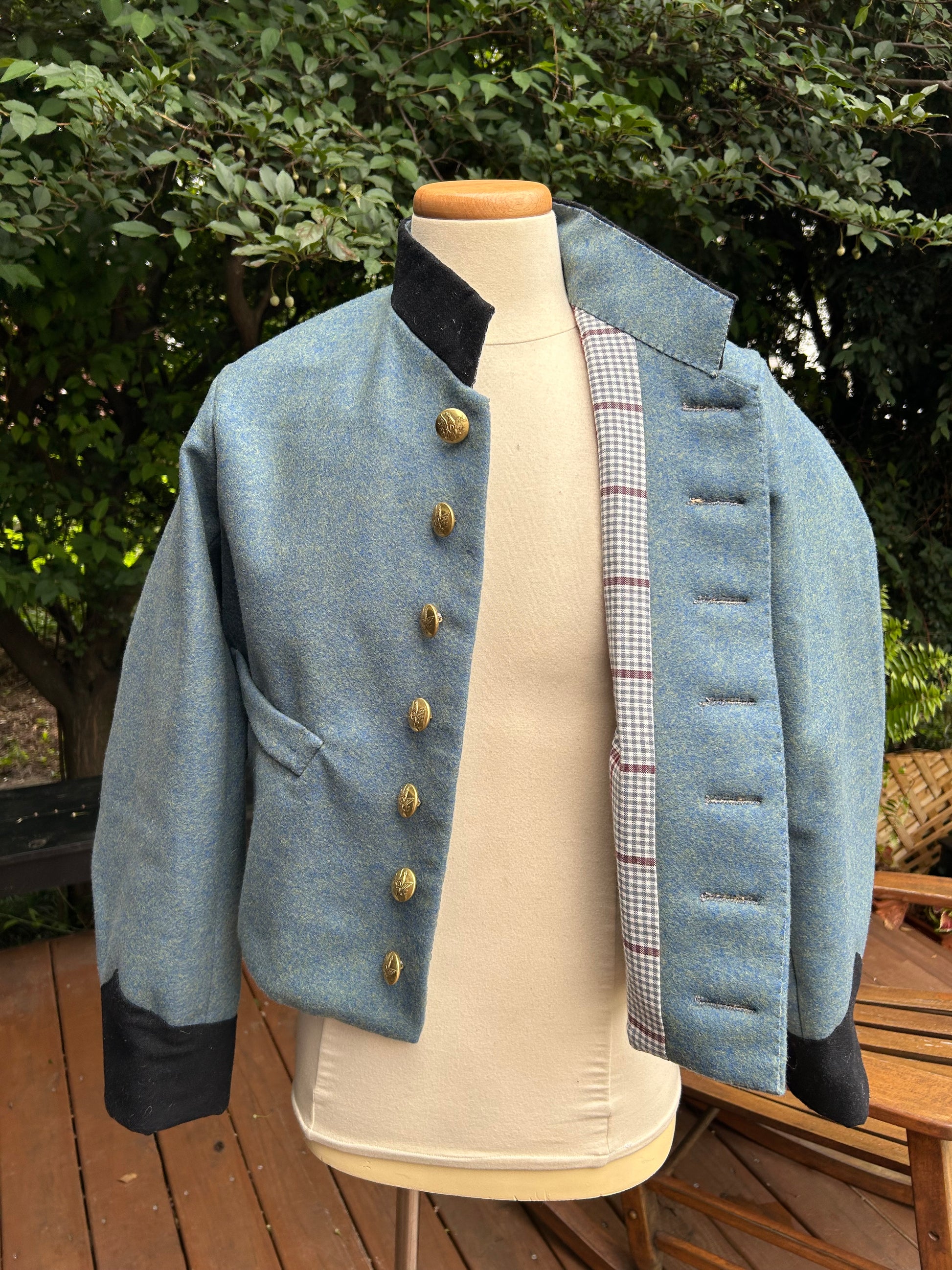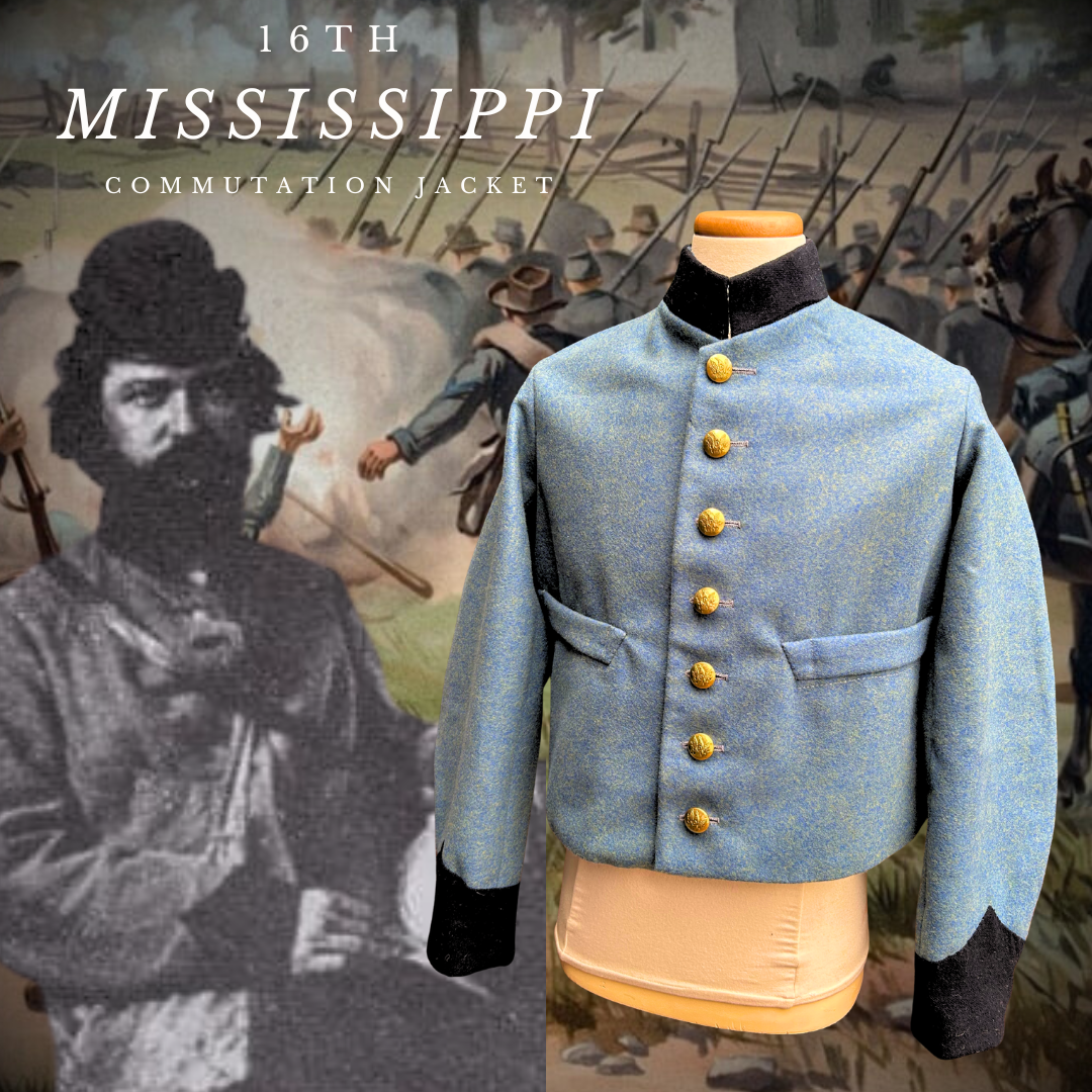 This Commutation System jacket is based on a surviving period photo from the 16th Mississippi - a similar example has also survived from the 24th Tennessee. The jacket has two exterior chest pockets, trimmed on the cuffs and collar in black, and closed with seven buttons.