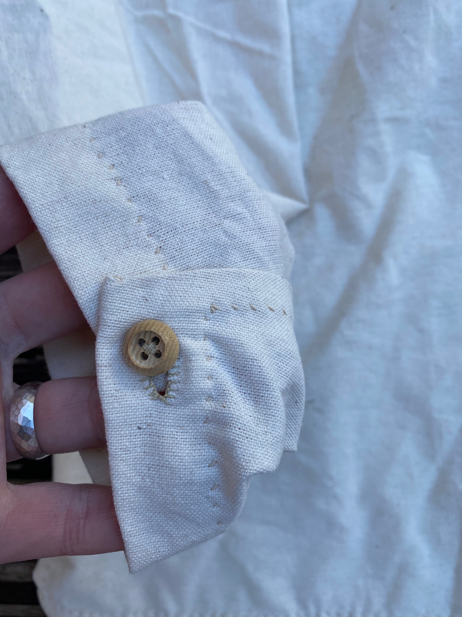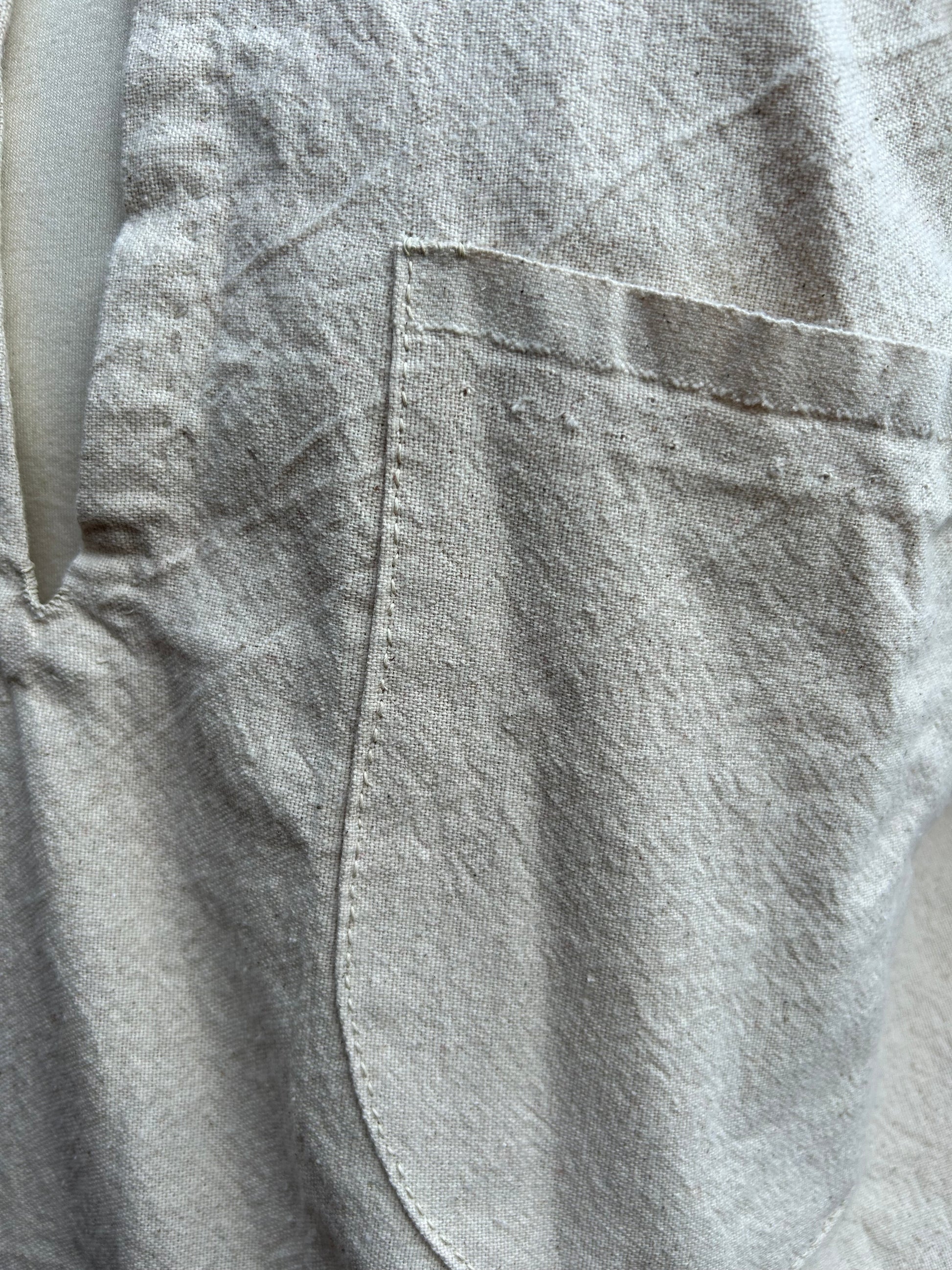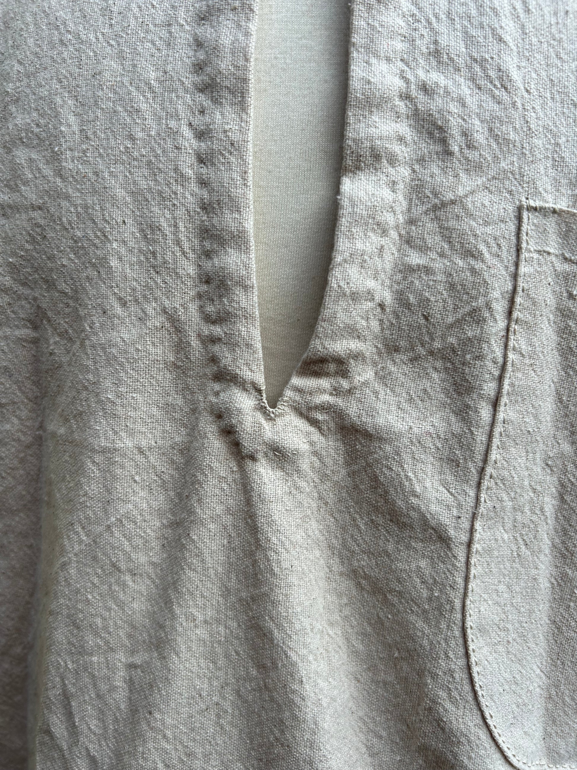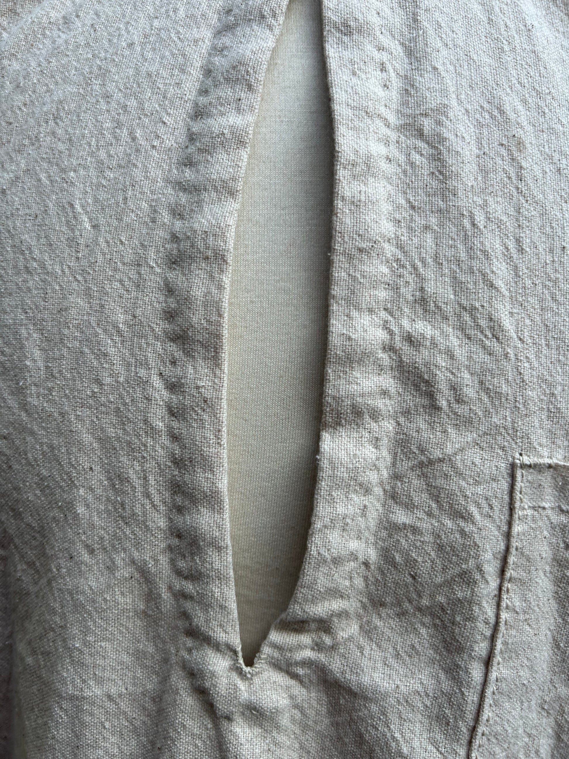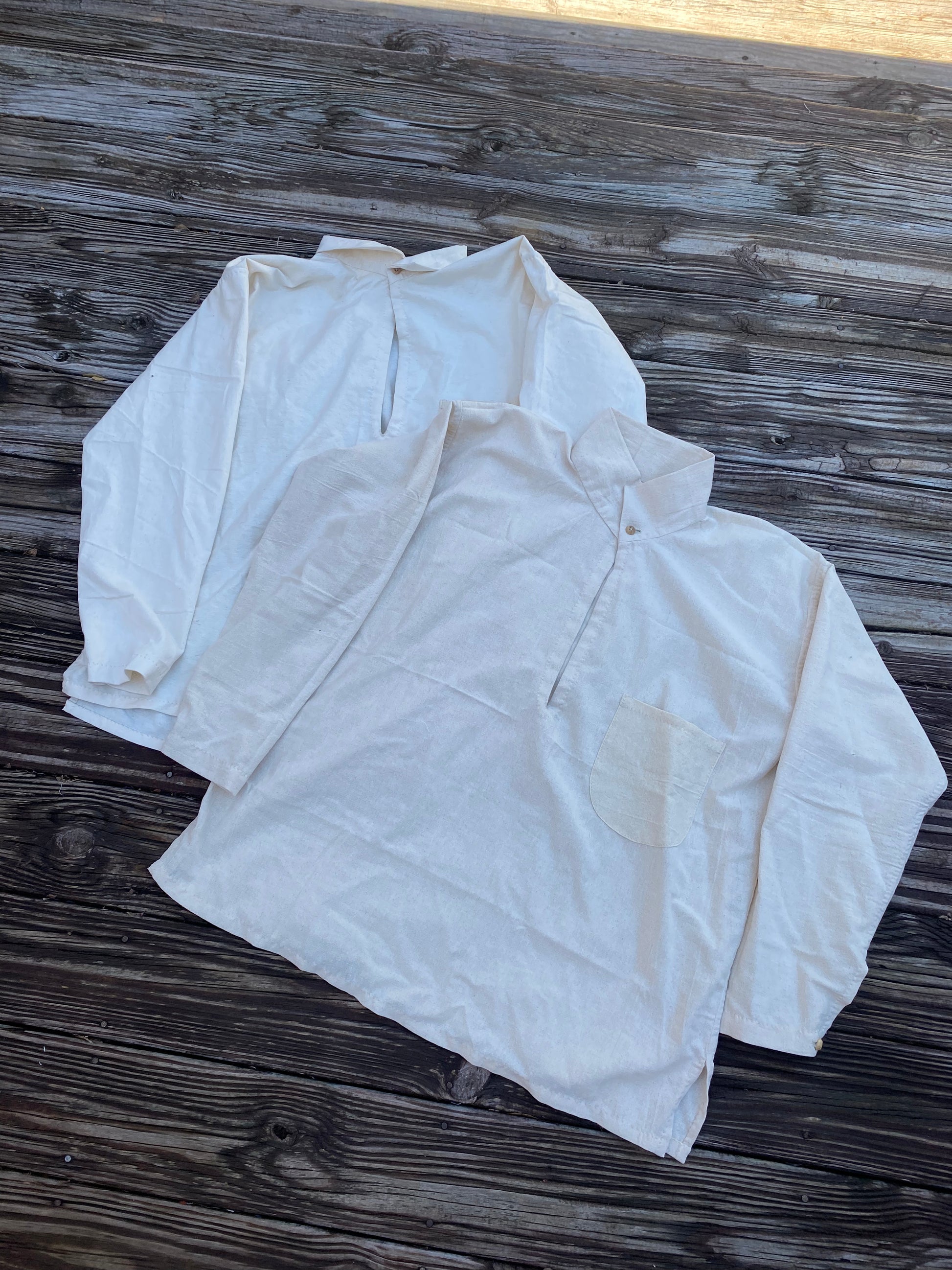 Based on a shirt worn by a member of the 39th Mississippi, the shirt is indicative of the style of issue shirt worn by Southern forces during the war. The shirt is made from cotton osanburg or wool flannel, vented placket, and one outside pocket. The shirt is not dissimilar to that of the Federal issue shirt in general patterning concept, although simplified. It is also very similar to another example worn by a captured Southerner at Gettysburg - offered here.
