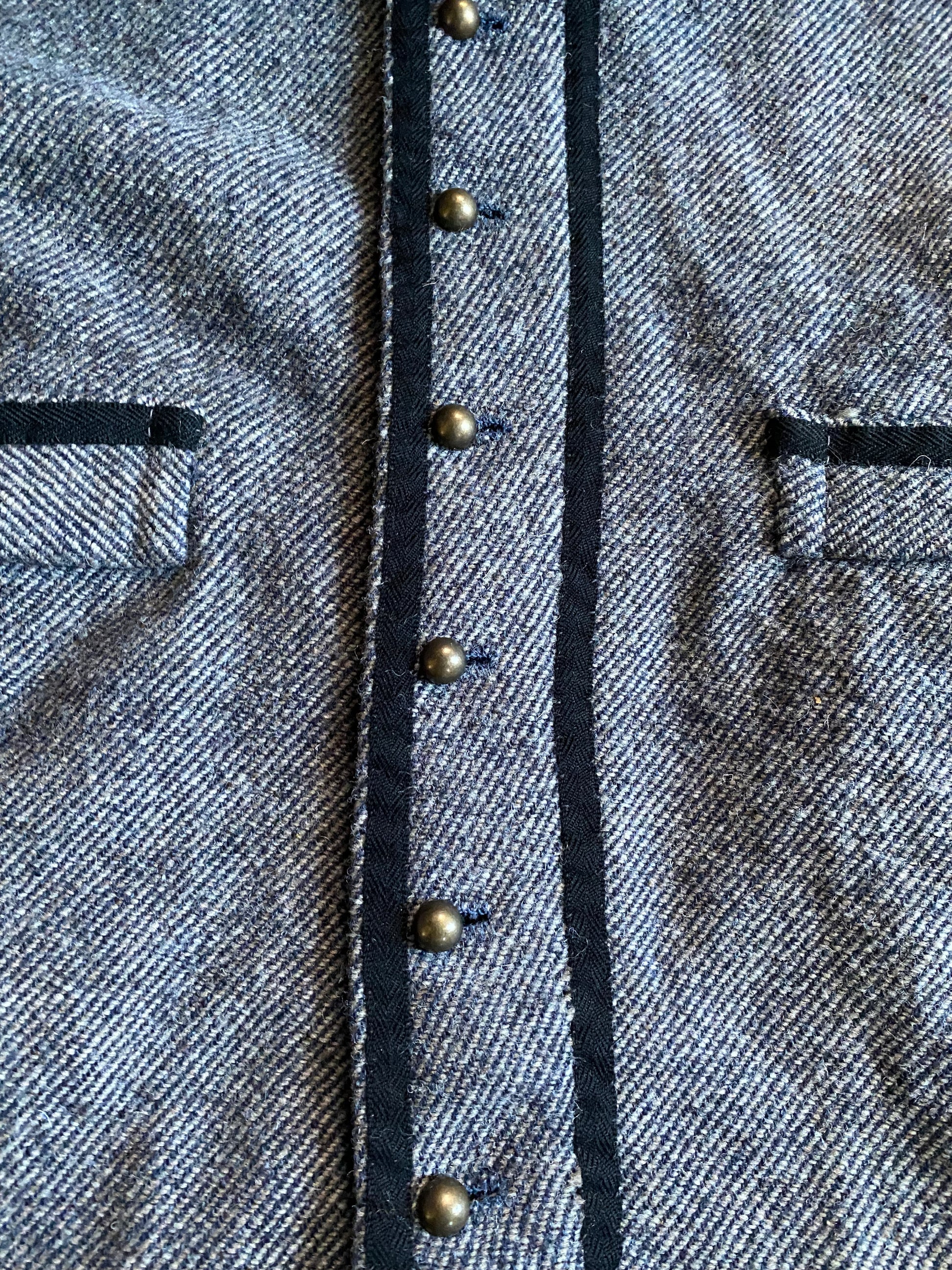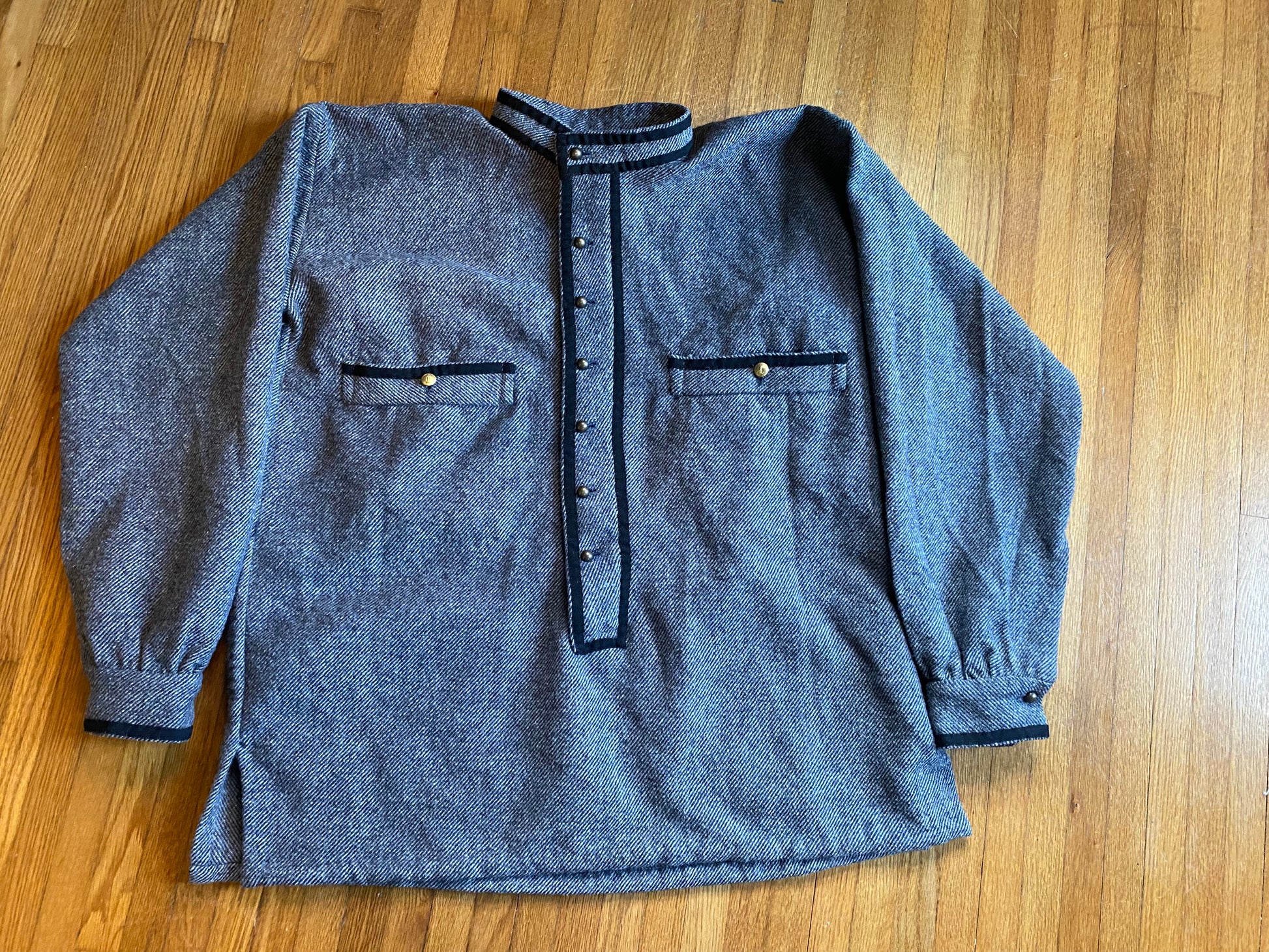 Southern overshirt based on those worn by the 4th Virginia in 1861. The shirt is made from grey wool, trimmed in black worsted wool tape, and closed with brass buttons. The shirt has a banned collar and two outside pockets and partially lined.