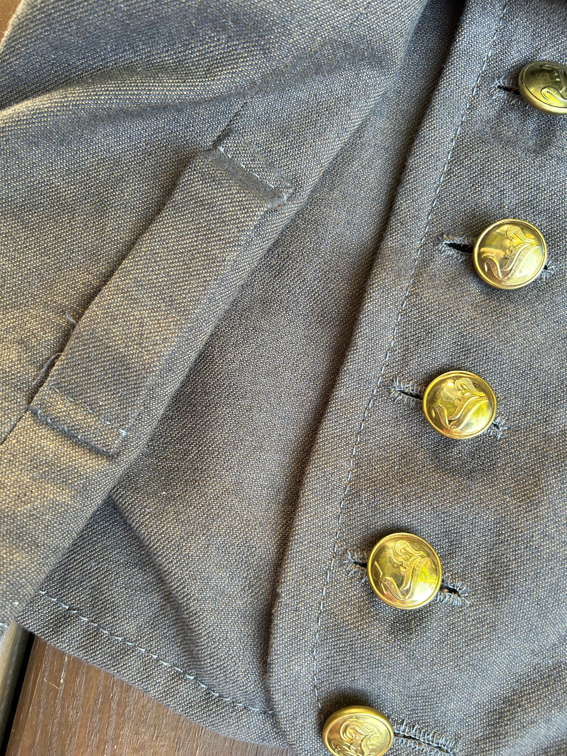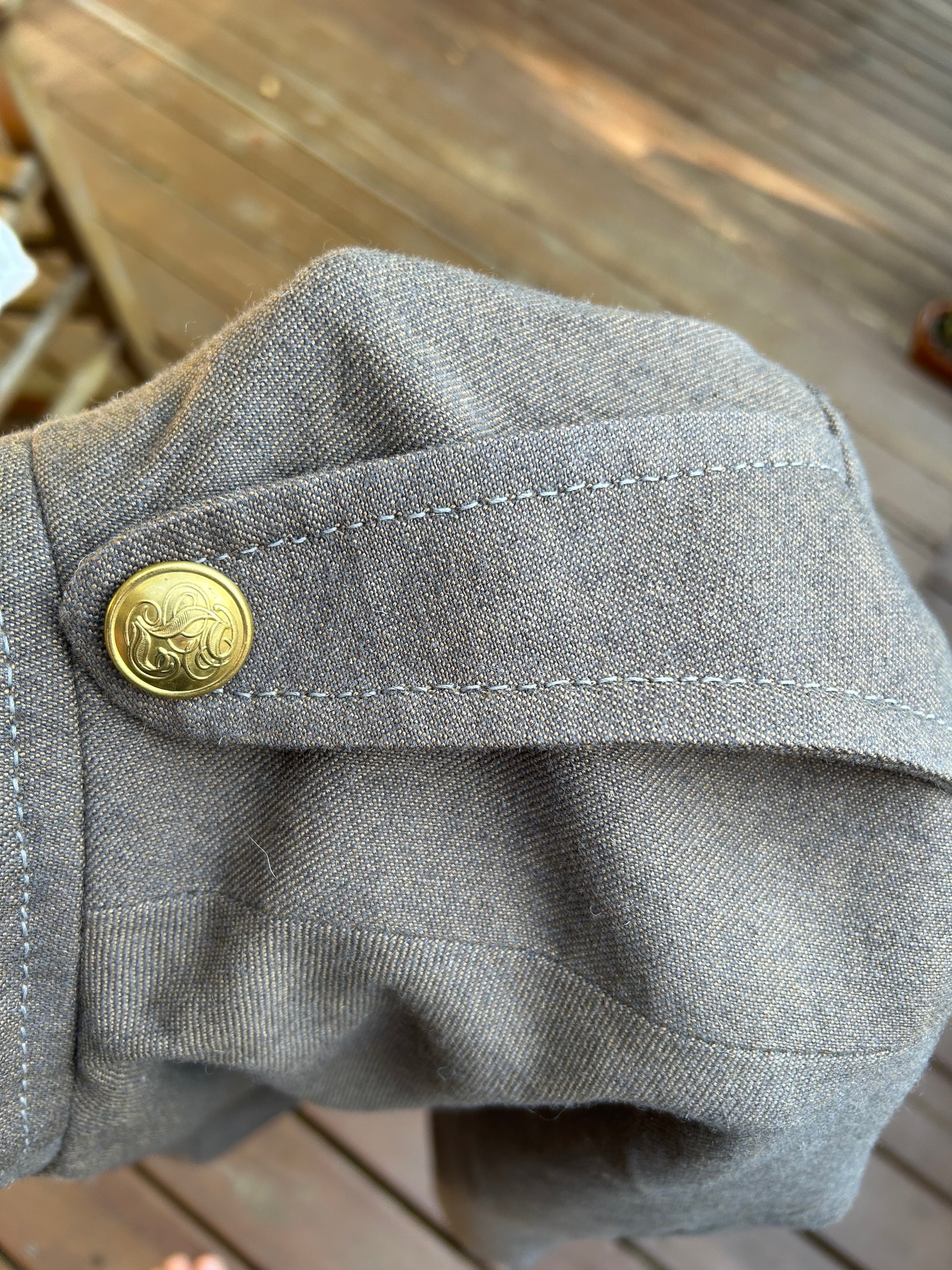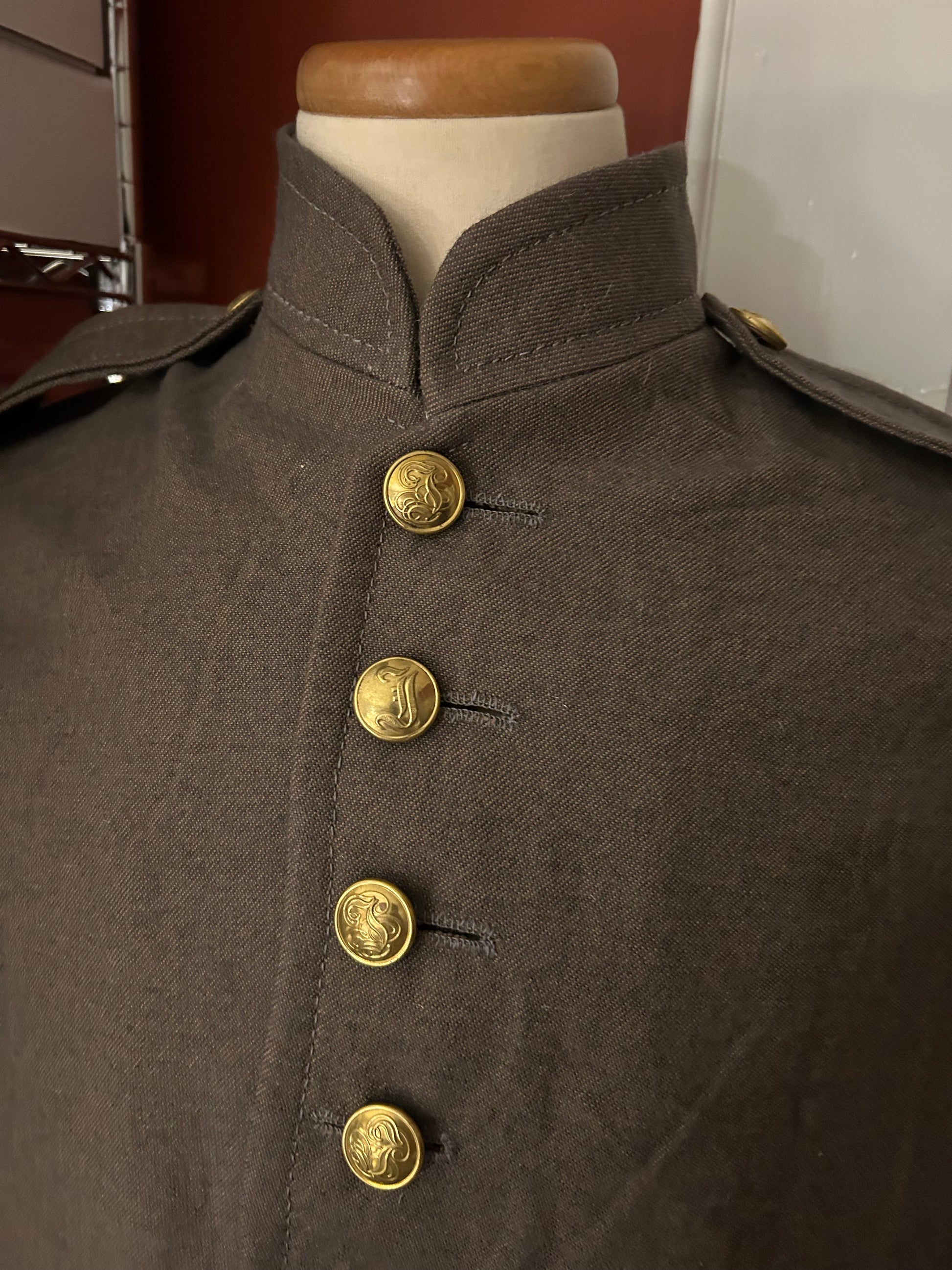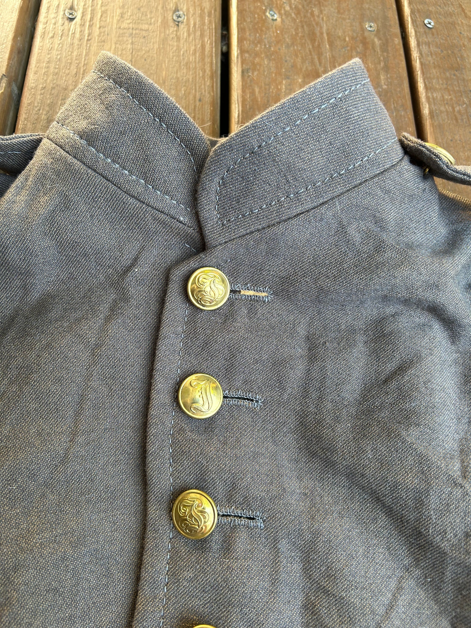 This reproduction jacket is based on an example worn by a member of the 5ht South Carolina Infantry and is believed to have been issued in the summer of 1863. The body of the jacket is made from a grey on natural jean cloth and lined in cotton osanburg.