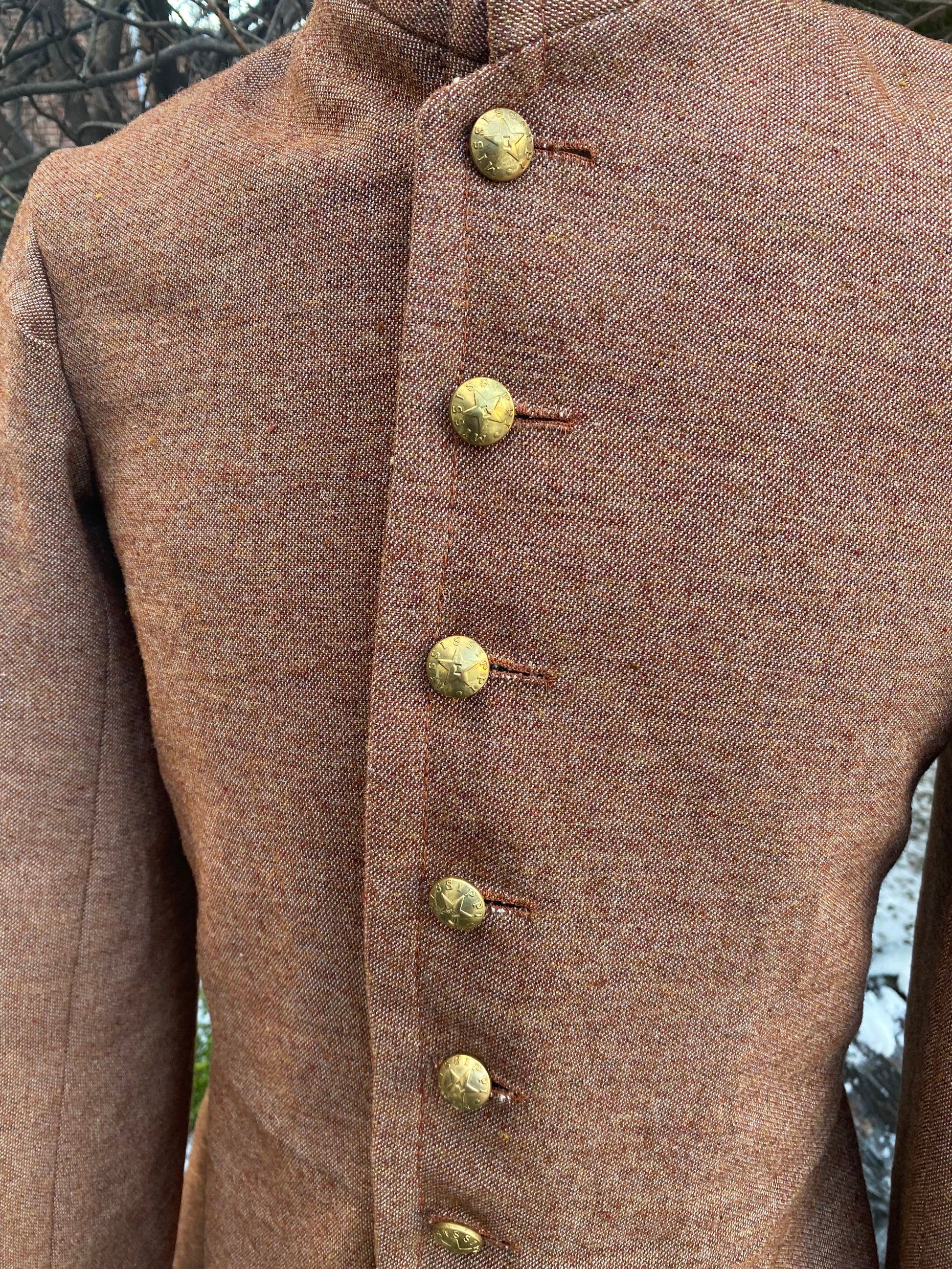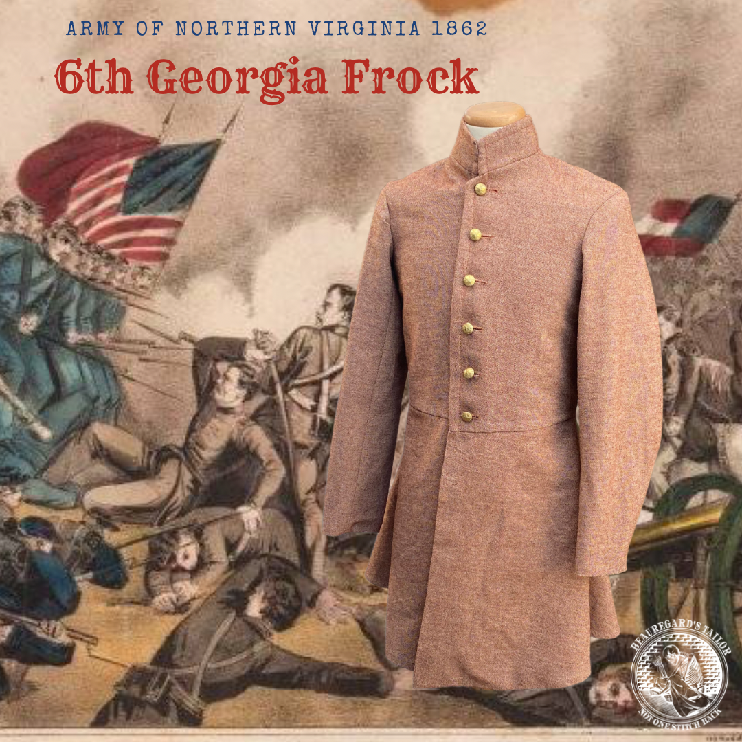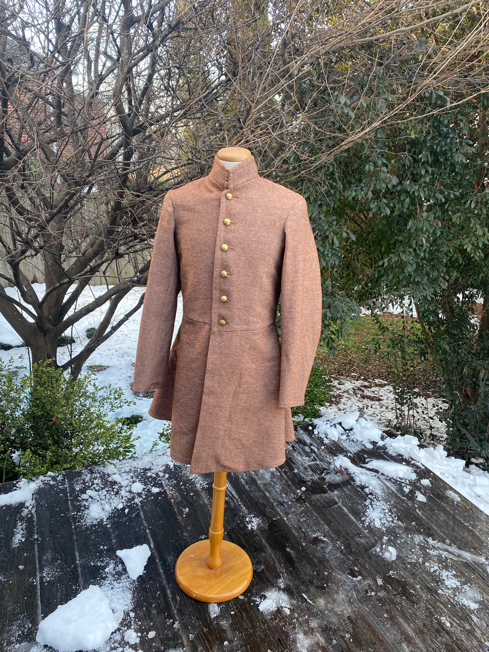 Confederate frock coat based on a surviving example linked to the 6th Georgia Infantry in 1862. While the coat is linked to the Army of Northern Virginia, the style of coat is reasonably generic across all Confederate armies from 1861-1865.