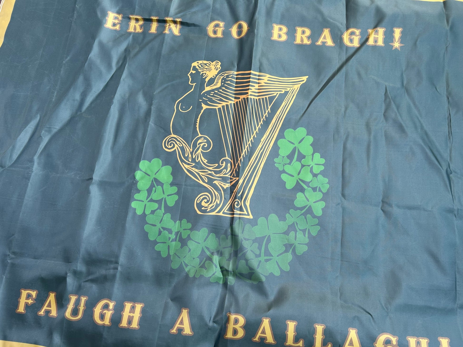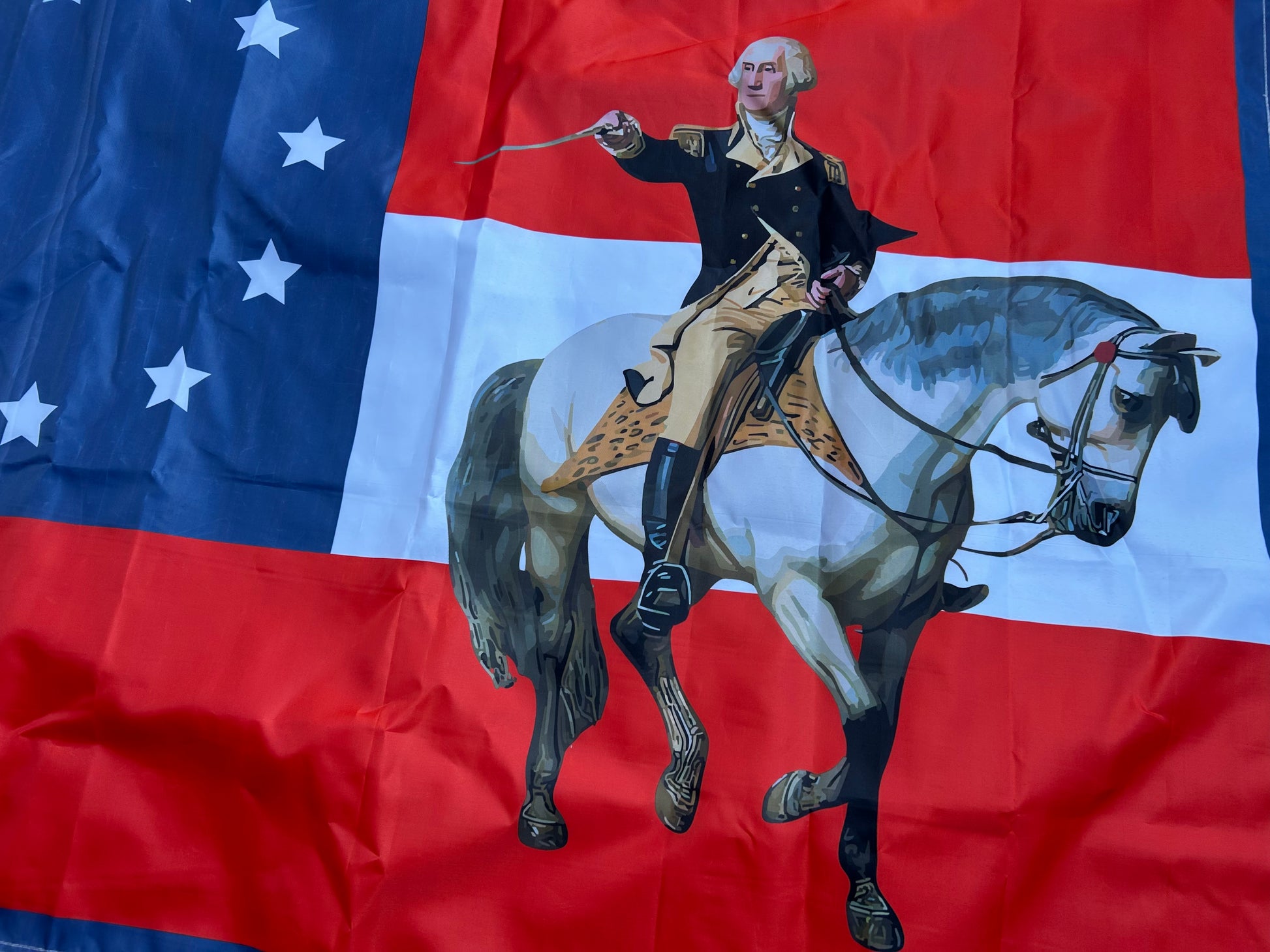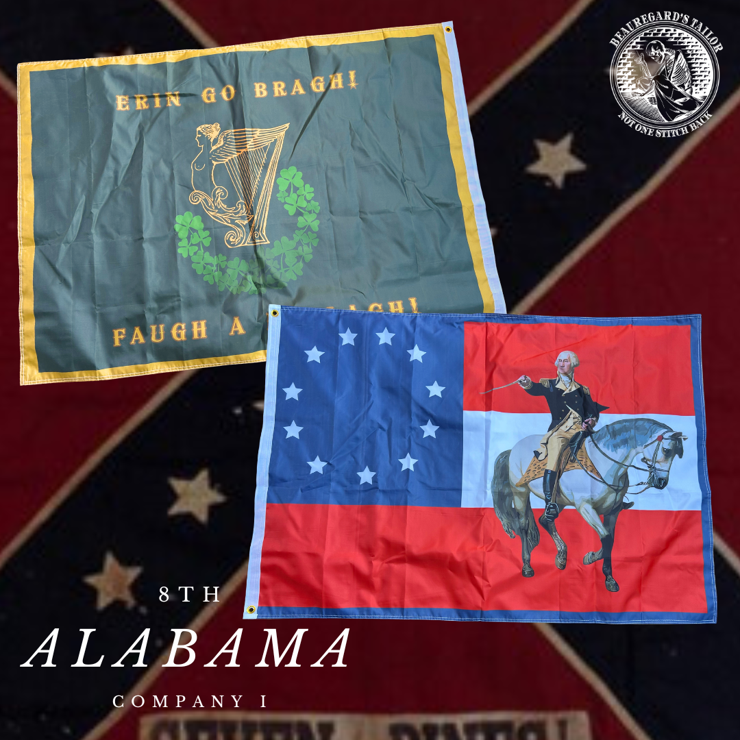 These are modern all-weather nylon flags for your house or garden based on the original flag carried by Company I - Emerald Guards - 8th Alabama. As per the original description, the flag had the Irish Green on the left face and a 1st National on the reverse. Its most unusual feature is a described full length standing Georgia Washington in the middle of the 1st National. This placement, while unusual today, is fairly common amongst Alabama flags with 1st National patterns with items of significance being placed in the center of the field.