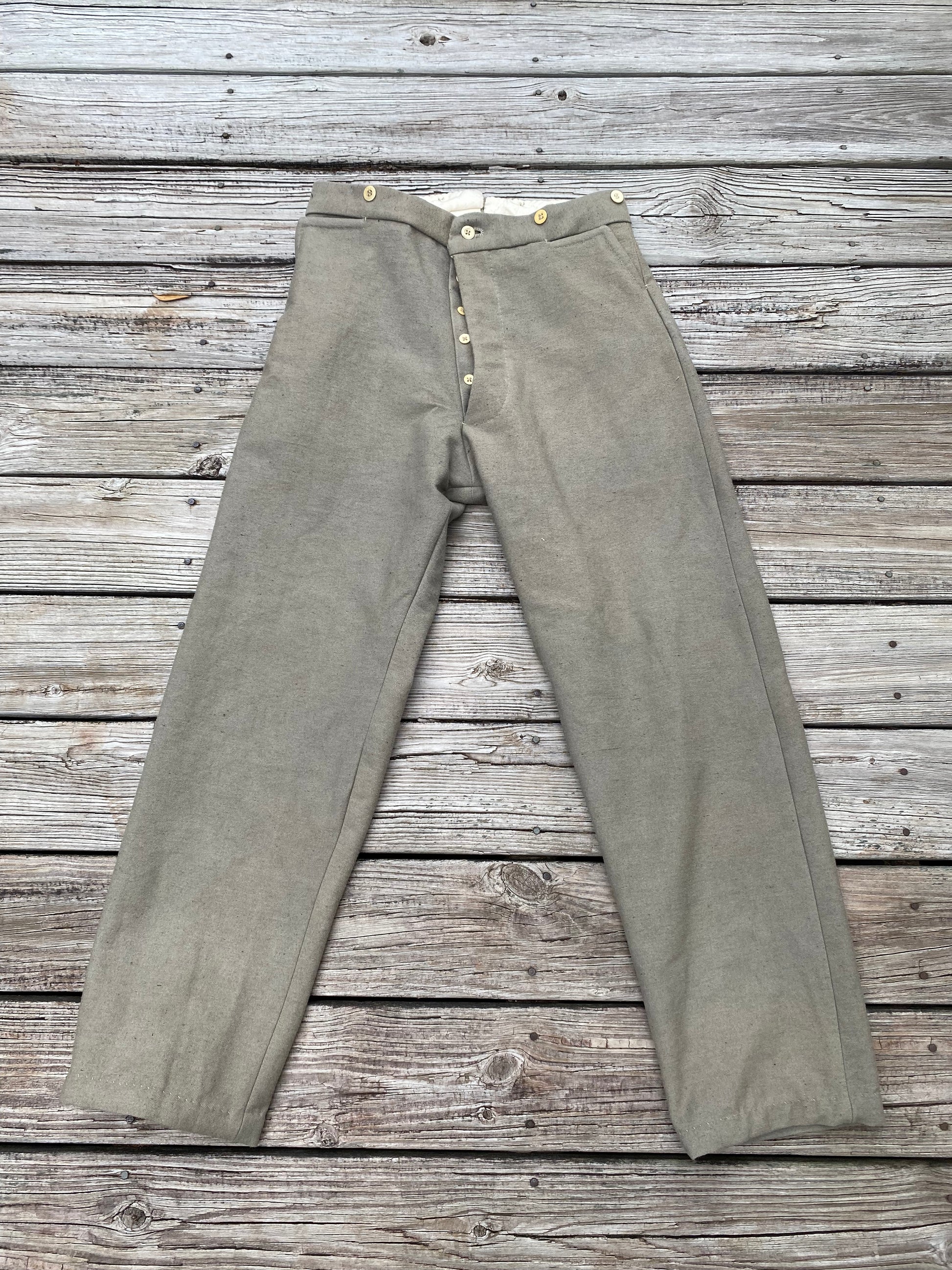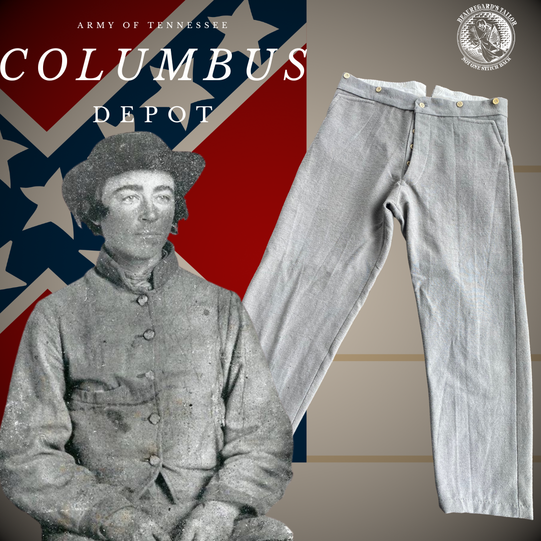 Based on a pair of trousers directly linked to the Army of Tennessee in the Atlanta Campaign, these trousers are believed to represent the product produced by Columbus or Atlanta, Georgia. While similar in cut to the more famed Richmond Clothing Bureau pattern, they deviate in details from that pattern. Most notably is the lack of pocket buttons and the inclusion of a watch pocket and back darts.