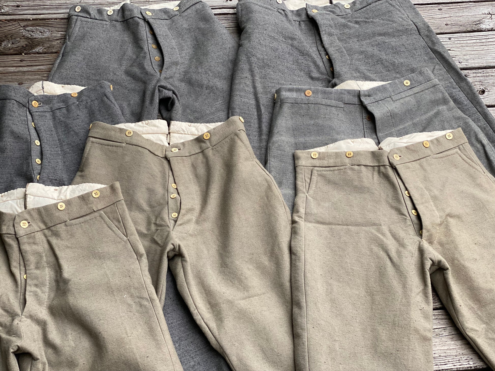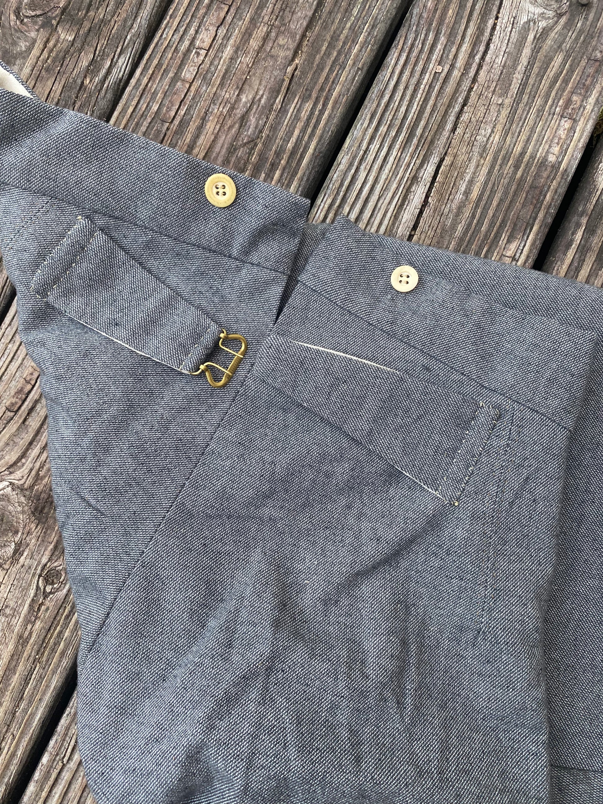 These trousers are made from grey on natural wool jean cloth (shade varies based on batch).