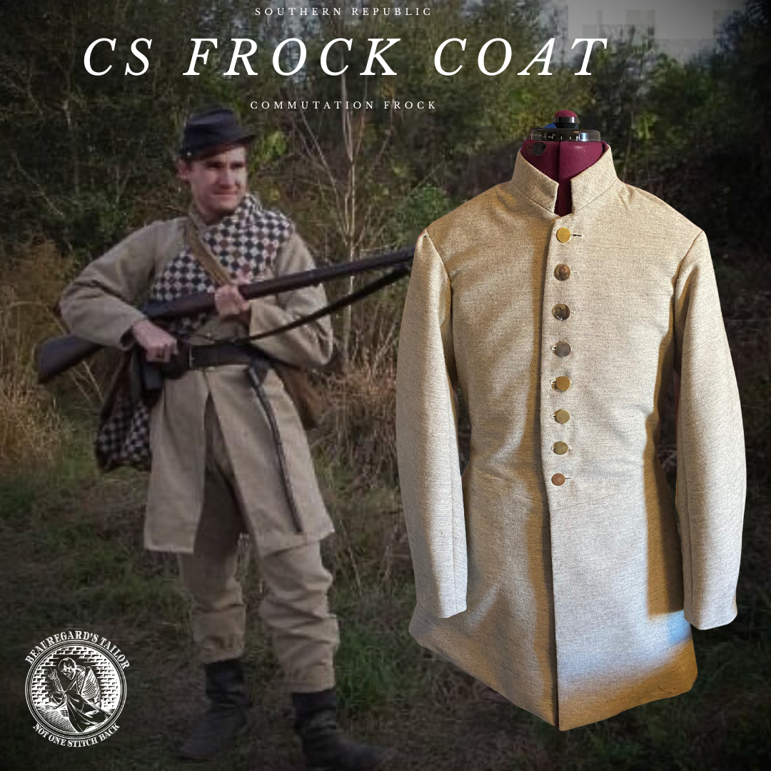 By far the most generic of Confederate garments, the untrimmed Confederate frock coat is seen from the opening months of 1861 to the trenches of Petersburg. While not an official staple of the Southern depot system, the privately acquired frocks (both through the Commutation System and direct means) were seen amongst all of the armies of the Confederacy.