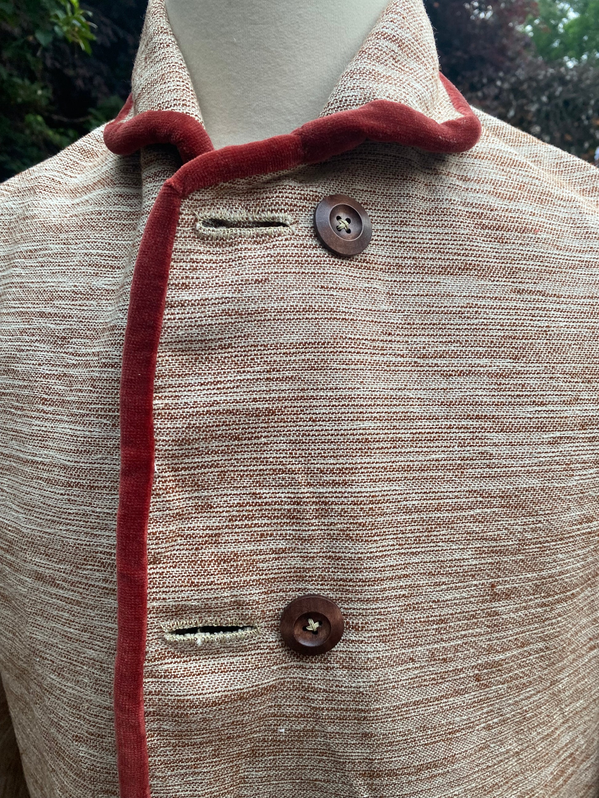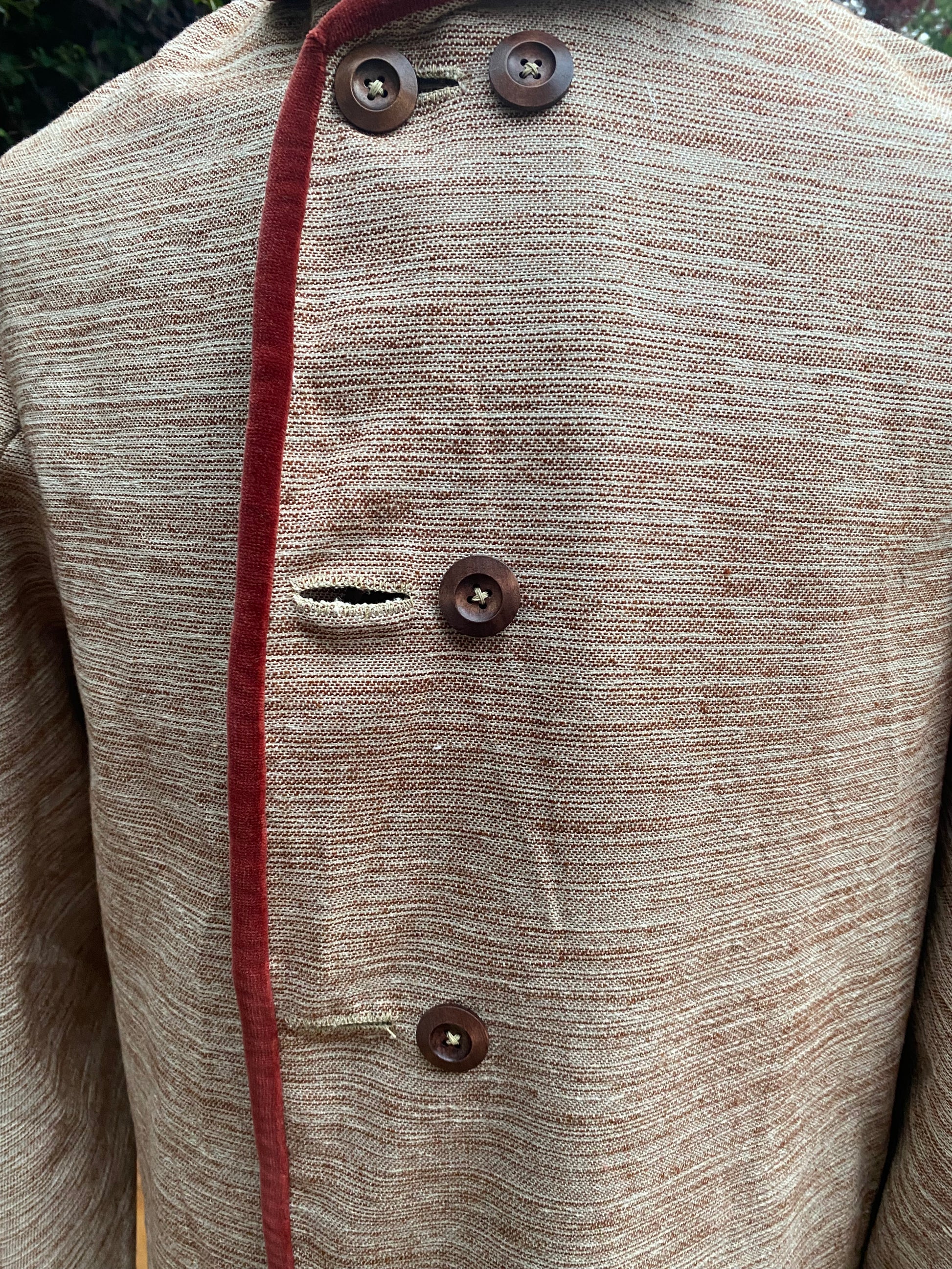 This exampled is based on a trimmed jean cloth sack coat. Per the example, the coat has a bound trimmed edge, closed with large (slightly offset buttons), and fall collar.