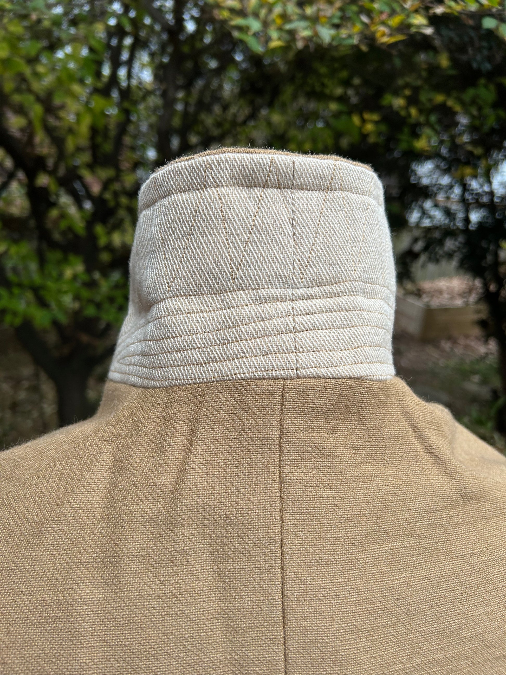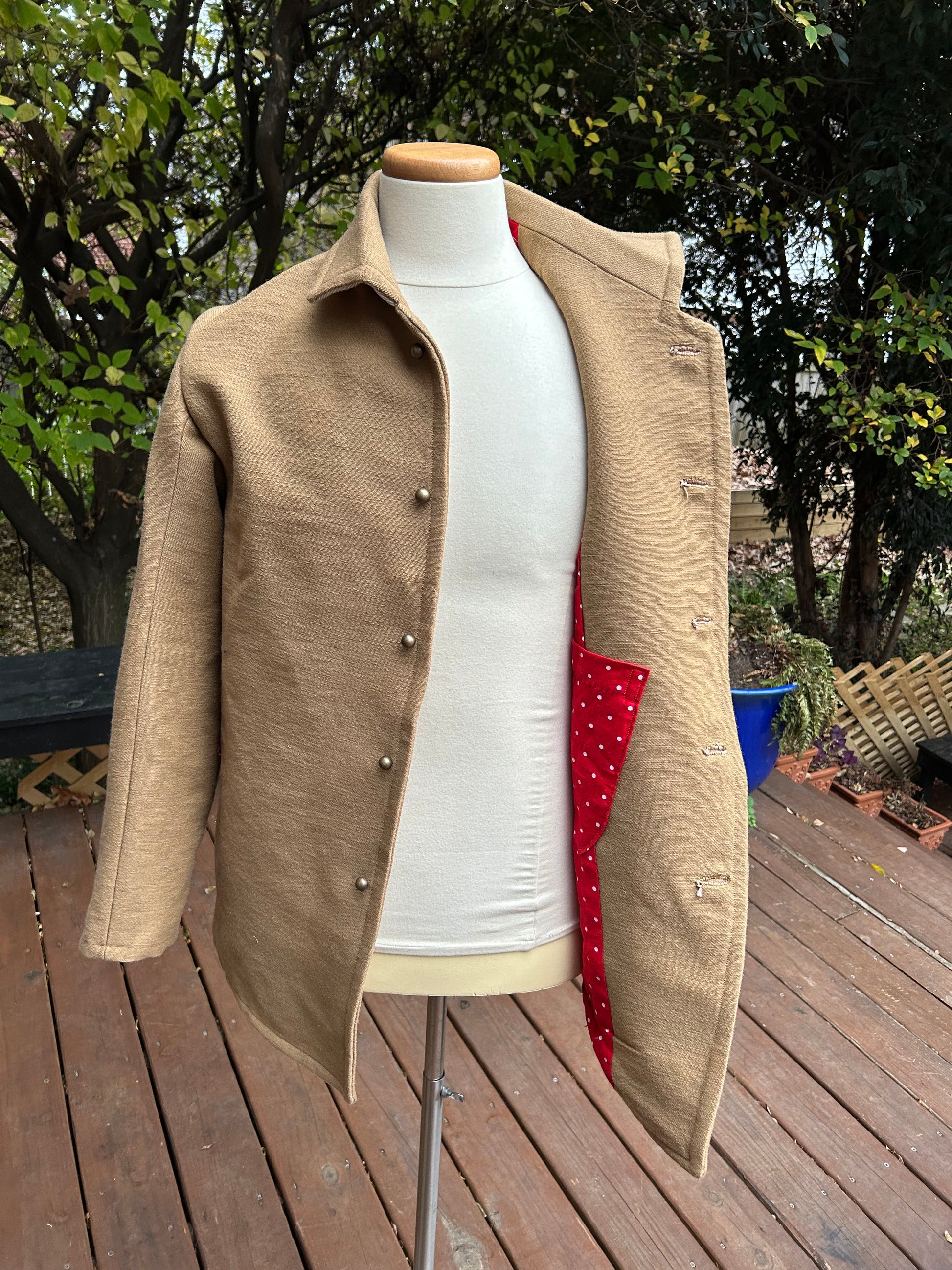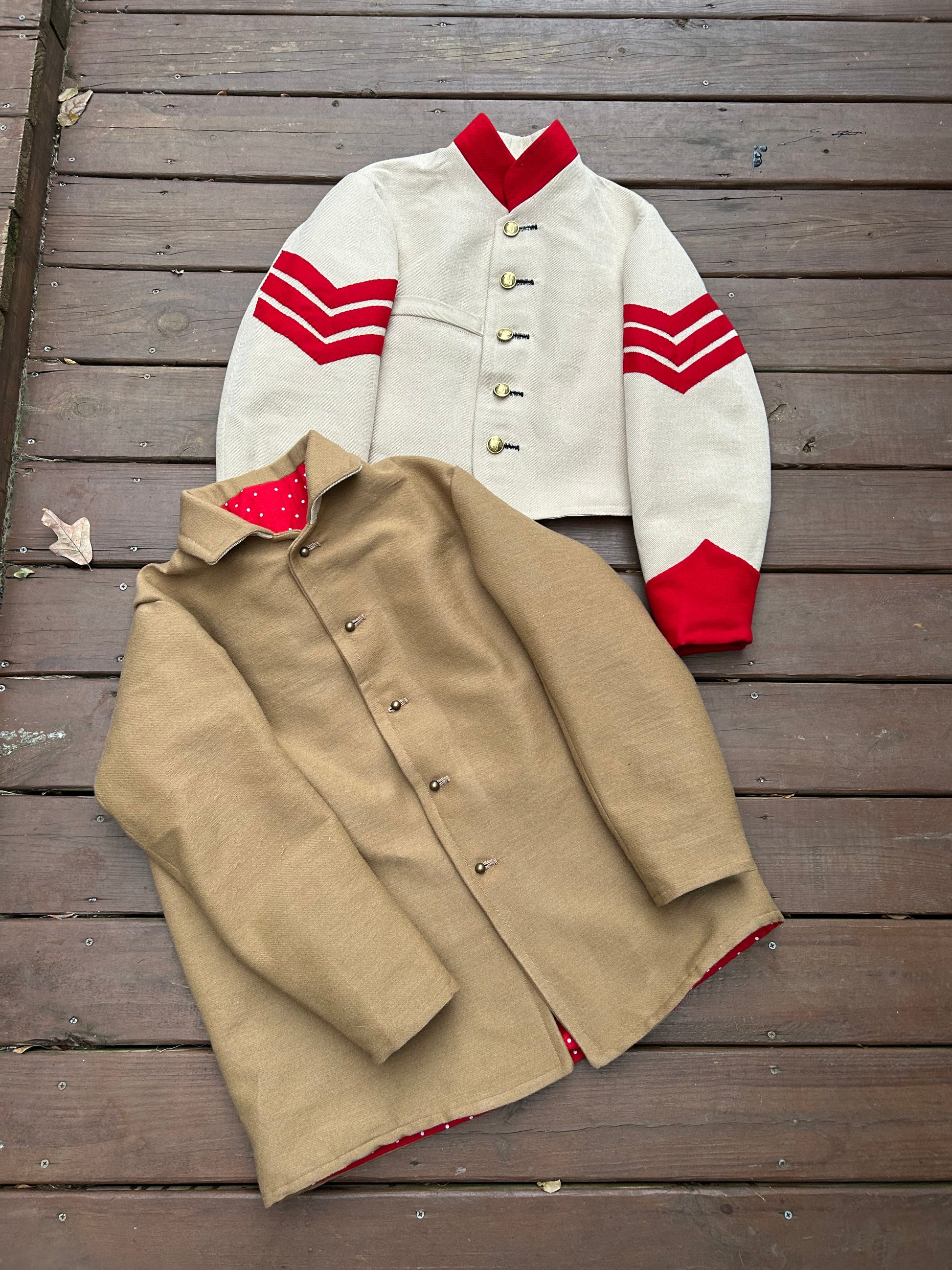 This exampled is based on a surviving image showing an untrimmed jean sack coat. The coat has a fall collar, no exterior pockets , and closed with 5 buttons. The overall pattern is similar to other known surviving examples, with their details being replicated for construction.
