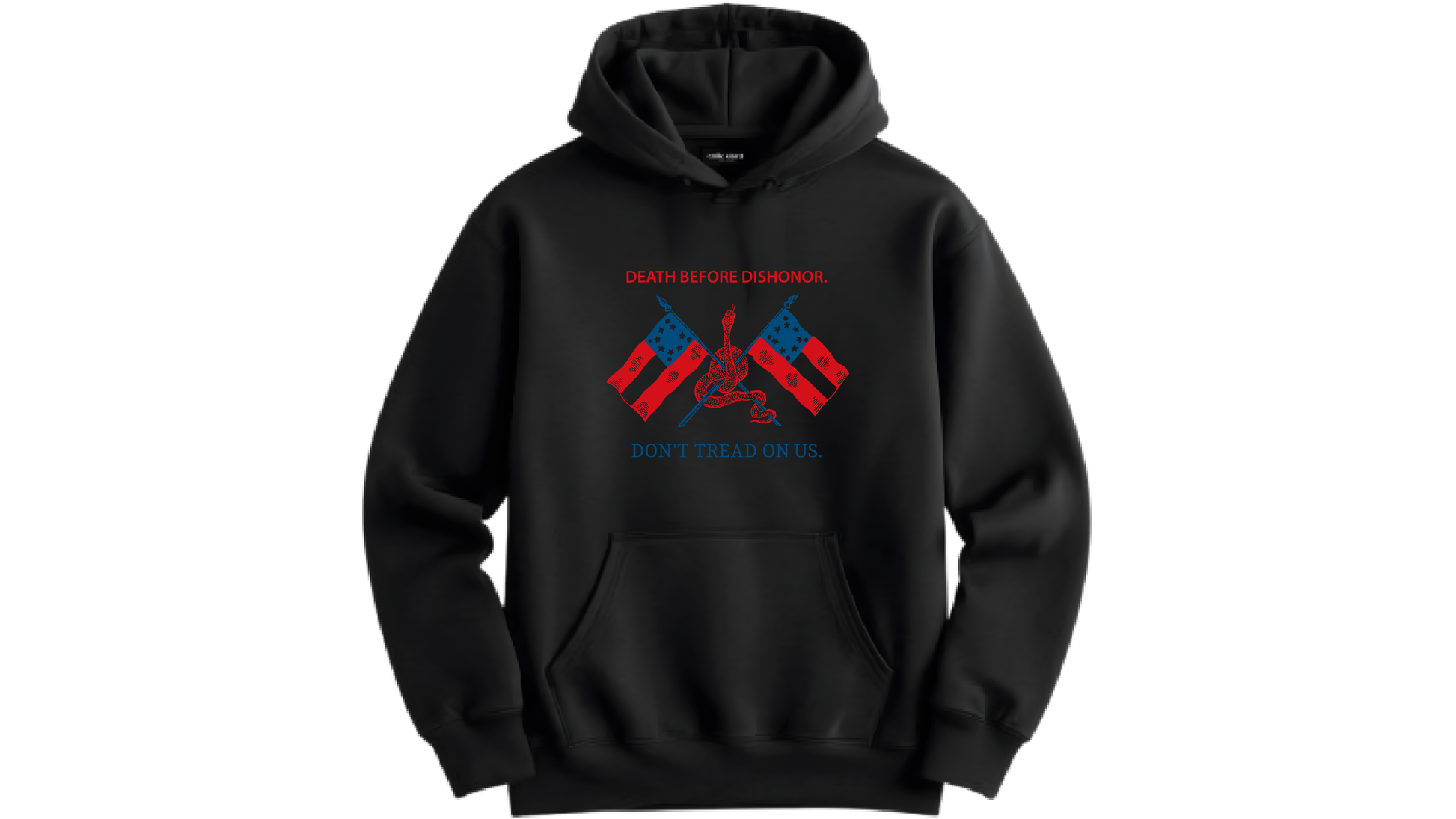 Based on a 19th Century design, with "Don't Tread on Us" below crossed First National Colors and rattlesnake.