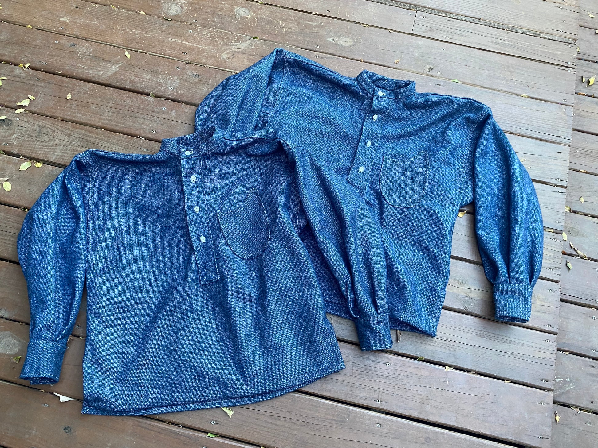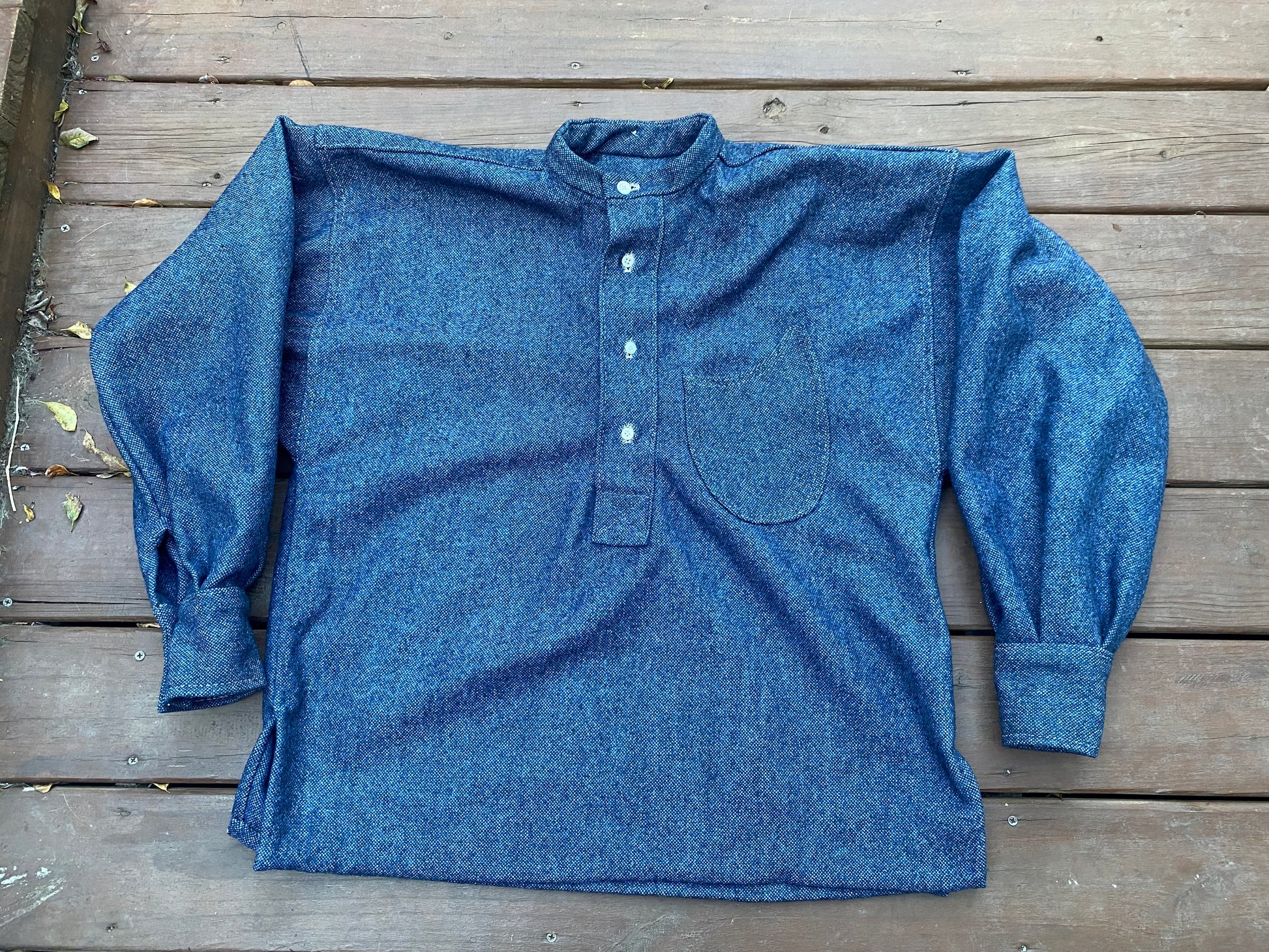 CS Issue wool shirt based on e on worn by Private John MacRae of Starr's Battery and worn during the North Carolina Campaign of 1865. The garment is typical of wool shirts madre from mixed blue wool flannel. There is some historical speculation that this cloth was imported by the Confederacy, but could also be domestic product. It is also believed that this may have been a product of the North Carolina State production goods.