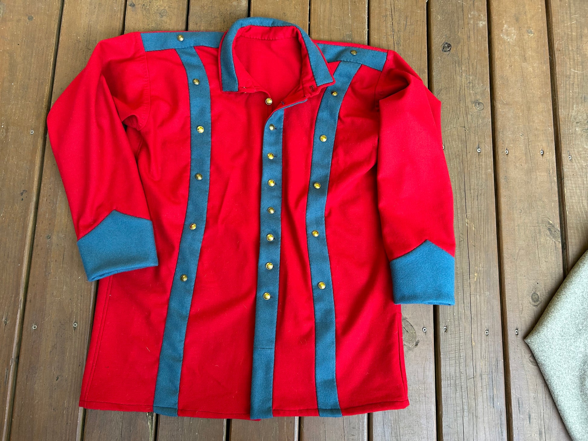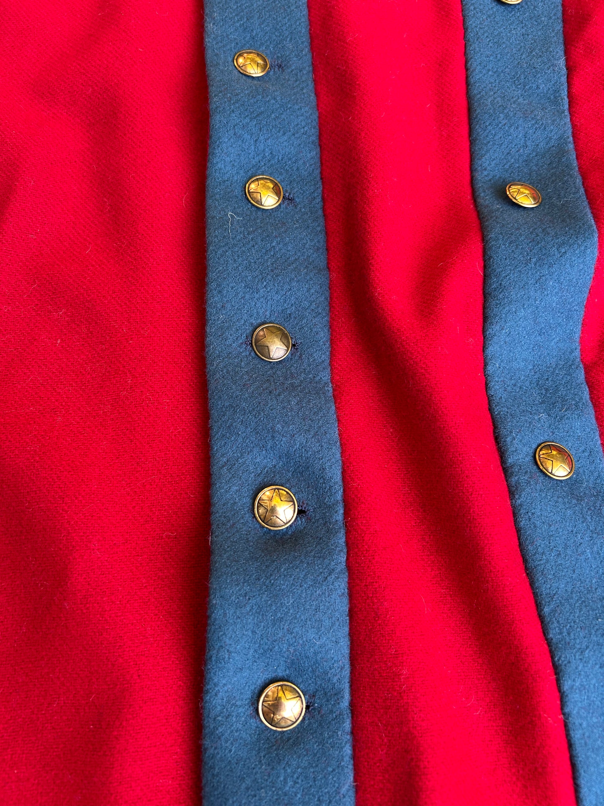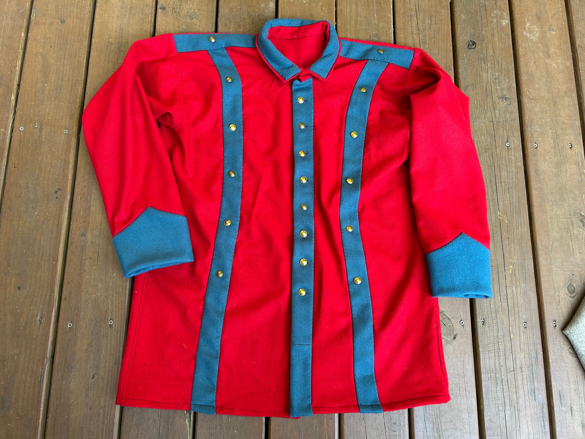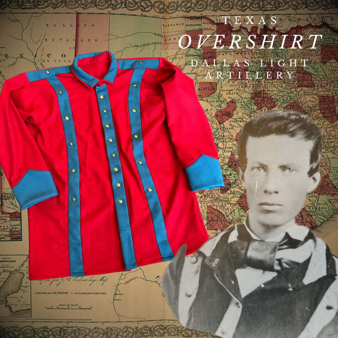 This shirt is based on a surviving photo from the Dallas Light Artillery. Per the known photos and periods descriptions, the shirts are made from red wool, trimmed in blue, and closed with small brass buttons.