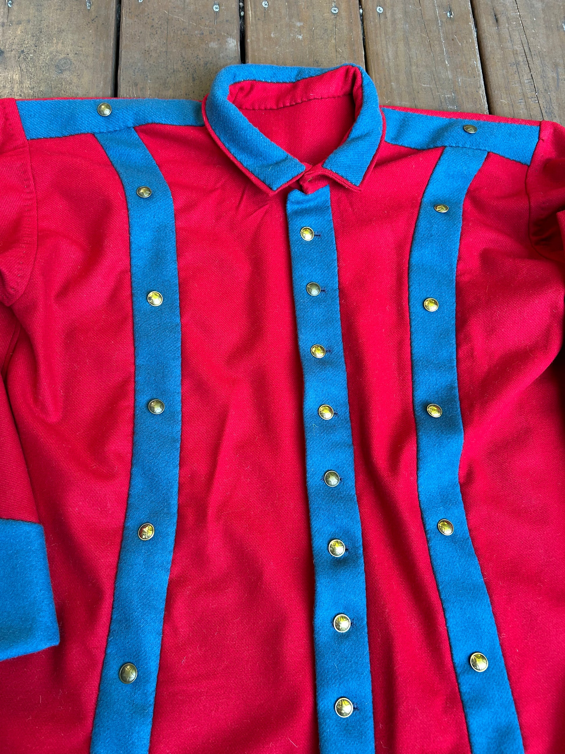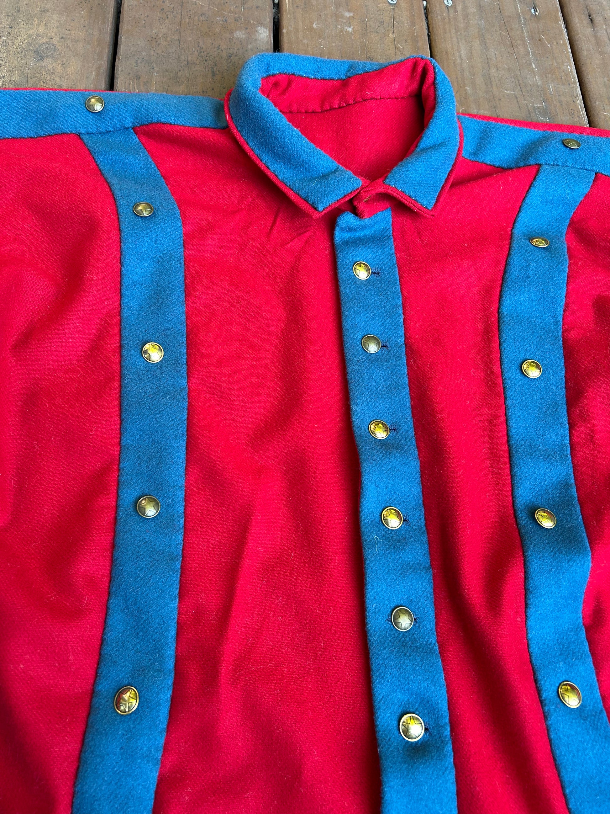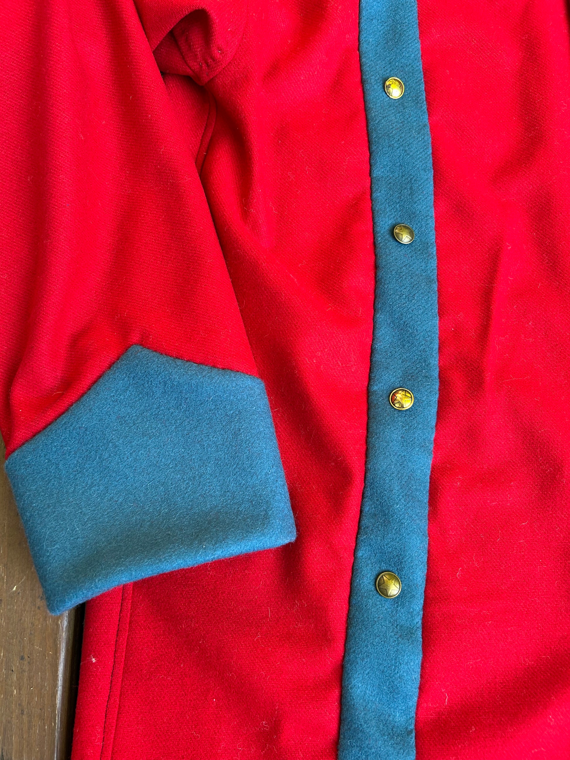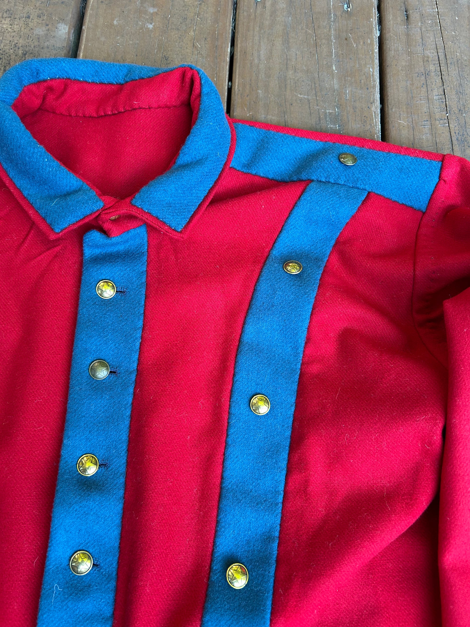 This shirt is based on a surviving photo from the Dallas Light Artillery. Per the known photos and periods descriptions, the shirts are made from red wool, trimmed in blue, and closed with small brass buttons.