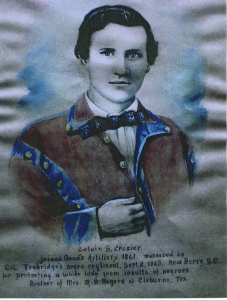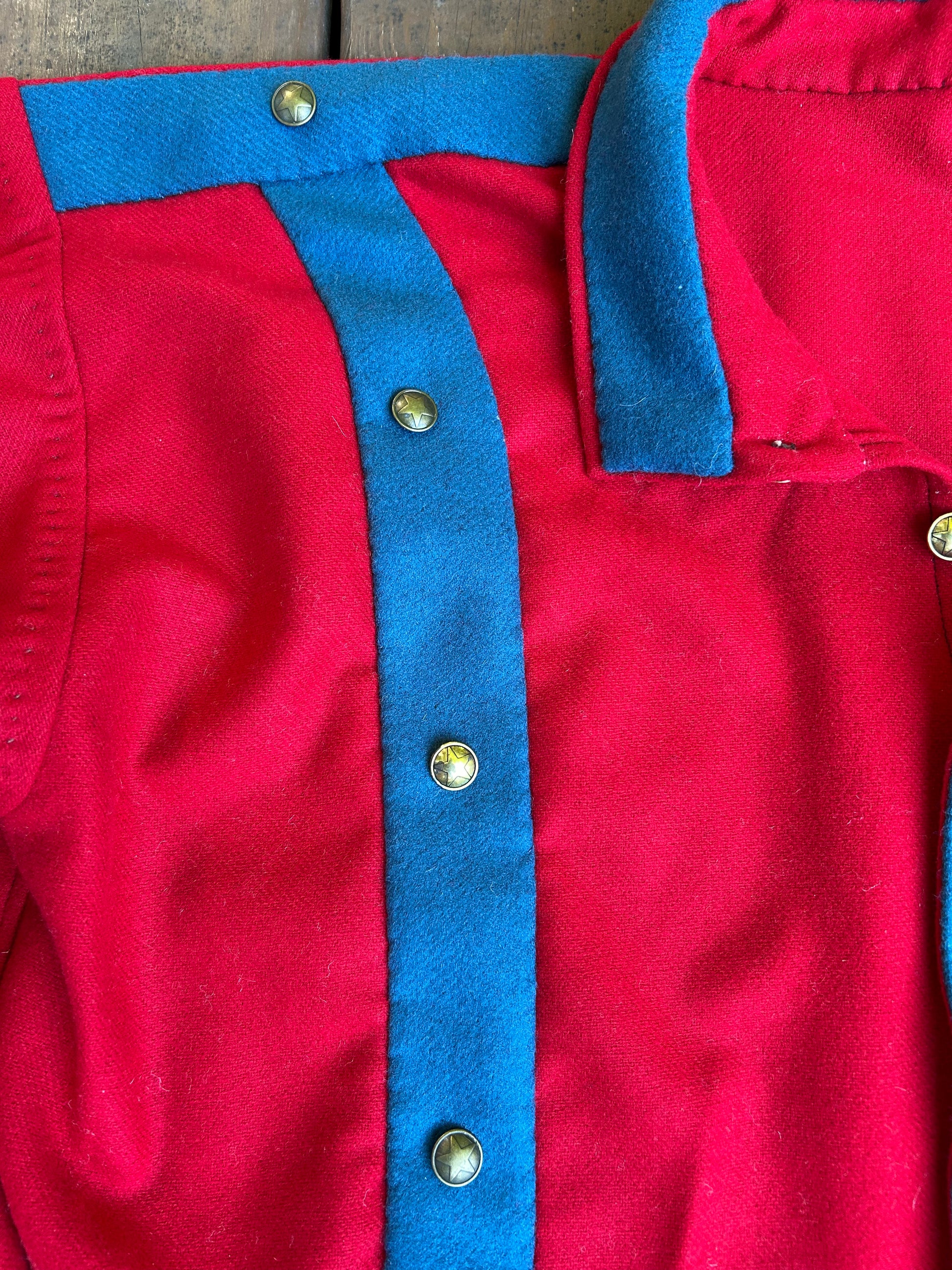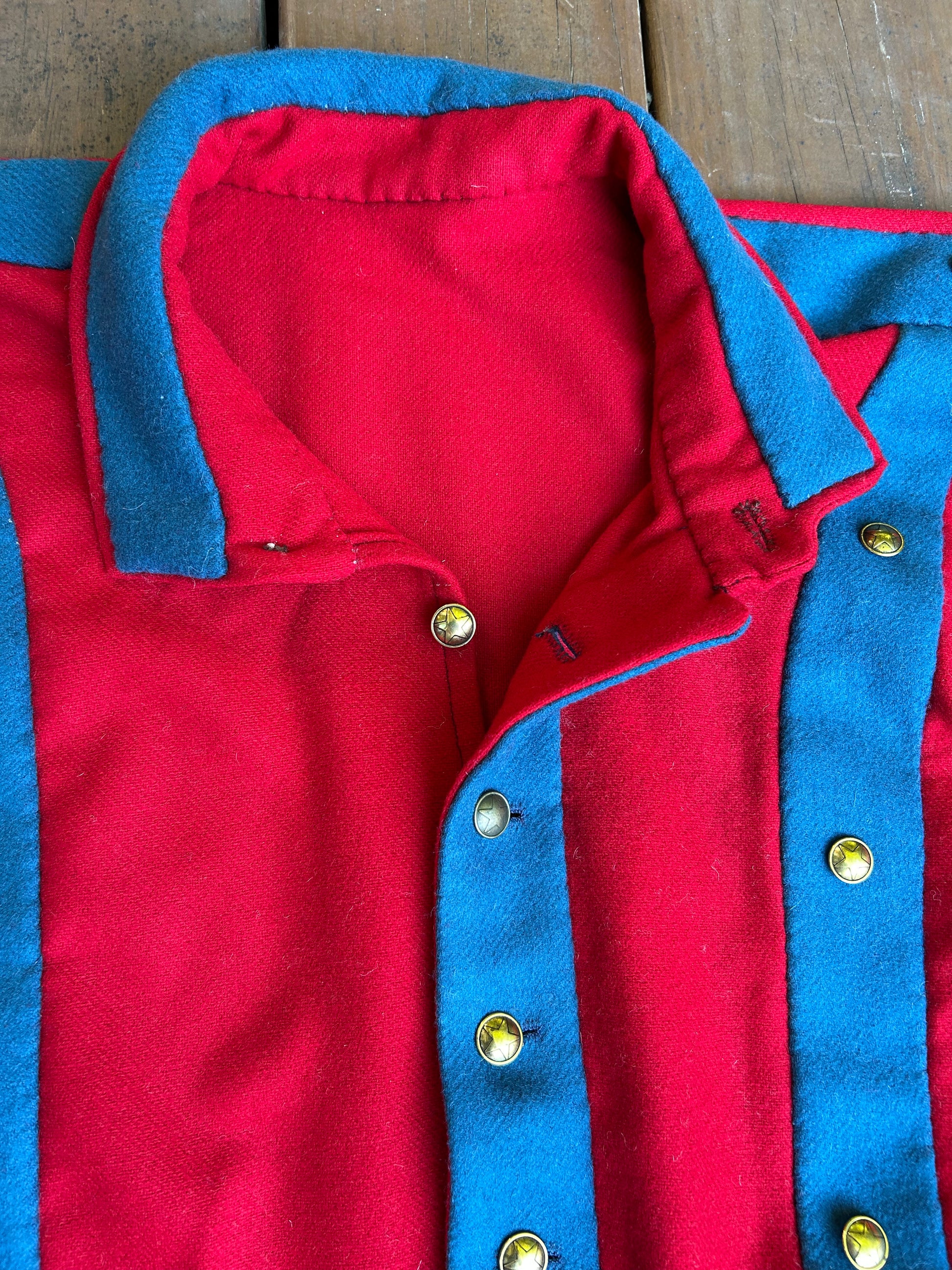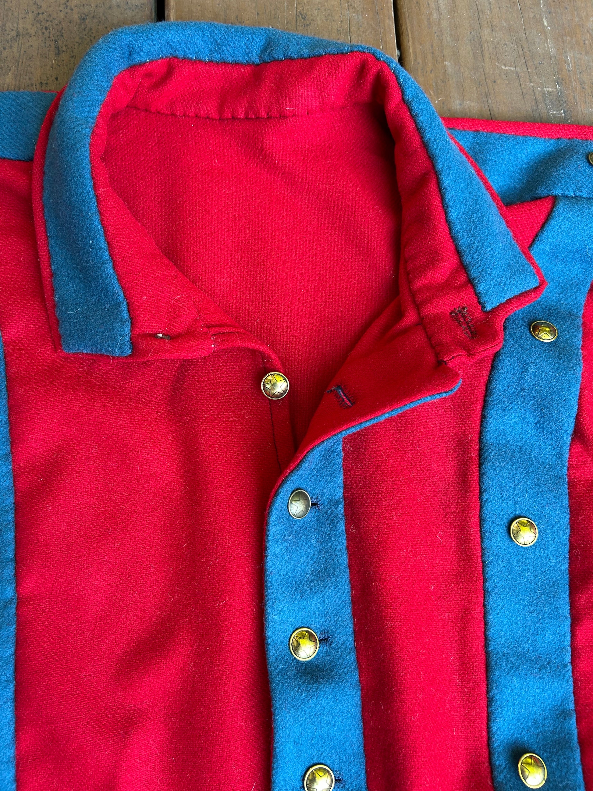 This shirt is based on a surviving photo from the Dallas Light Artillery. Per the known photos and periods descriptions, the shirts are made from red wool, trimmed in blue, and closed with small brass buttons.