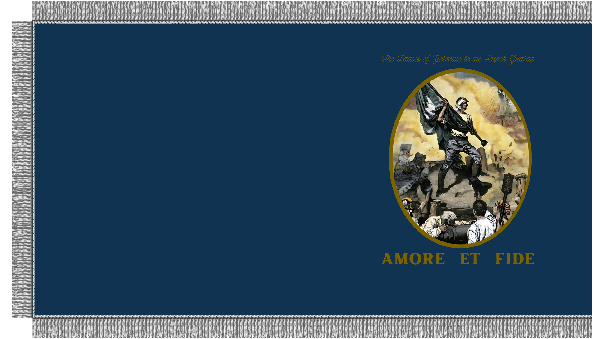 Flag design is based on the written description of the flag that did not surviving the conflict. One side depicts the American War for Independence battlefield of Kings Mountain and the reverse the name sake of the unit (Fort Moultrie) and the raising of the flag by William Jasper.