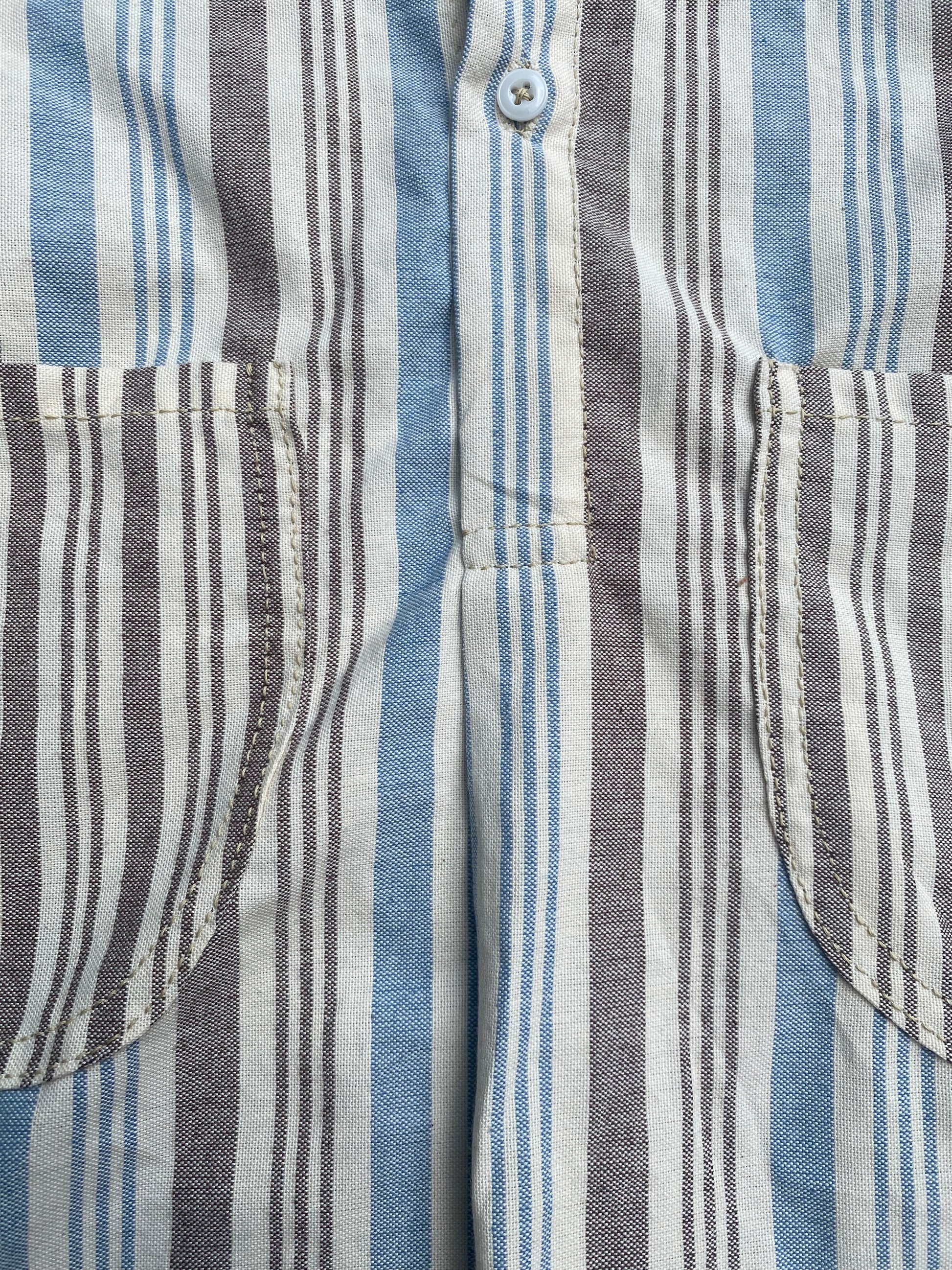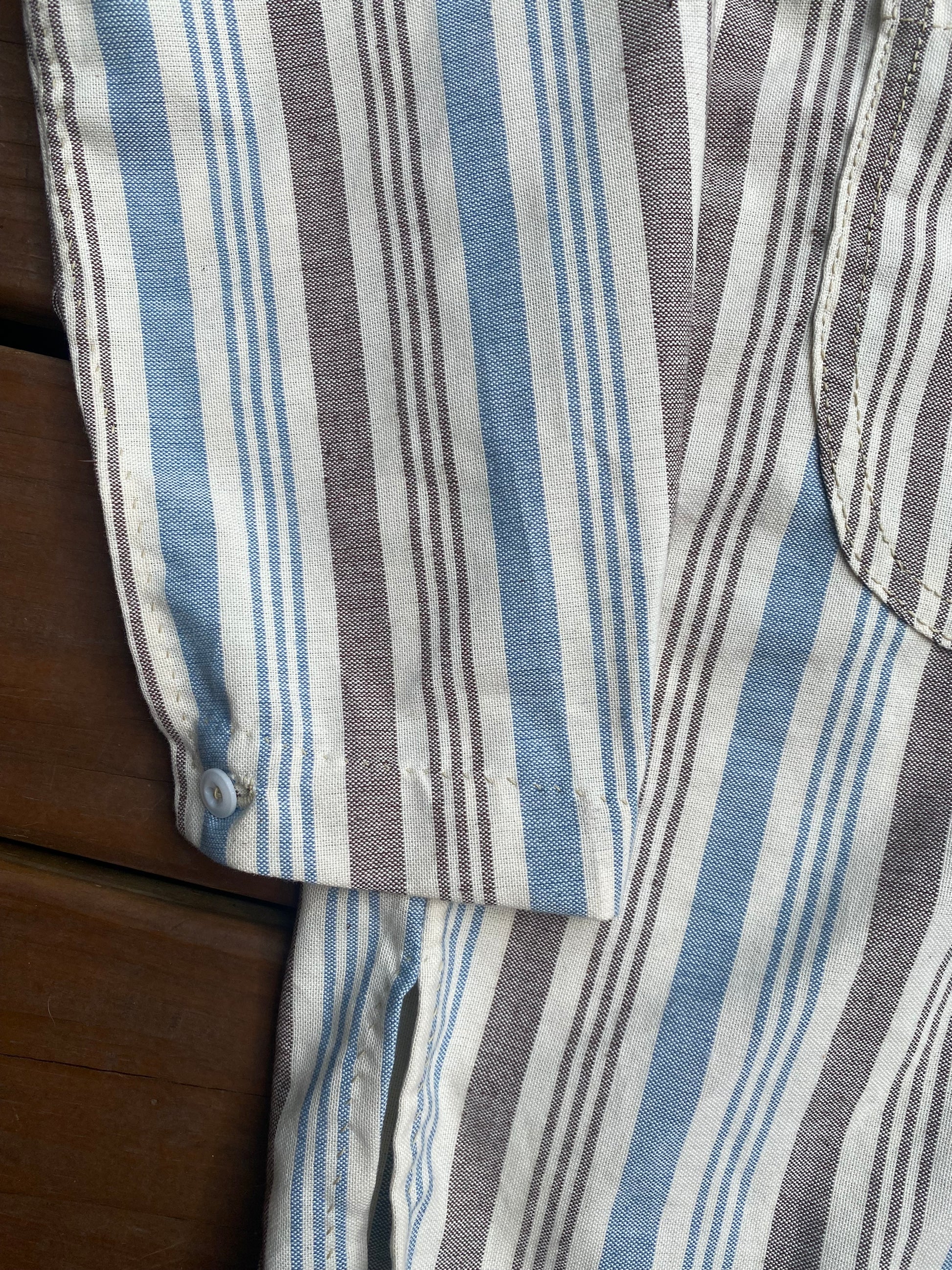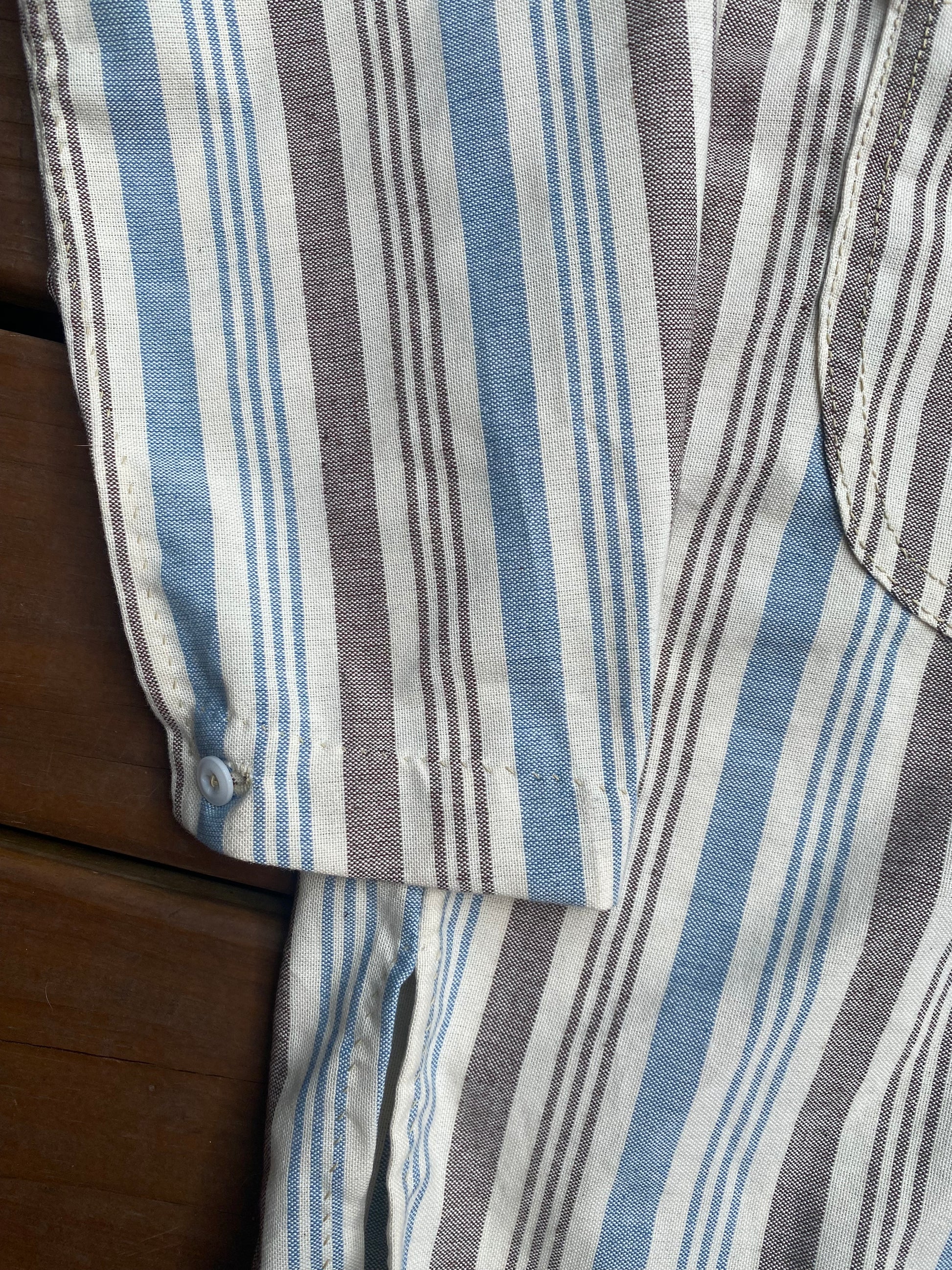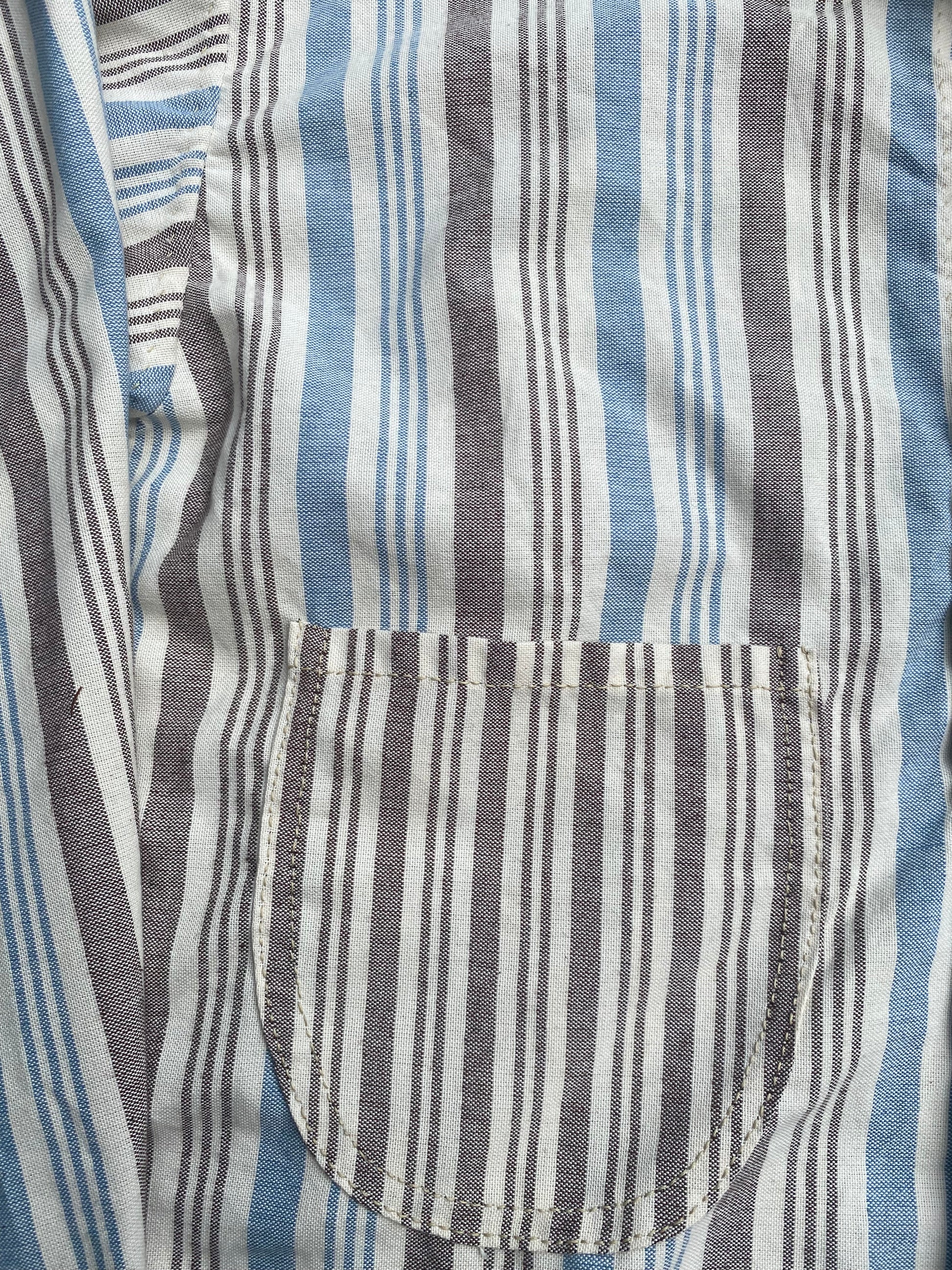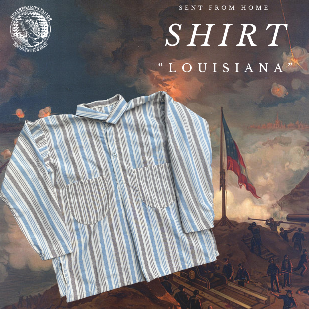 Based on a surviving shirt associated with an English volunteer to a Louisiana regiment, the shirt represents a civilian shirt possible a depot shirt utilizing civilian fabrics associated with the Trans-Mississippi Theater. The shirt is made from three separate (but similar) cotton striped materials (variations in the sleeve, body, and pocket material). Shirt has two outside pockets, no cuffs, and a folded placket.