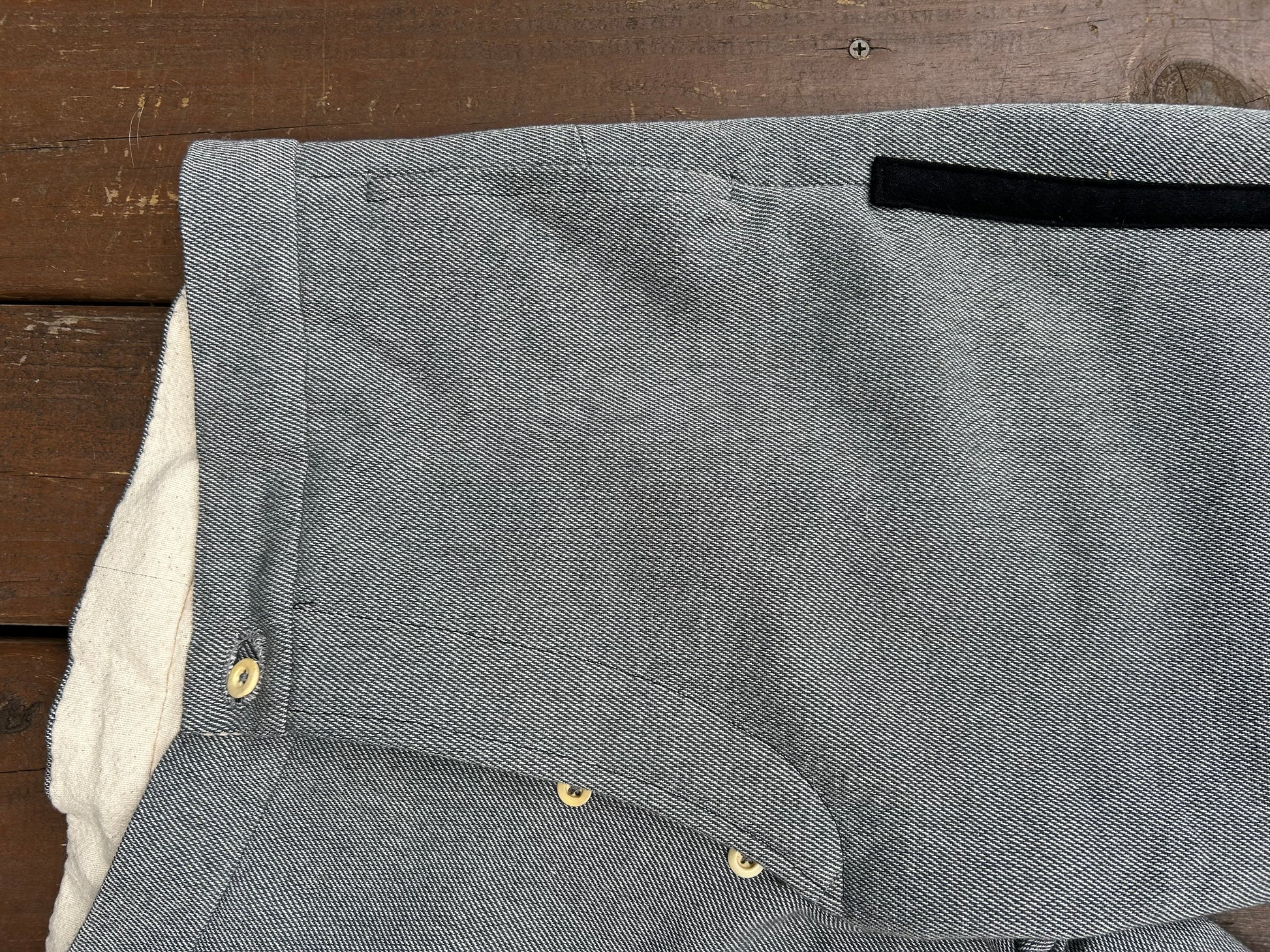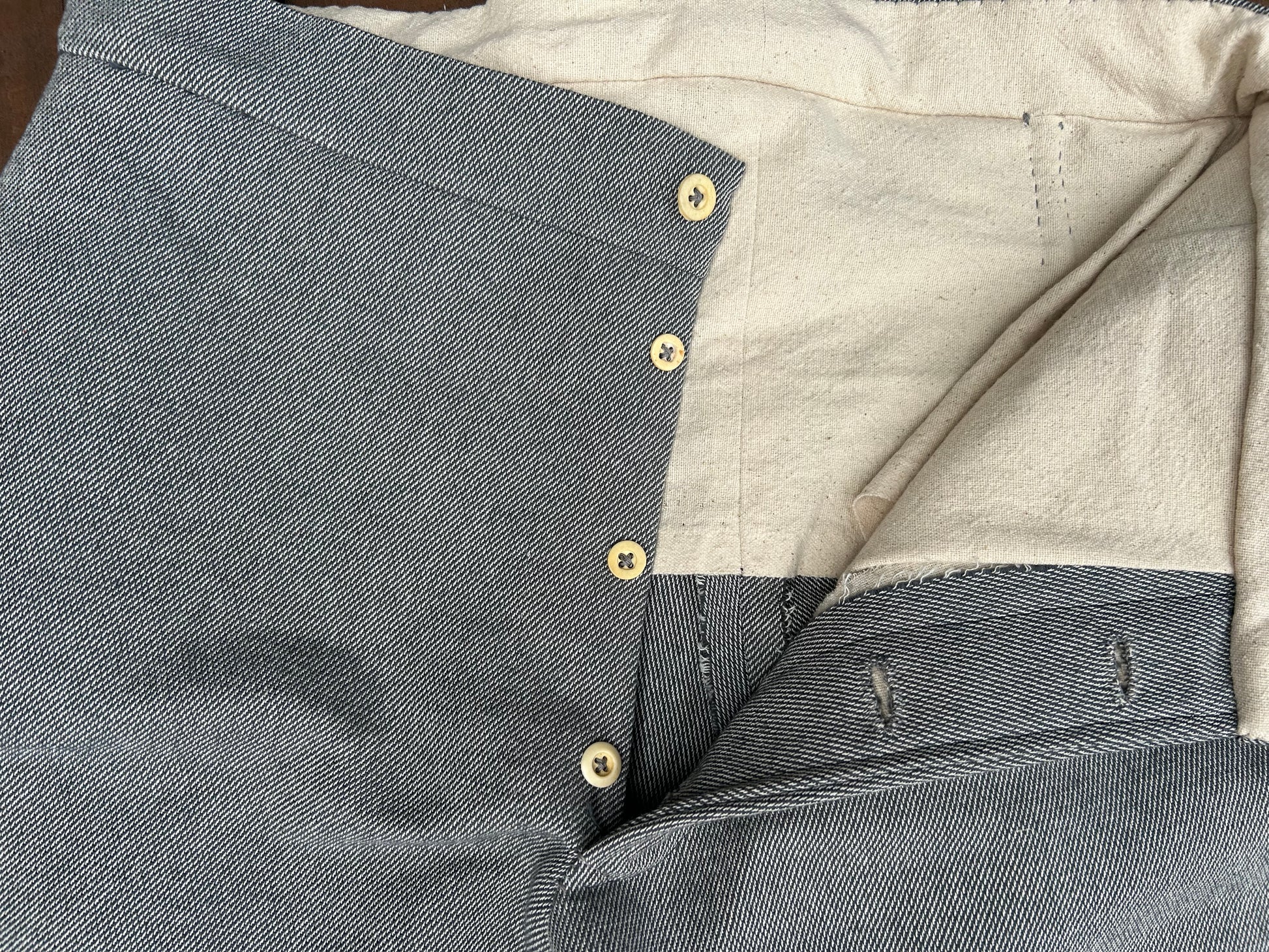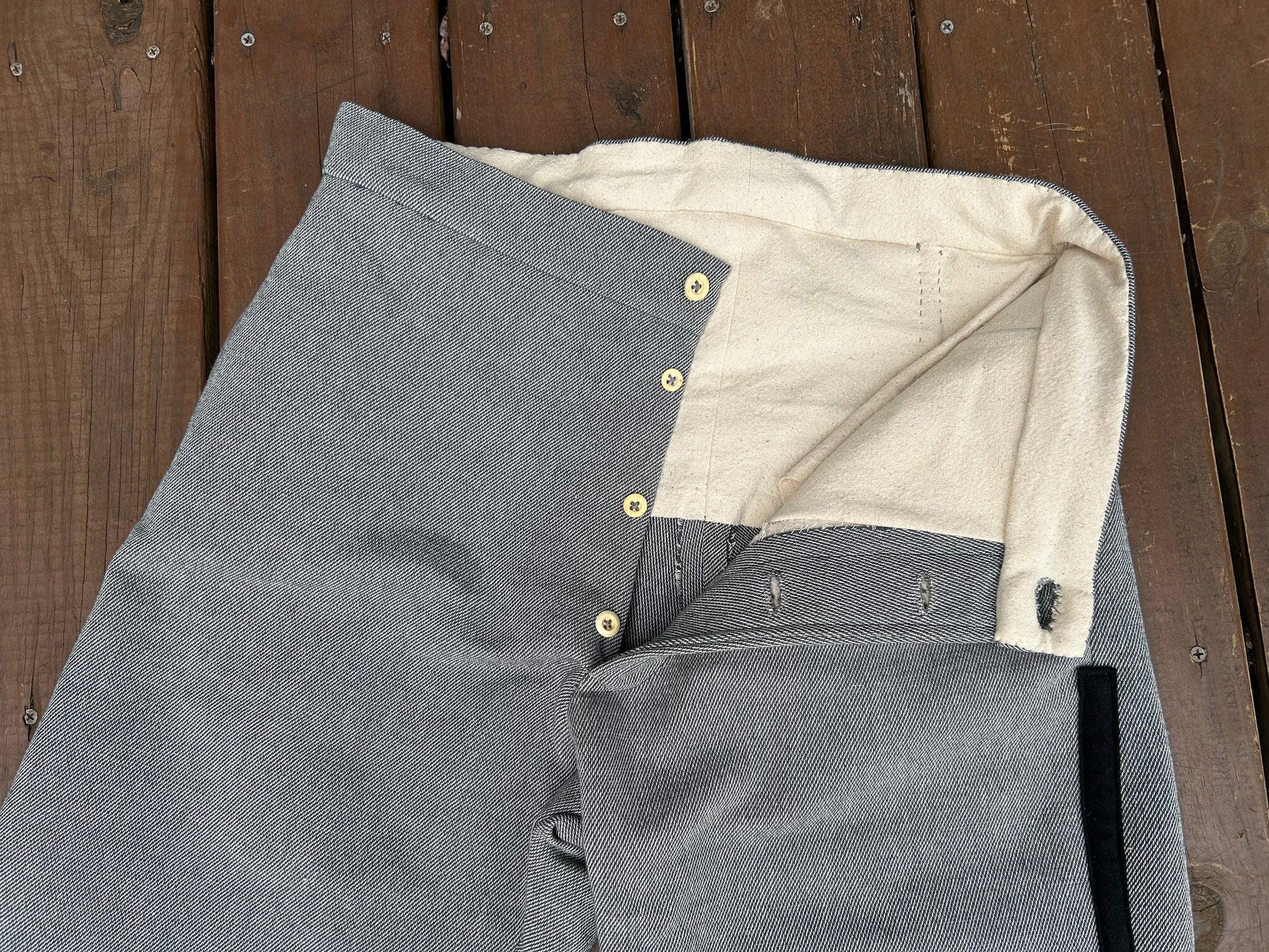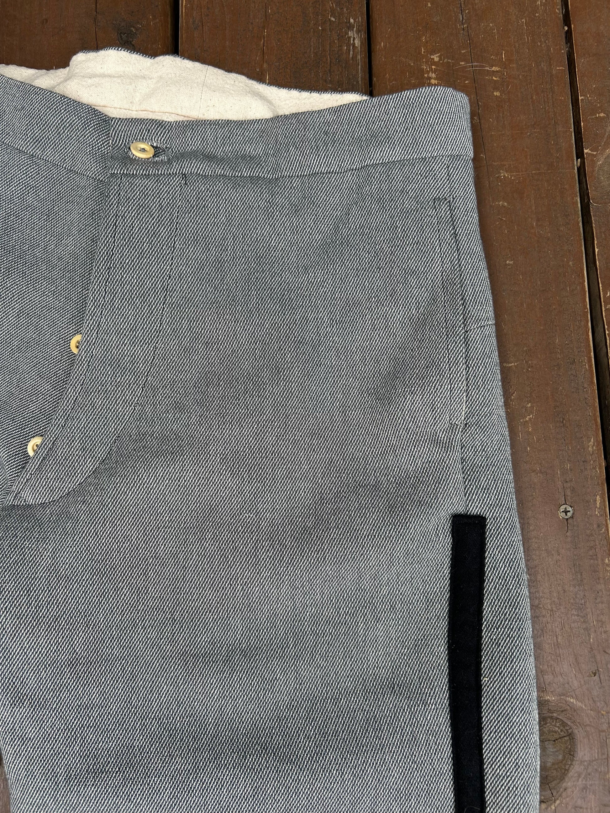 North Carolina state issue trousers based on a surviving example. Similar to some of the Georgia state production, the trousers have a number of unusual features including a large back yoke and no brace buttons.