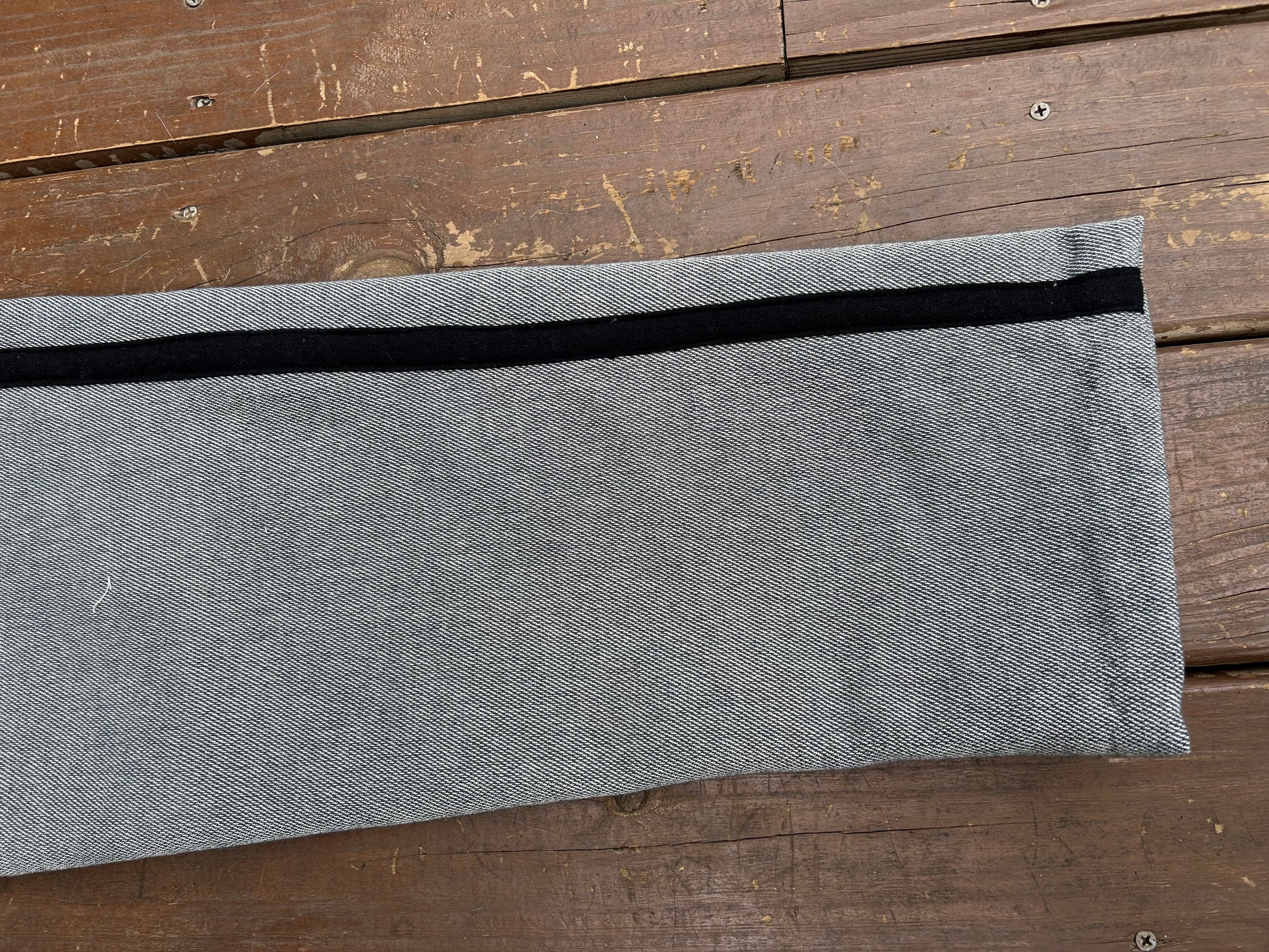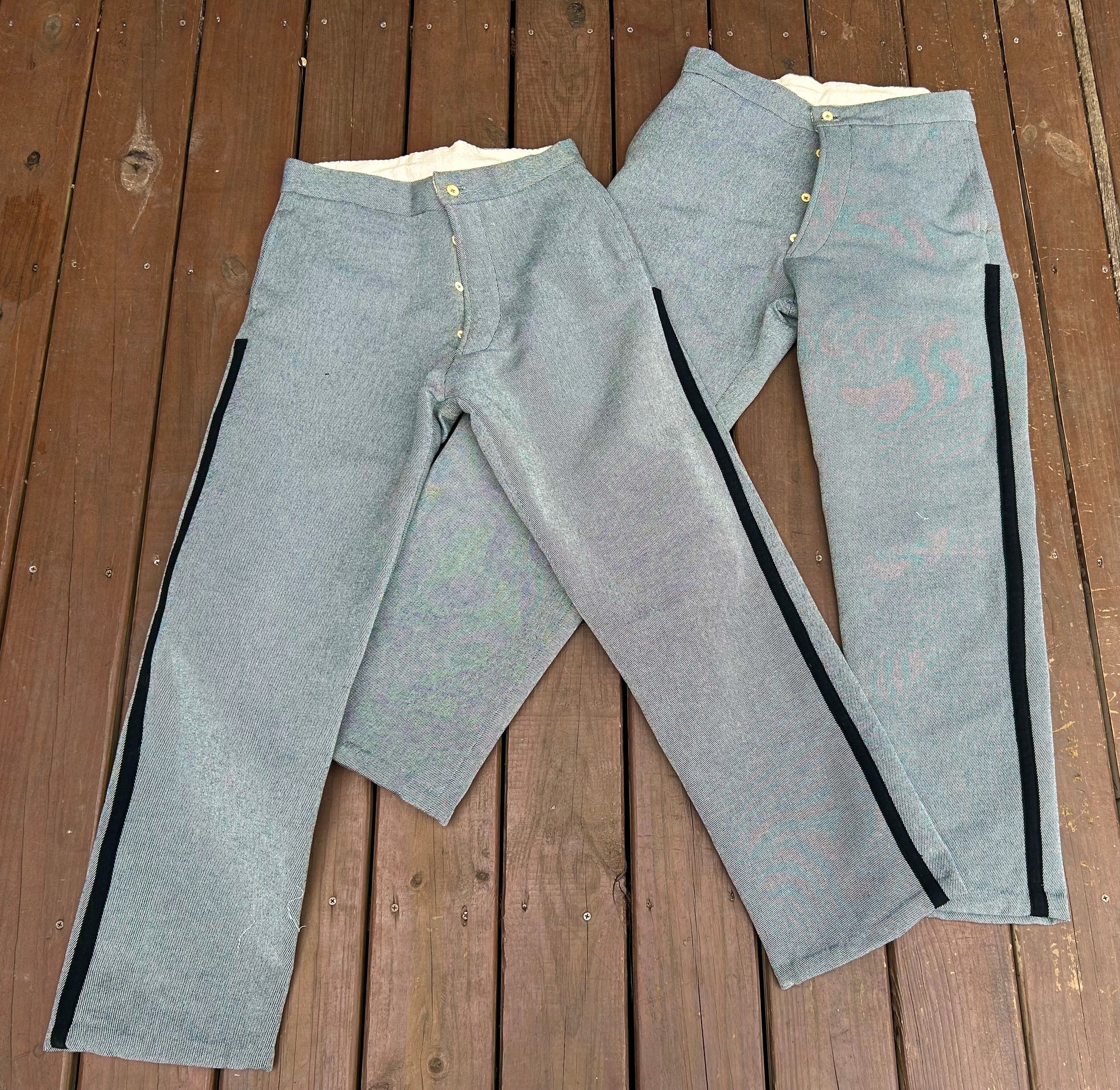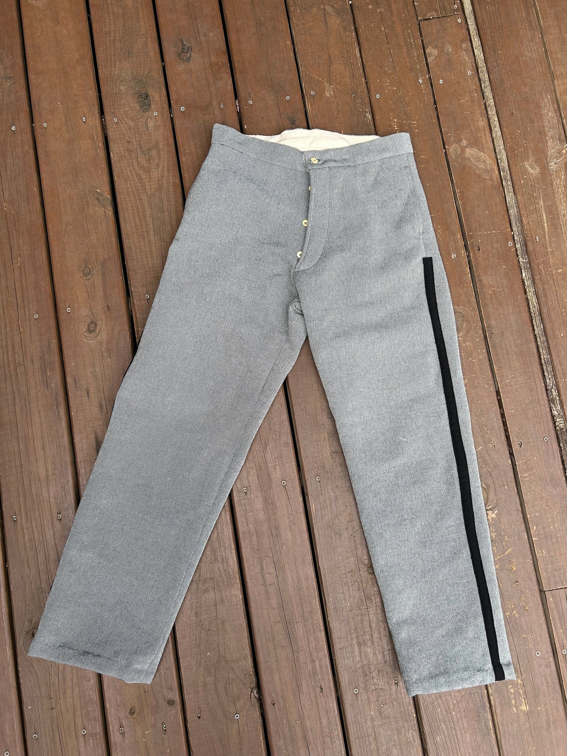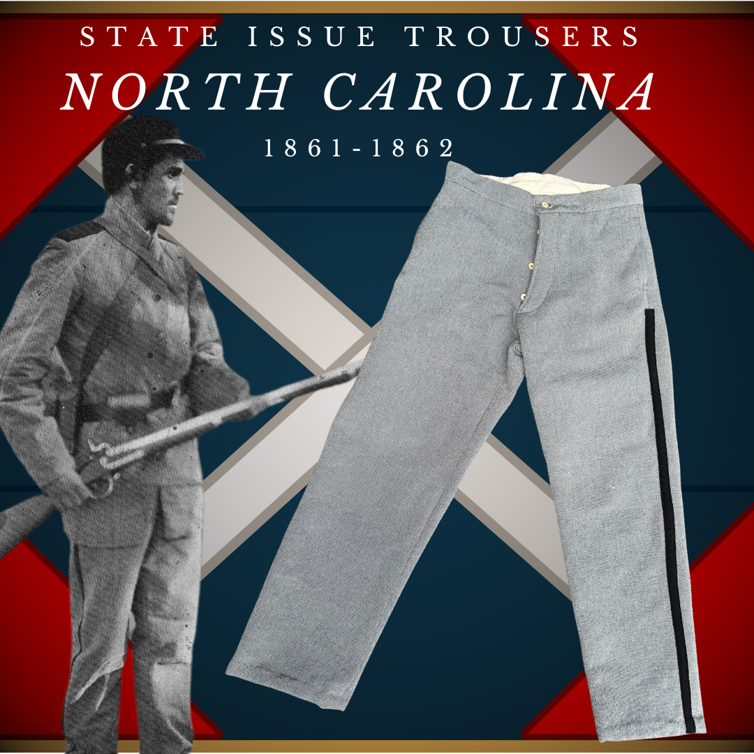 As originally adopted, the State of North Carolina originally intended to issue trousers for her troops with matching trim to that of their famed sack coats. This would be a stripe running down the outer seam in black, red, or yellow. No surviving originals of this early 1861-1862 issuance has survived, however, later production from post 1862 has and is utilized for the basis of the construction with the regulation trim applied.