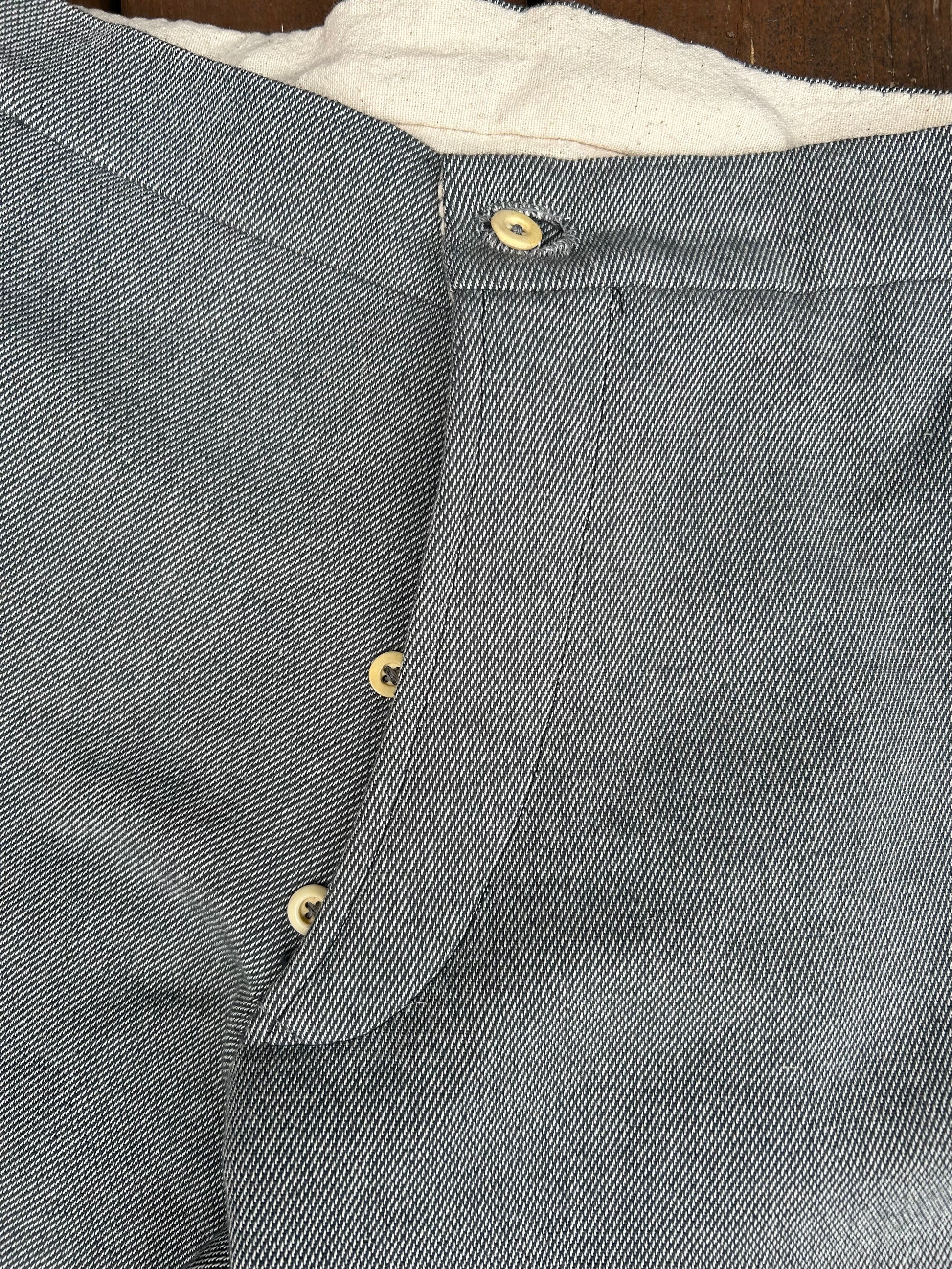 The trouser sizes noted represent the natural waist measurement of the individual. Please beware these are not modern sizes and failure to utilize true natural waist measurements will result in ill fitting trousers. The tailoring fit and shapes are accurate to the historic garment, which are often different than equivalent modern clothing.