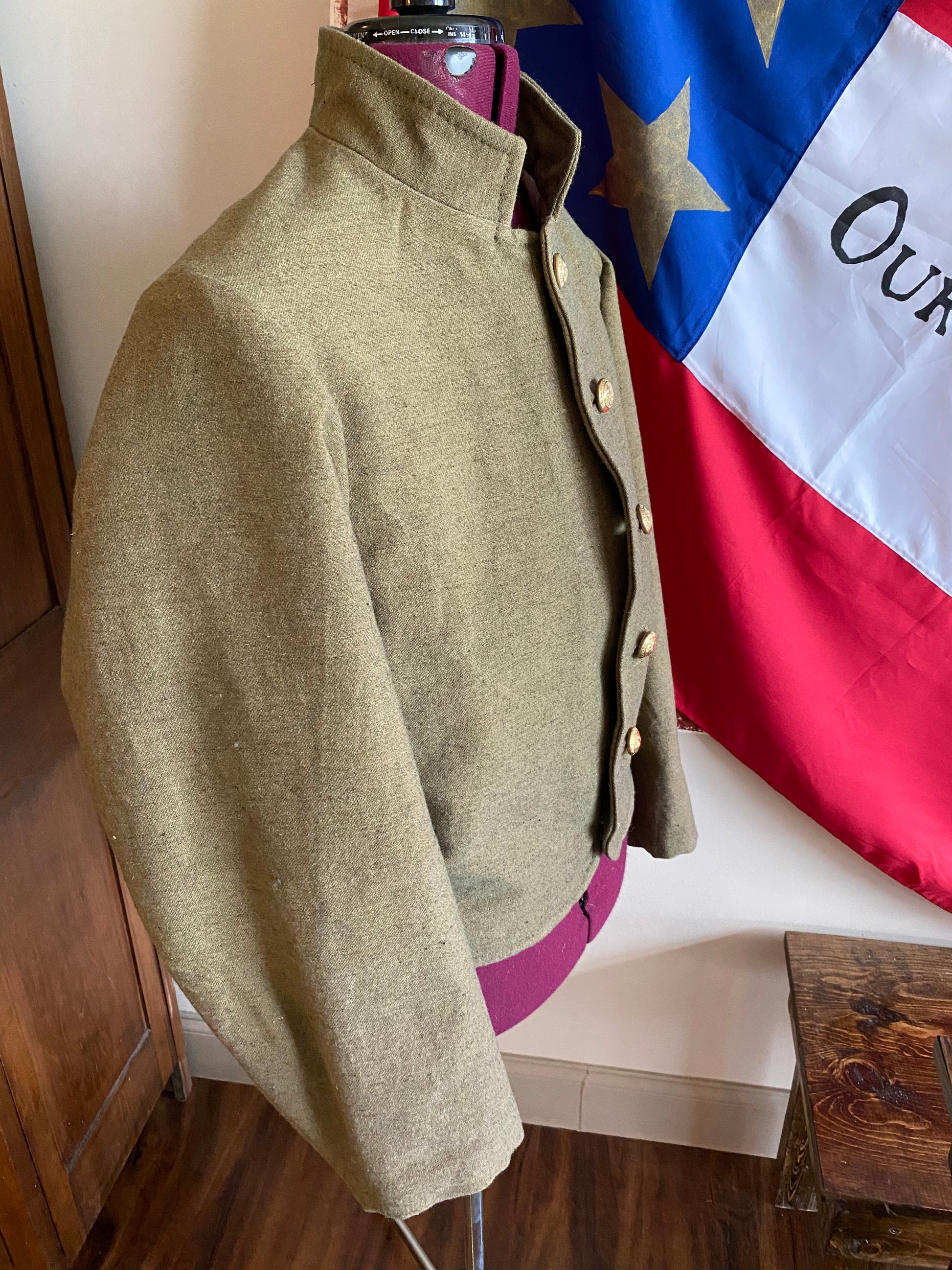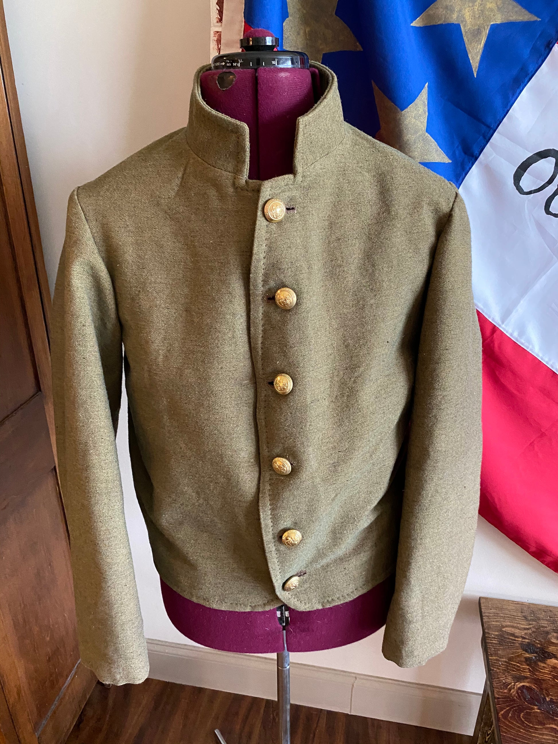 North Carolina State issue jacket based on a surviving example linked to Charlotte production in 1865. While the jacket was likely made at the end of the war, this style of garment was issued to the state forces of the state from 1862-1865. These jackets would be a mainstay for the Old North State during the majority of the conflict.