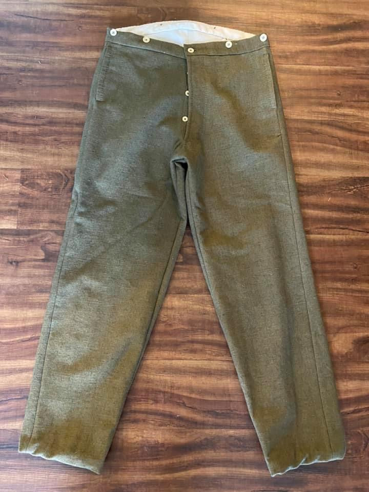 North Carolina state issue trousers based on a surviving example. Similar to some of the Georgia state production, the trousers have a number of unusual features including a large back yoke and no brace buttons. However, the most distinctive feature is that the trousers are fully lined, an extremely rare feature on state or depot production trousers.