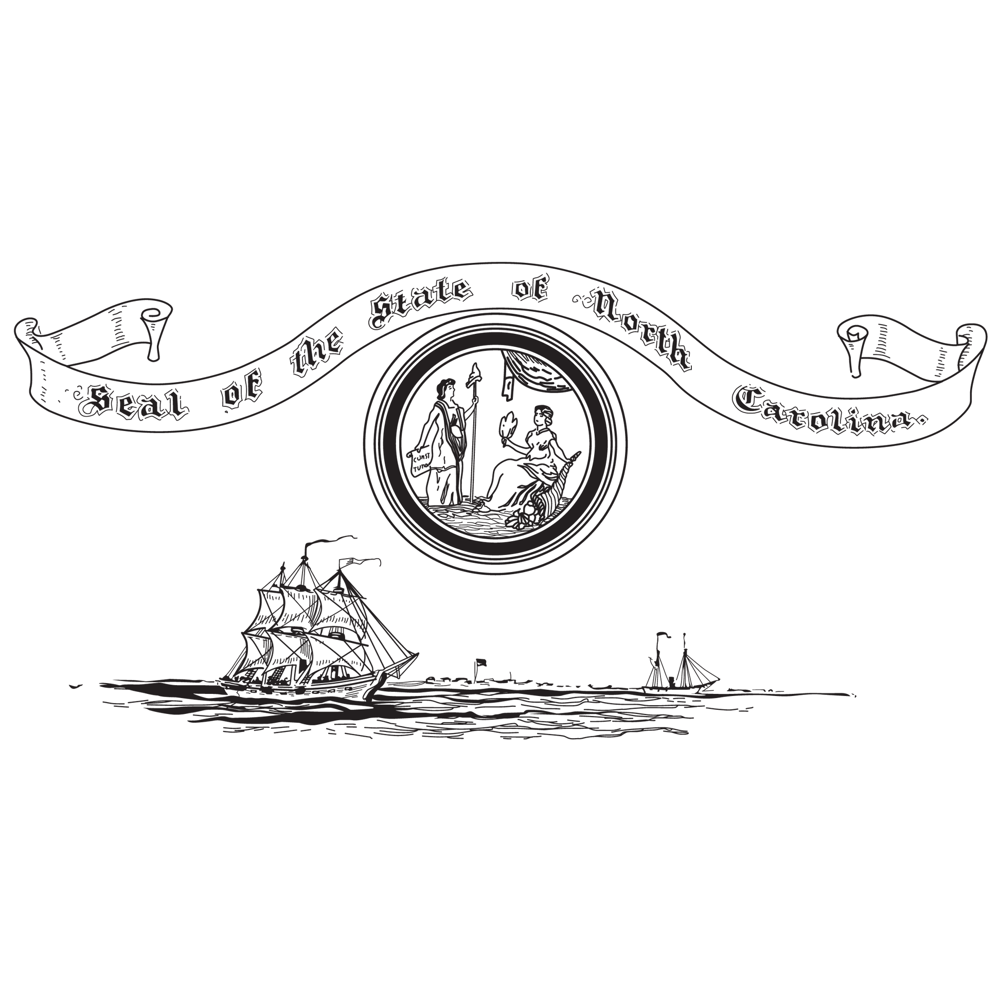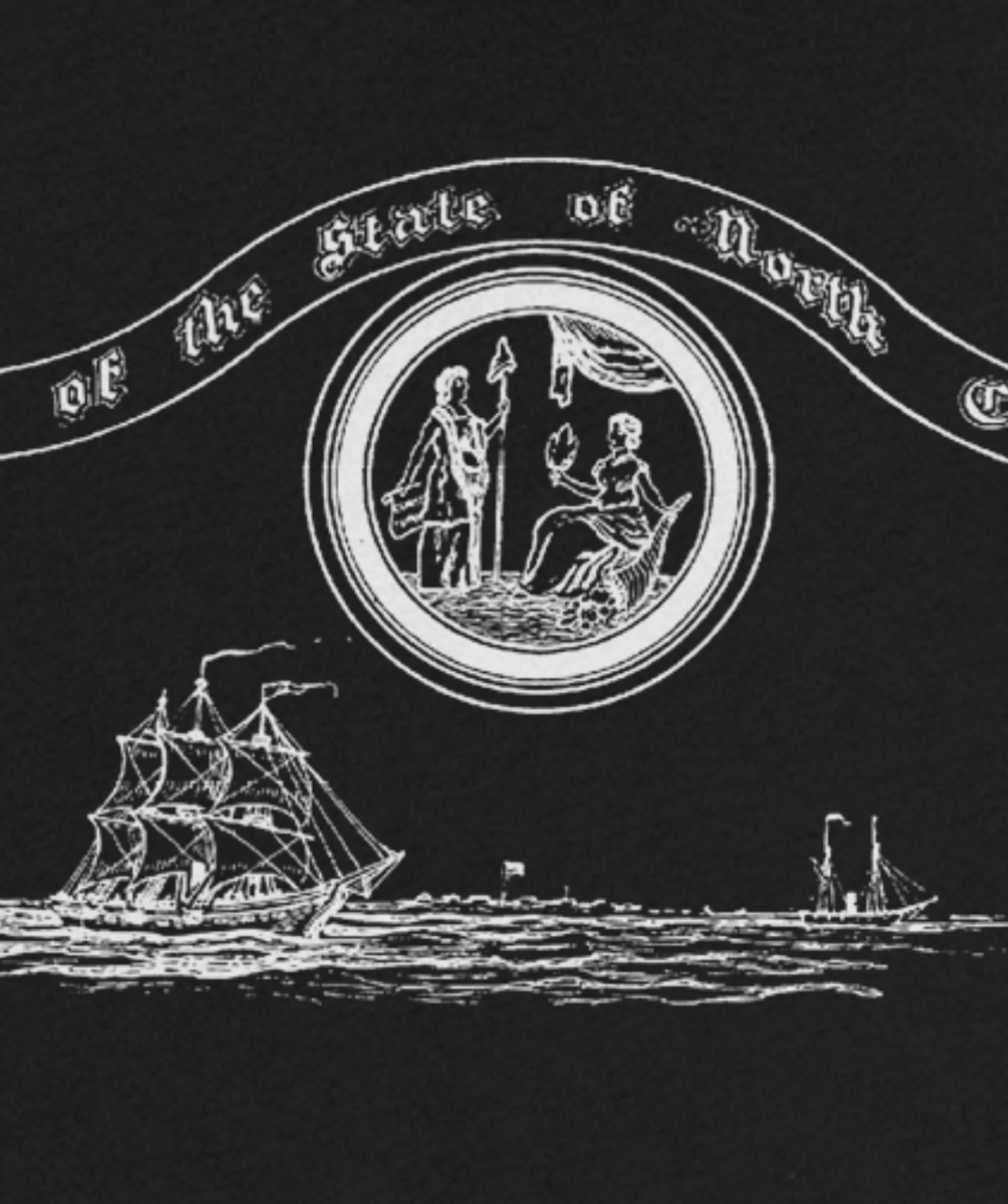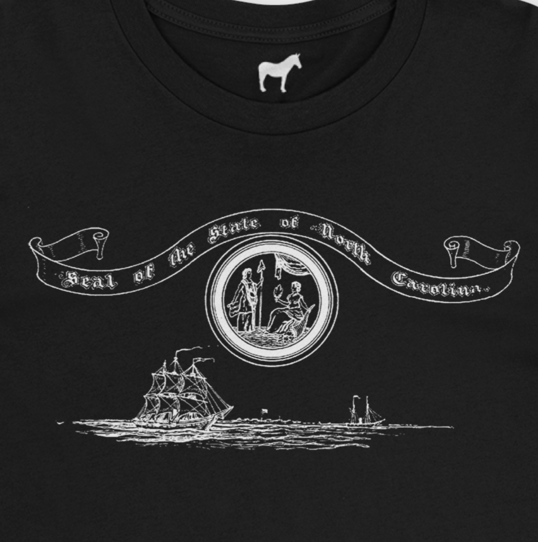 The shirt depicts the vital North Carolina coastline with Fort Fisher and Cape Fear River along side blockade runners. Above the shoreline is the North Carolina State seal.
