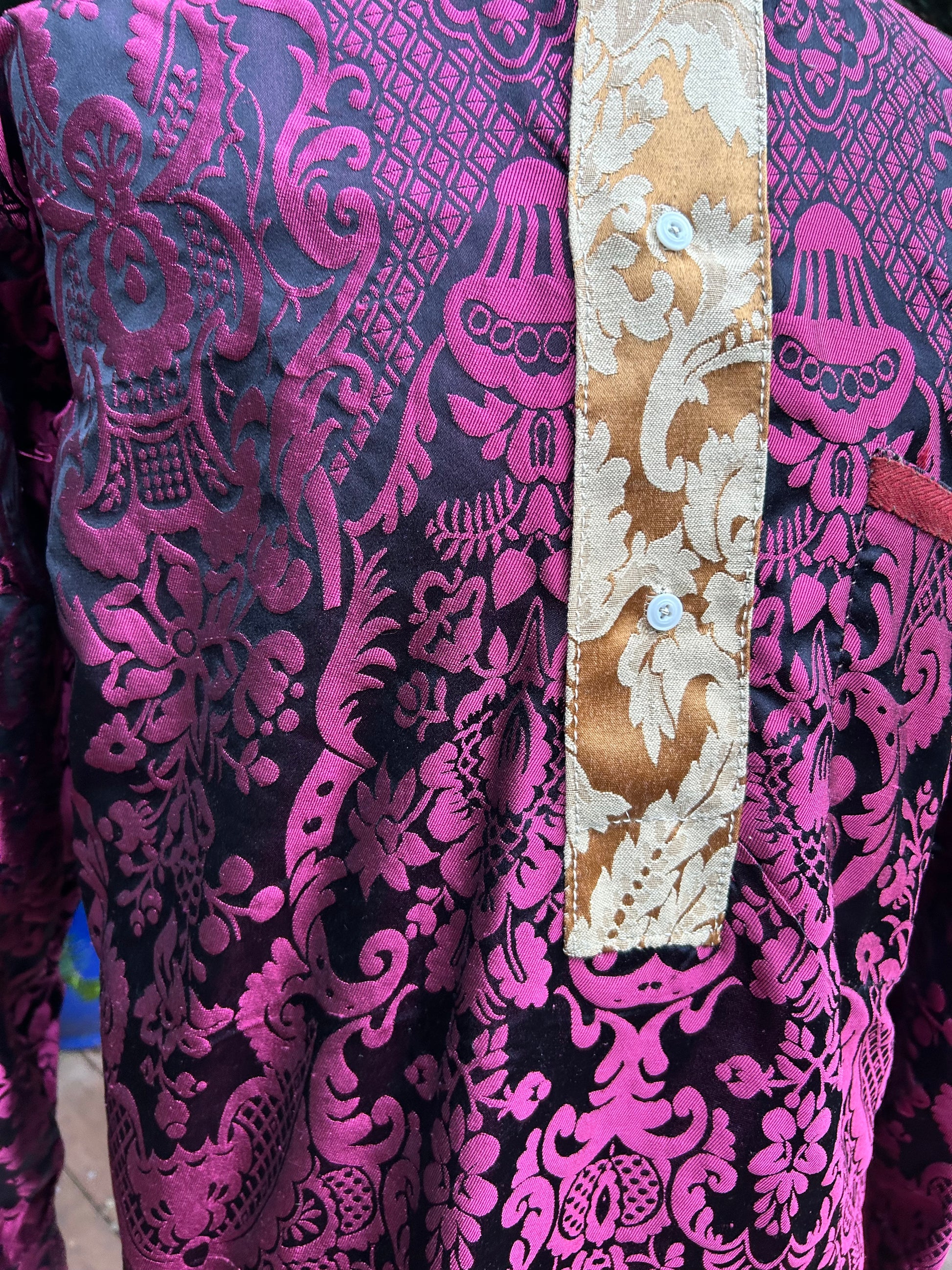 The shirt is made from a fine cotton and silk paisley (design is specifically a design utilized in the late 18th Century), with the placket made from a slightly darker paisley fabric. The collar and outside pocket are trimmed to compliment the color of the shirt.