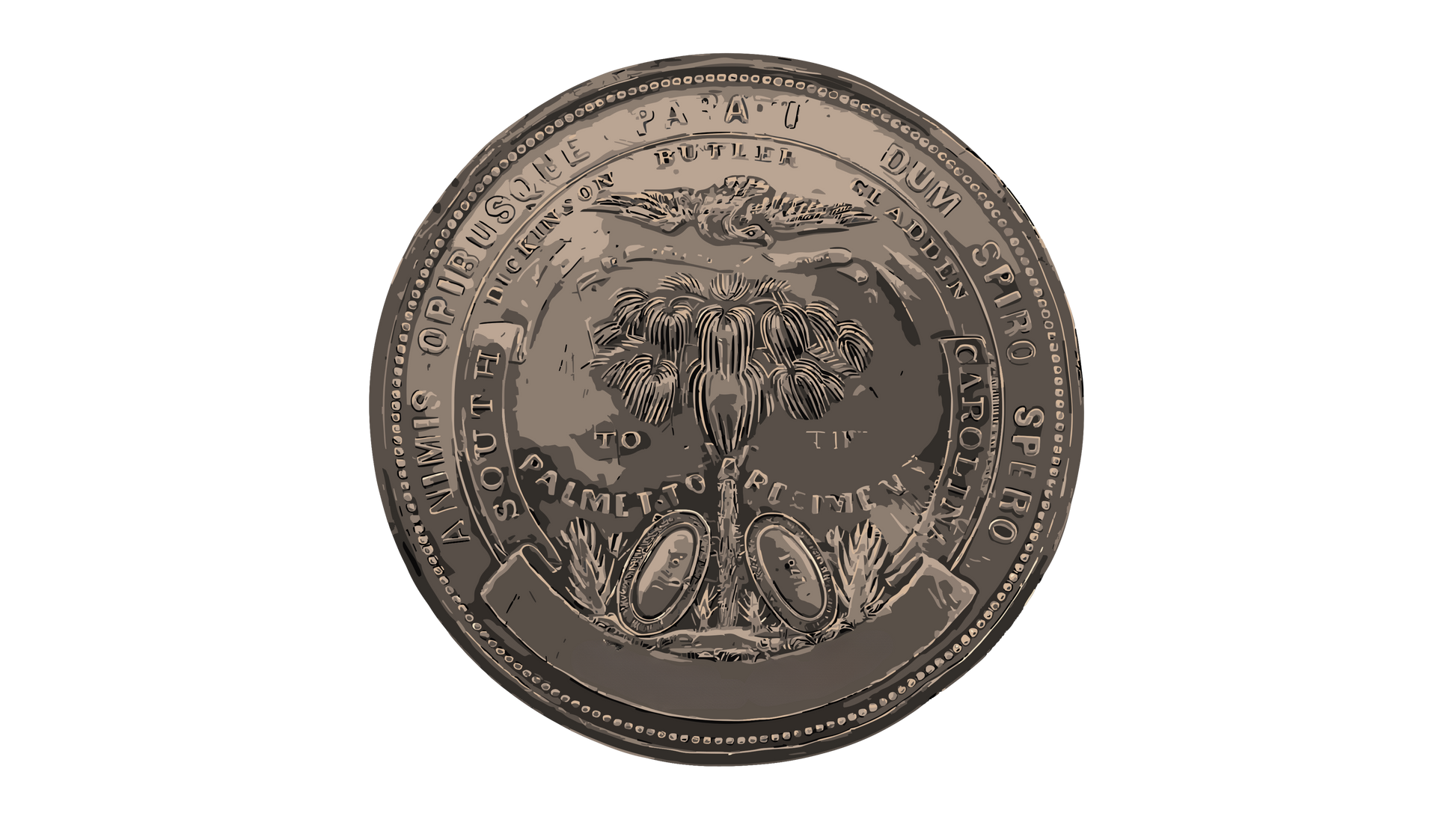 - On the reverse, is delineated a beautiful Palmetto Tree, resting against the trunk of which recline two shields, bearing the dates 1846 and 1847. Hovering over the tree is a spread eagle, from whose beak floats the motto of the Union, "E Pluribus Unum;" immediately above which, in a circle, is inscribed the names of "BUTLER," "DICKINSON," and "GLADDEN." On the outer rim are the State mottos, "Animis Opibusque Parati" - "Dum Spiro Spero." In the center of the medal in curved lines, are the words "To the Palmetto Regiment," and at the foot and lower edge is a blank scroll, for inserting the name of the recipient."