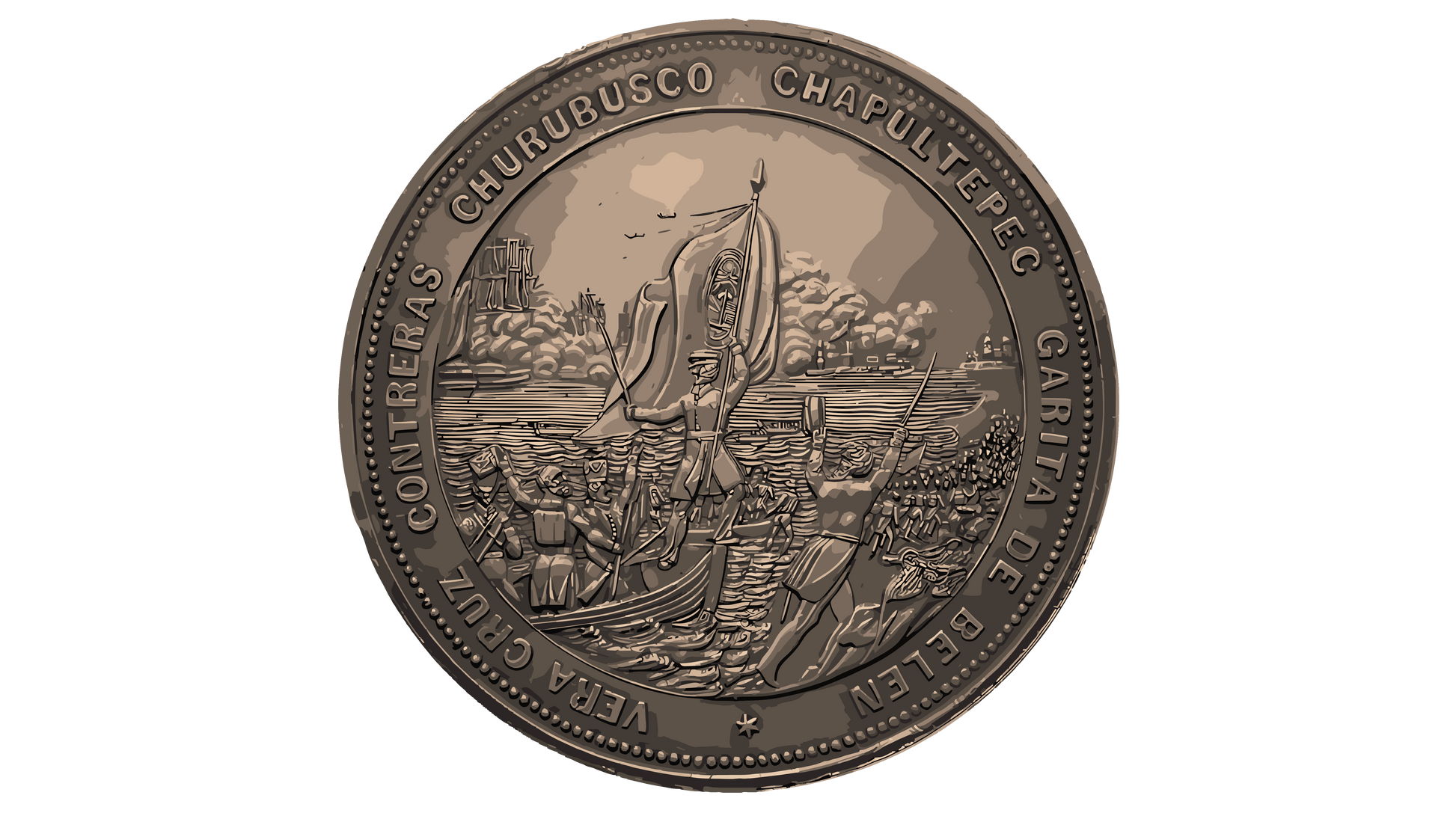 - "On one side is represented the landing of the American troops at Vera Cruz, the gallant leader of the Palmetto regiment, Col. Butler, having sprung from the boat that bore him to the shore, and with drawn sword, is calling on his command to follow - a figure, bearing the beloved Palmetto Flag, is on the prow of the boat, about to leap on shore, and plant the Standard, around which all appear eager to rally. To the right, are serried columns of troops on the line of march towards the Castle of San Juan; while in the distance is seen the American fleet, covering the landing of more troops, which are approaching the shore in boats. Around the edge of this side of the medal, in raised letters, are the names: "Vera Cruz," "Contreras," "Churubusco," "Chapultepec," and "Garita de Belen."