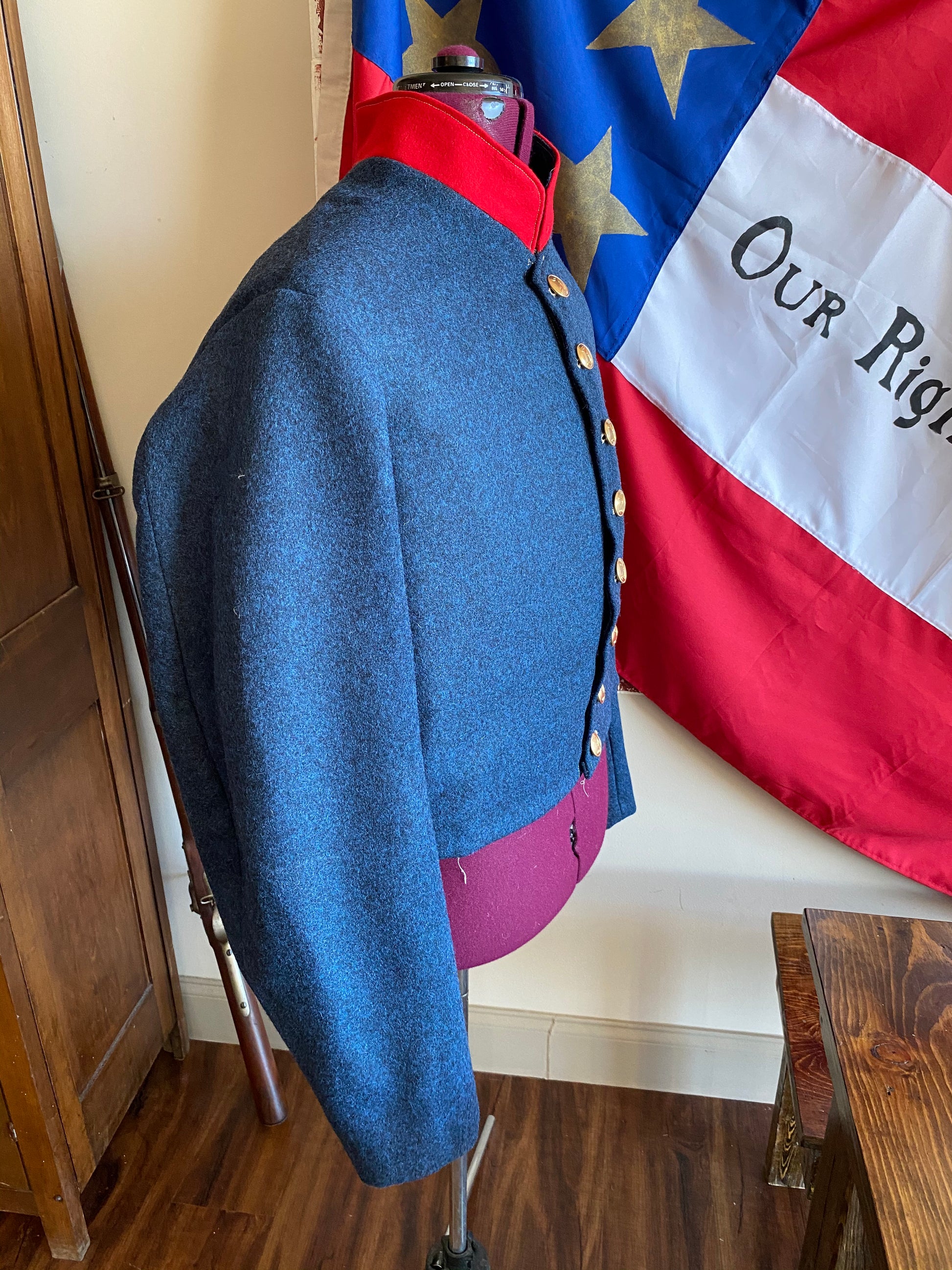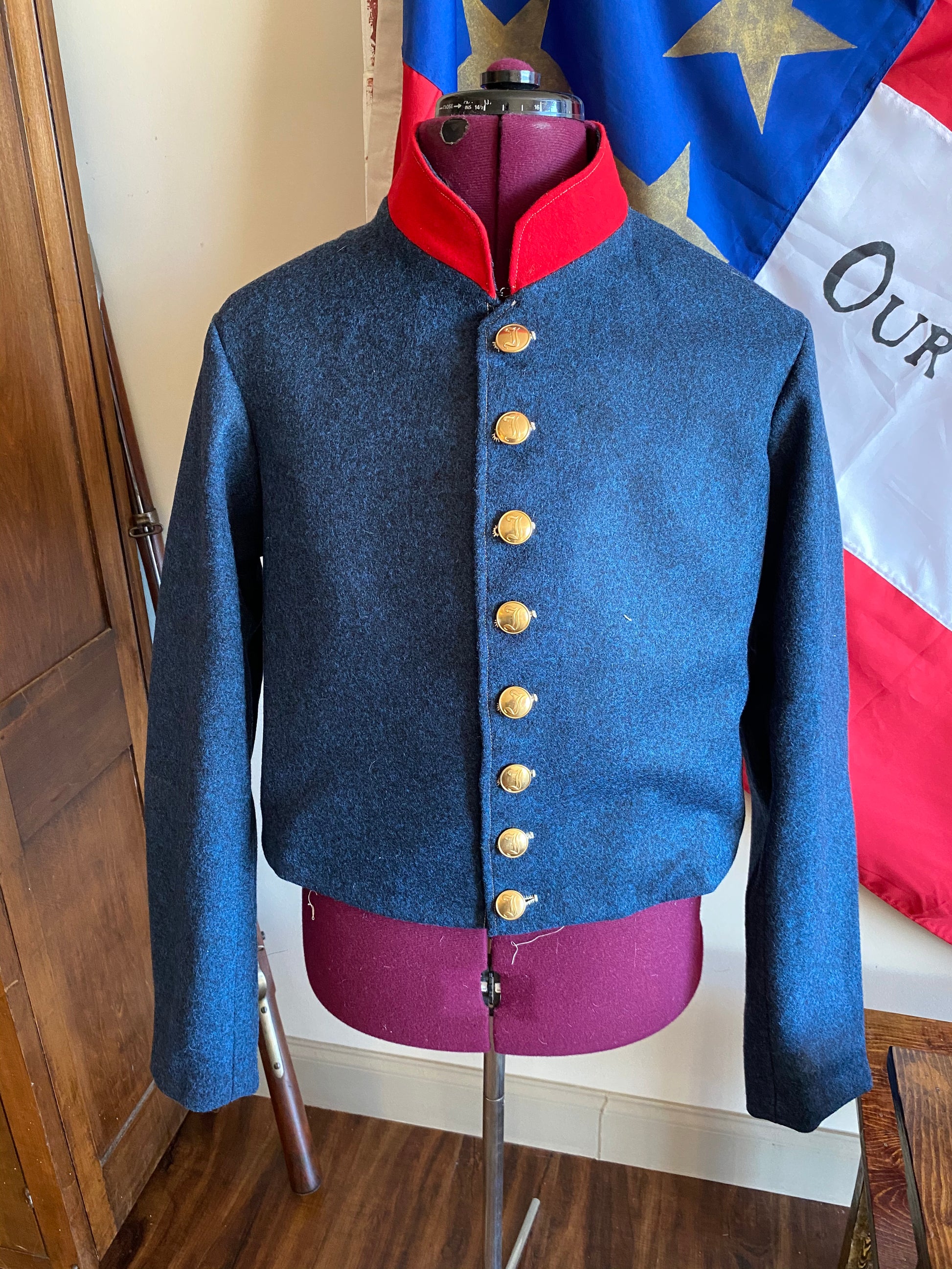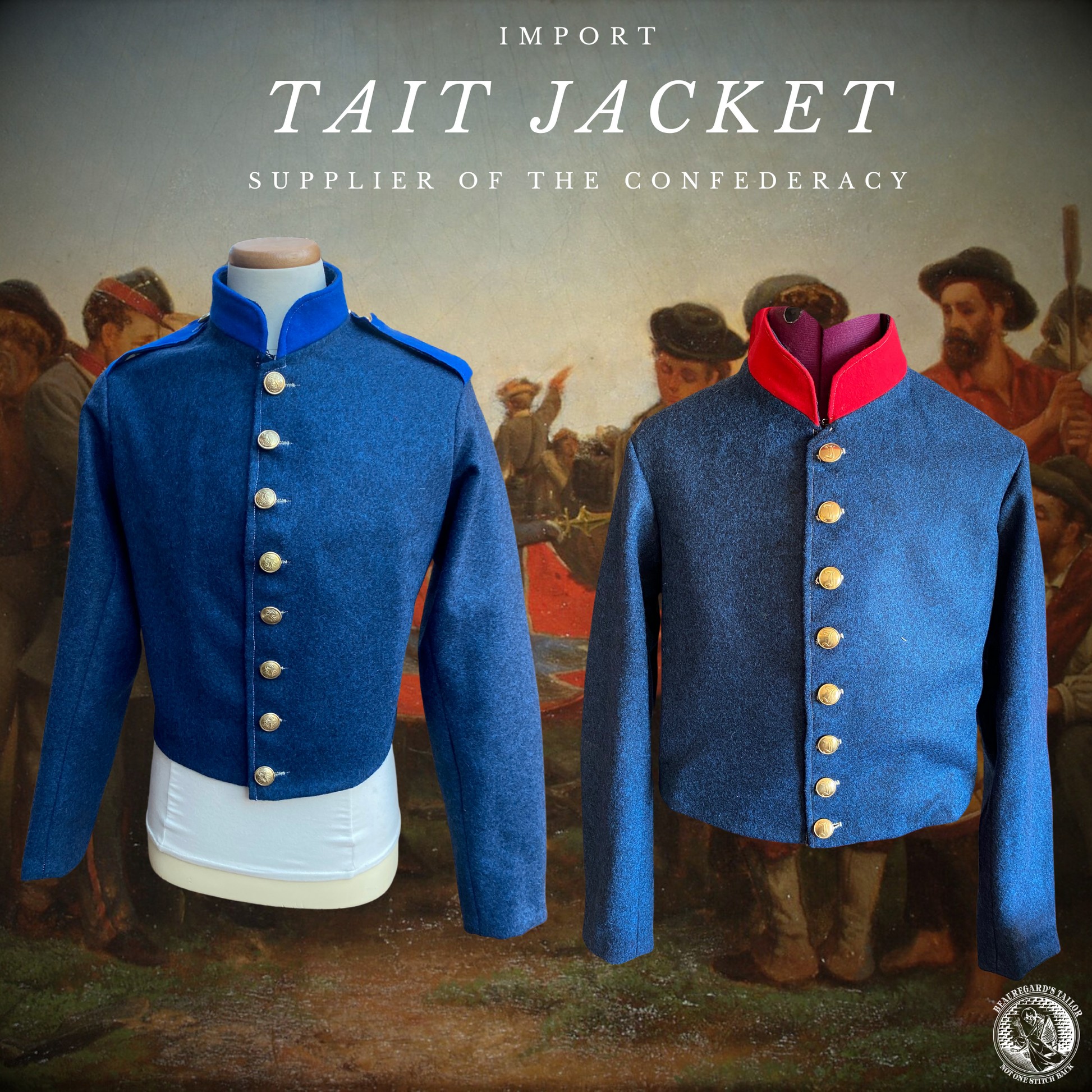 As part of the wide range of goods imported into the Southern Confederacy, finished garments made their way to the armies in the last year of the war. These jackets were primarily produced by the Peter Tait company and ranged in various patterns and trim styles. The first batches of the Tait Jackets would reach the Army of Northern Virginia in late 1864 and early 1865, however, these garments would arrive in the various coastal departments and Trans-Mississippi Theater early in 1864.