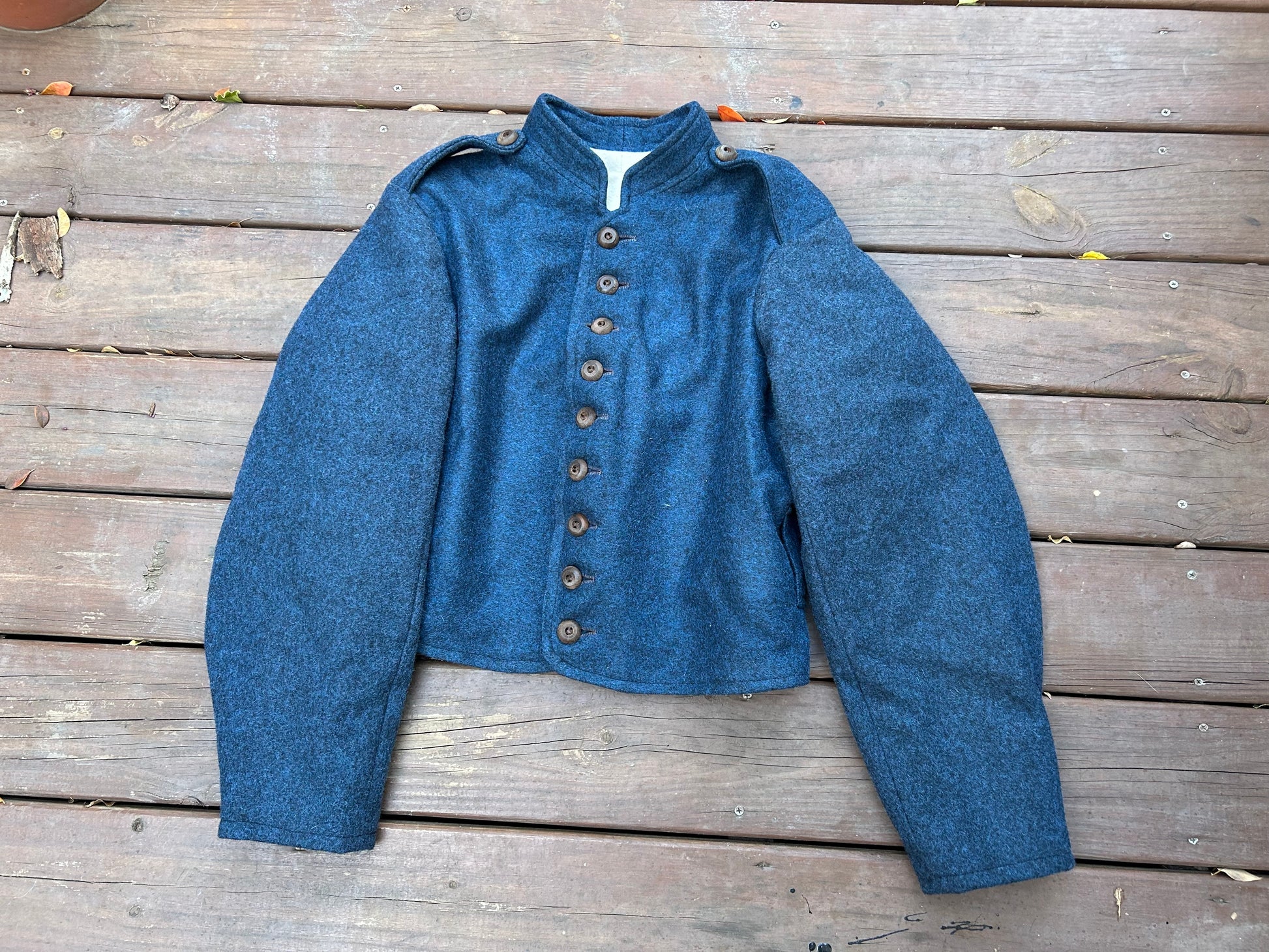 This is reproduction as produced from September of 1863 through the summer of 1864 in English Army Cloth. The Richmond Clothing Bureau's extensive use of machines in their jacket construction is reflected in this example. Like the original, the jacket is machine sewn long seams and top-stitching, with hand sewn sleeve caps, belt loops, buttonholes, and details.