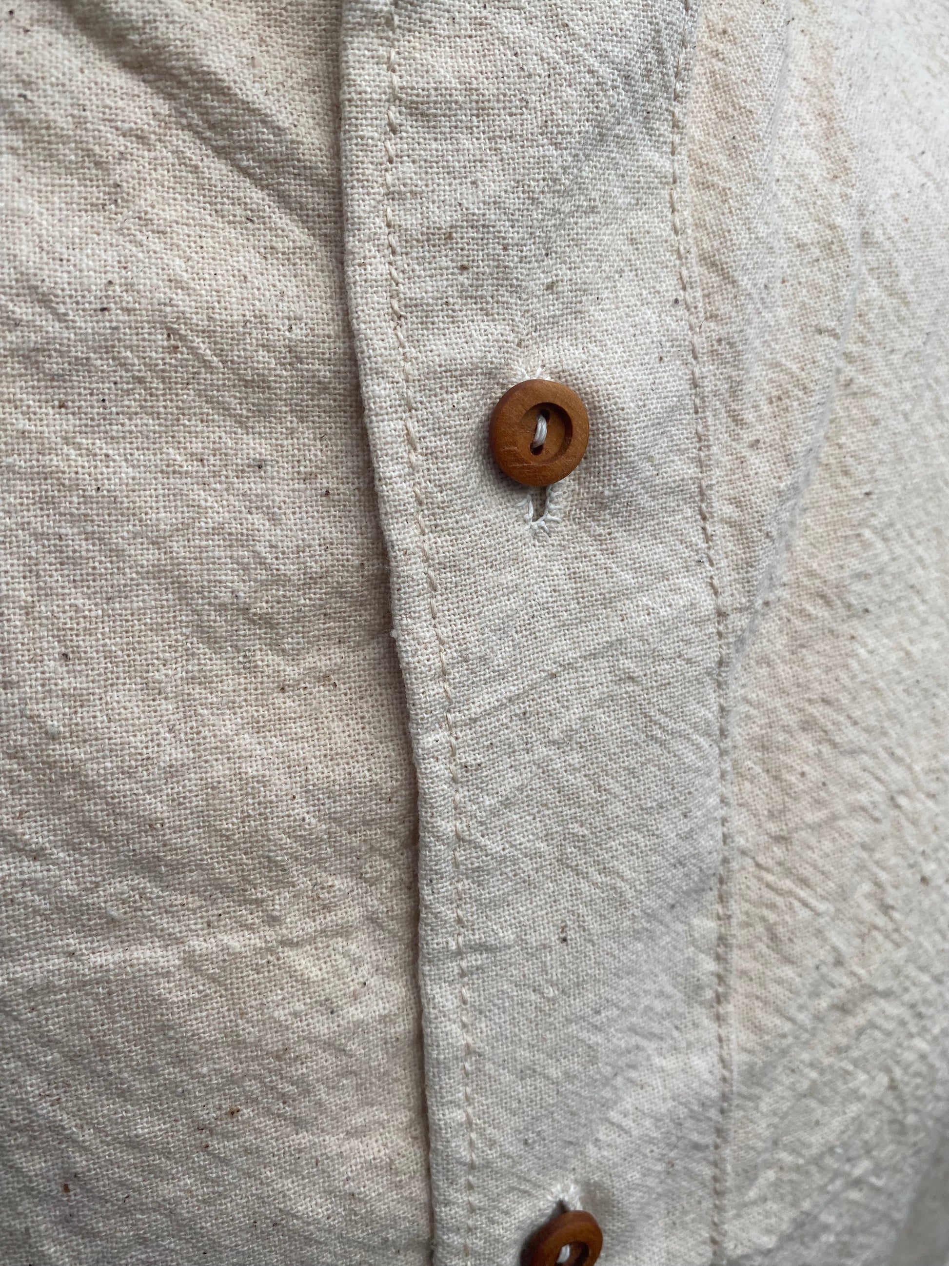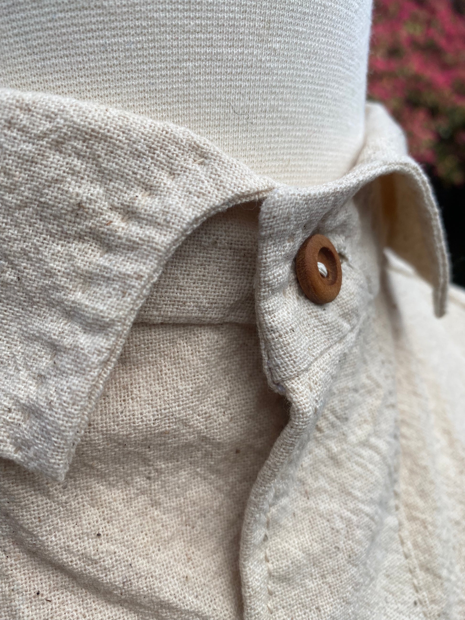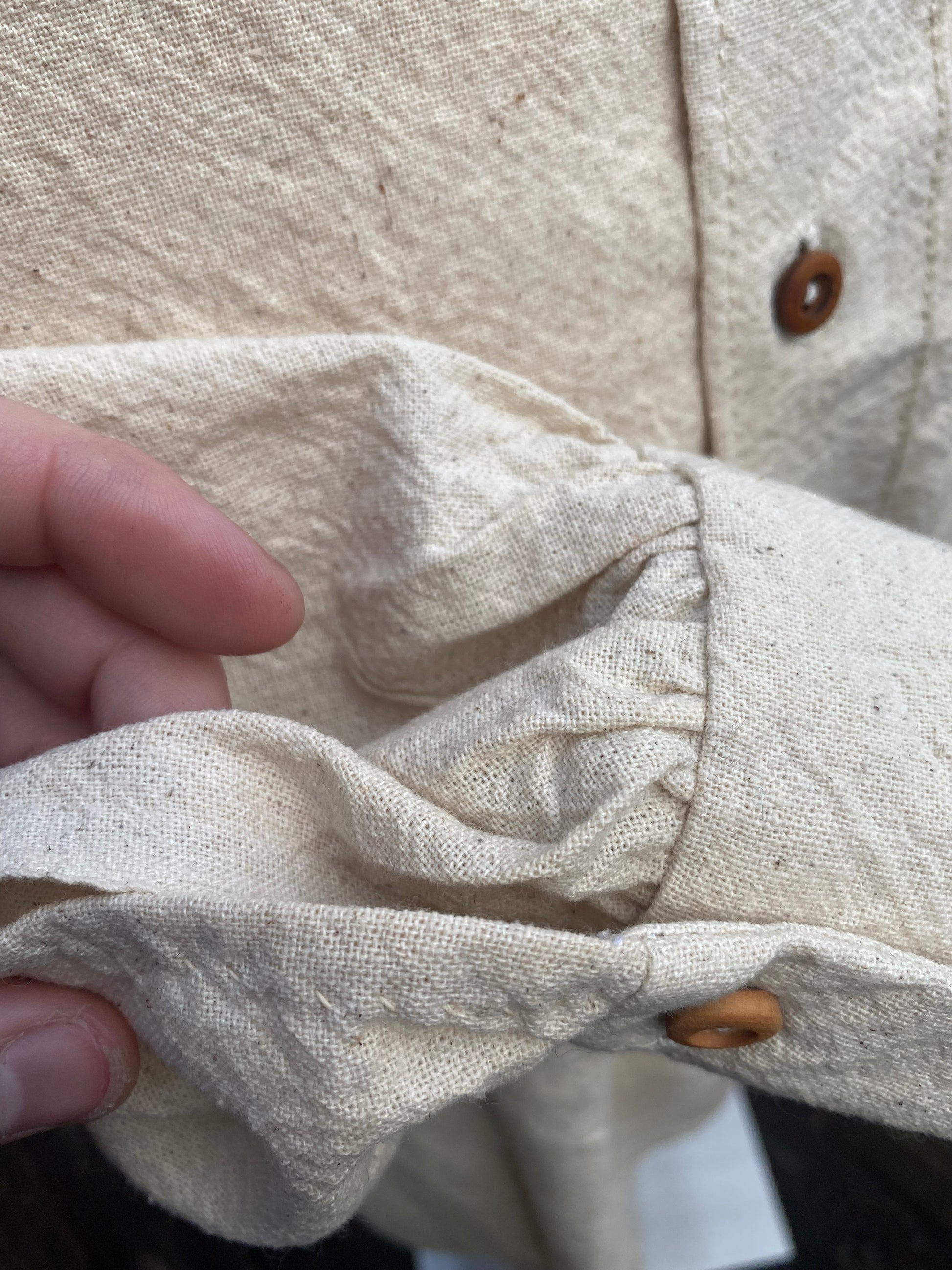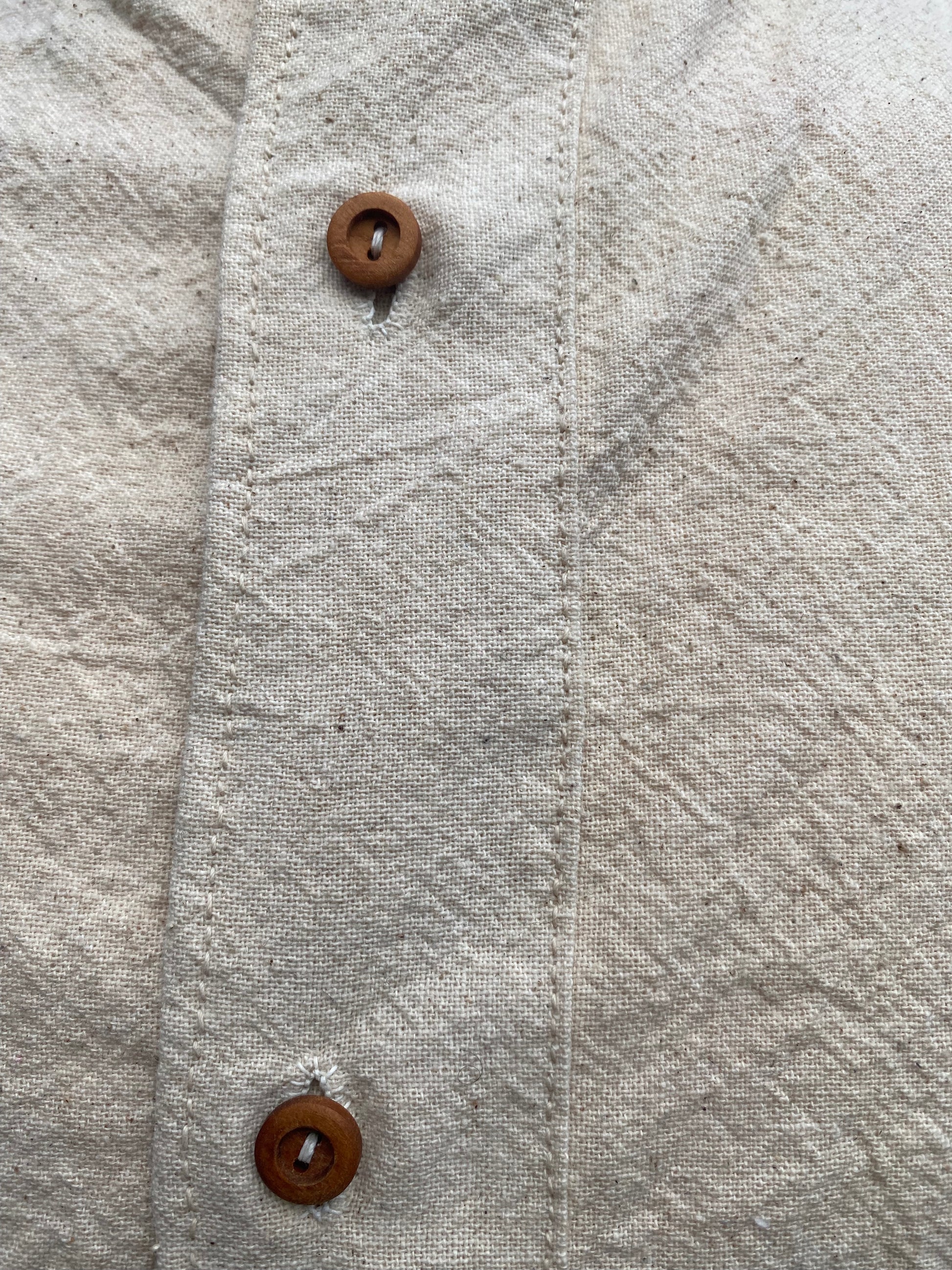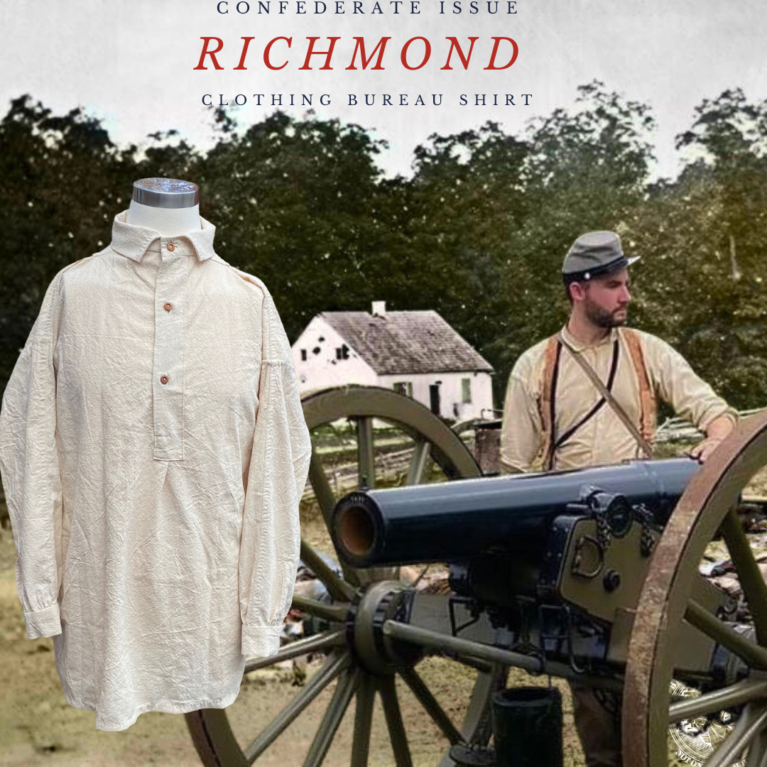 This reproduction is based on a surviving example originally worn by Henry Hollyday. The shirt is square cut and is constructed from cotton osanburg and closed with wooden buttons. The construction of the shirt is of the finest quality and shows far greater skill than many issue garments - including the extensive use of fine topstitching.