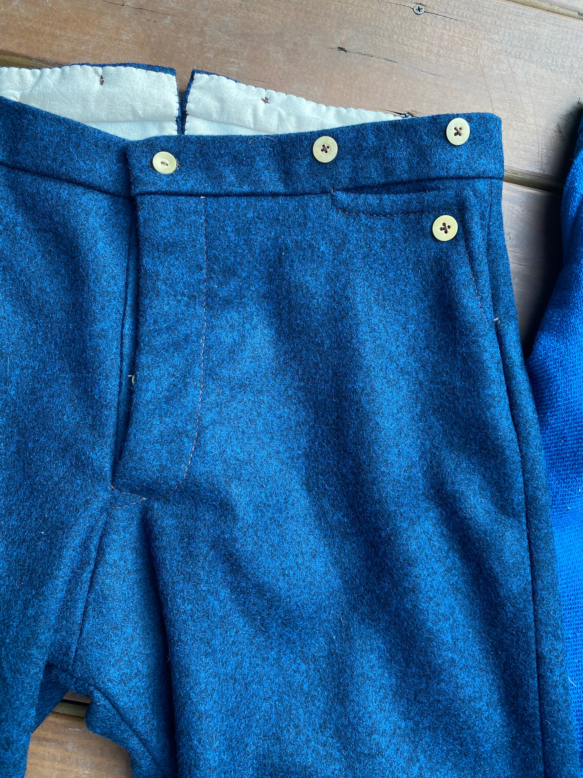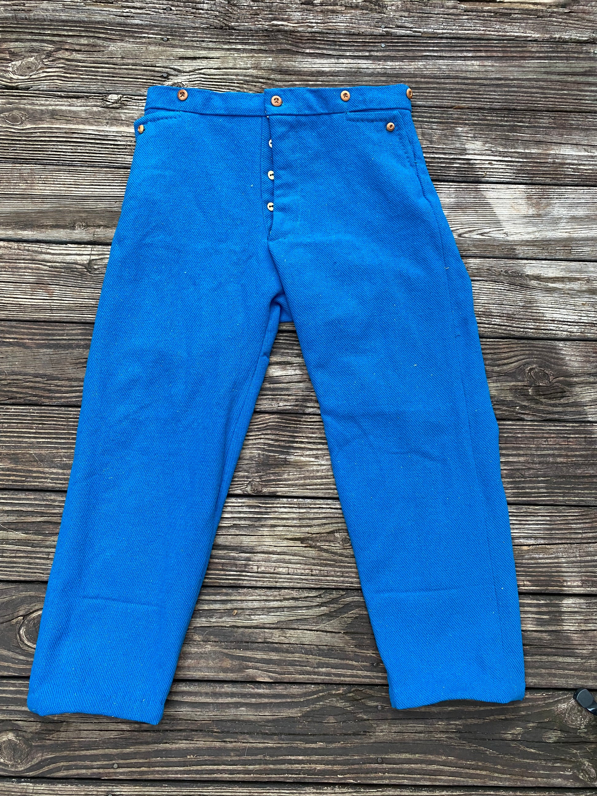 Private Henry Redwood of the 3rd Virginia Infantry, Local Defense Regiment was issued a pair of government-made pants in August 1864. This garment is a characteristic example of the pants produced by the Richmond Clothing Bureau. Constructed of imported English “sky blue” or “royal blue” kersey, lined in the same cotton osanburg used to make shirts and drawers and line jackets and caps, and exhibiting the same “closed” buttonhole fly facing seen in other nearly identical pants with ANV provenance, Redwood’s pants typify those issued by the hundreds of thousands to troops serving in Virginia in the latter half of the war.