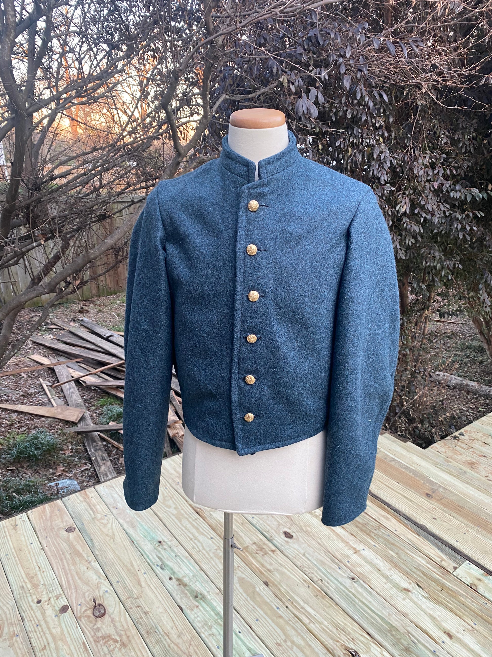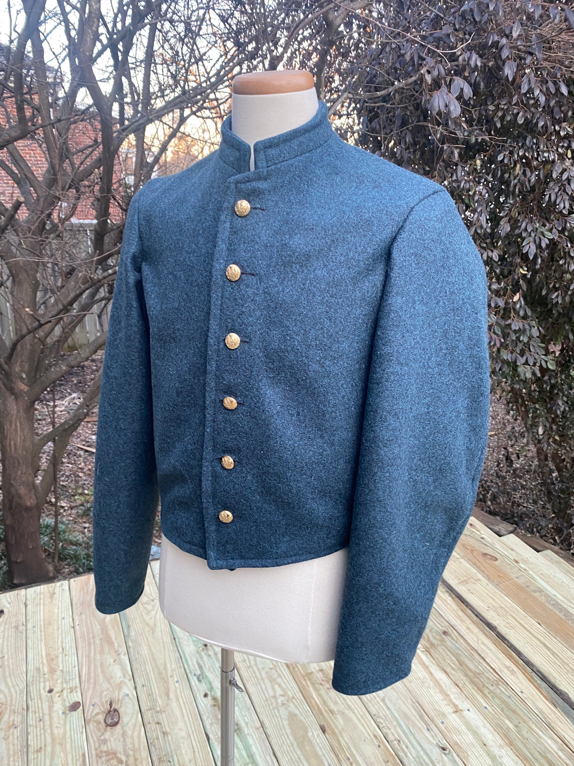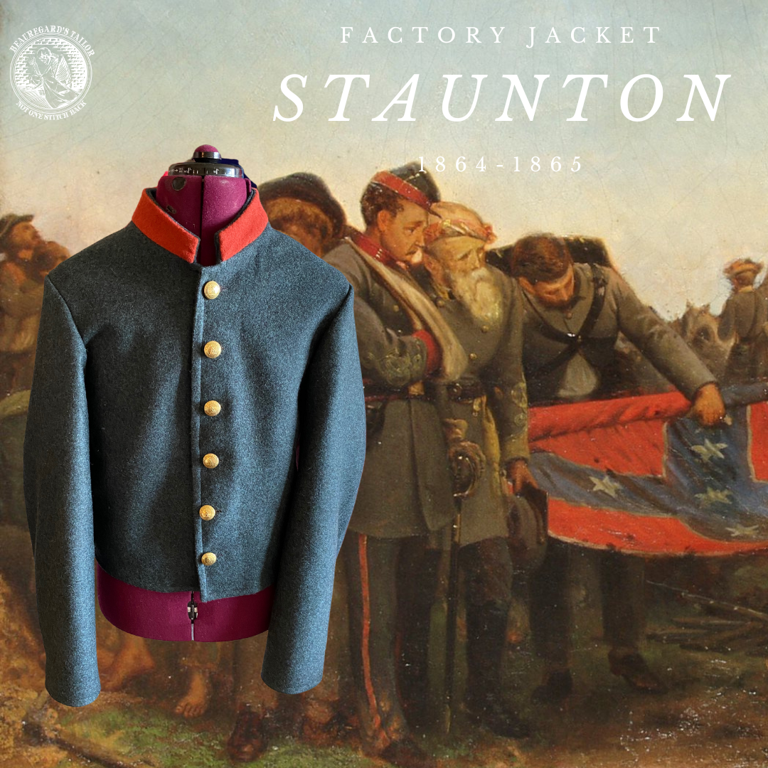 Staunton Army Factory Jacket is based on three known surviving originals that are believed to have been produced in the short lived facility. The first jacket is linked to the 31st Virginia Infantry while it was in service in the Army of the Valley. The second being received in Petersburg by a member of the 61st North Carolina Infantry. Finally a third is linked to an Army of Northern Virginia Sharpshooter Battalion who fought at Fort Stedman.