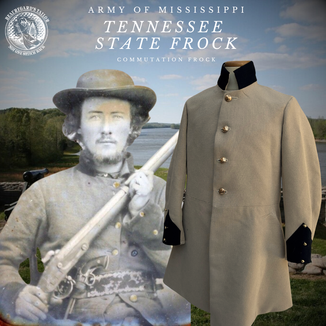 The Tennessee State Frock coat is widely seen amongst the soldiers from the State of Tennessee during the opening years of the war. Primarily in use during the Fort Henry/Donelson, Shiloh/Corinth Campaign, and Kentucky Campaign. While no official pattern included all common features, the underlying theme of a trimmed collar, front cuff facing (with buttons), and at times an outside pocket are extremely common amongst the known images. In addition to Tennessee forces, units that purchased good from Tennessee were also clothed in these frocks. An example of this is the Missourians under Price purchased these coats before the battles of Iuka and Corinth in the fall of 1862 - supported by the original purchase documents and known images of the Missourians.