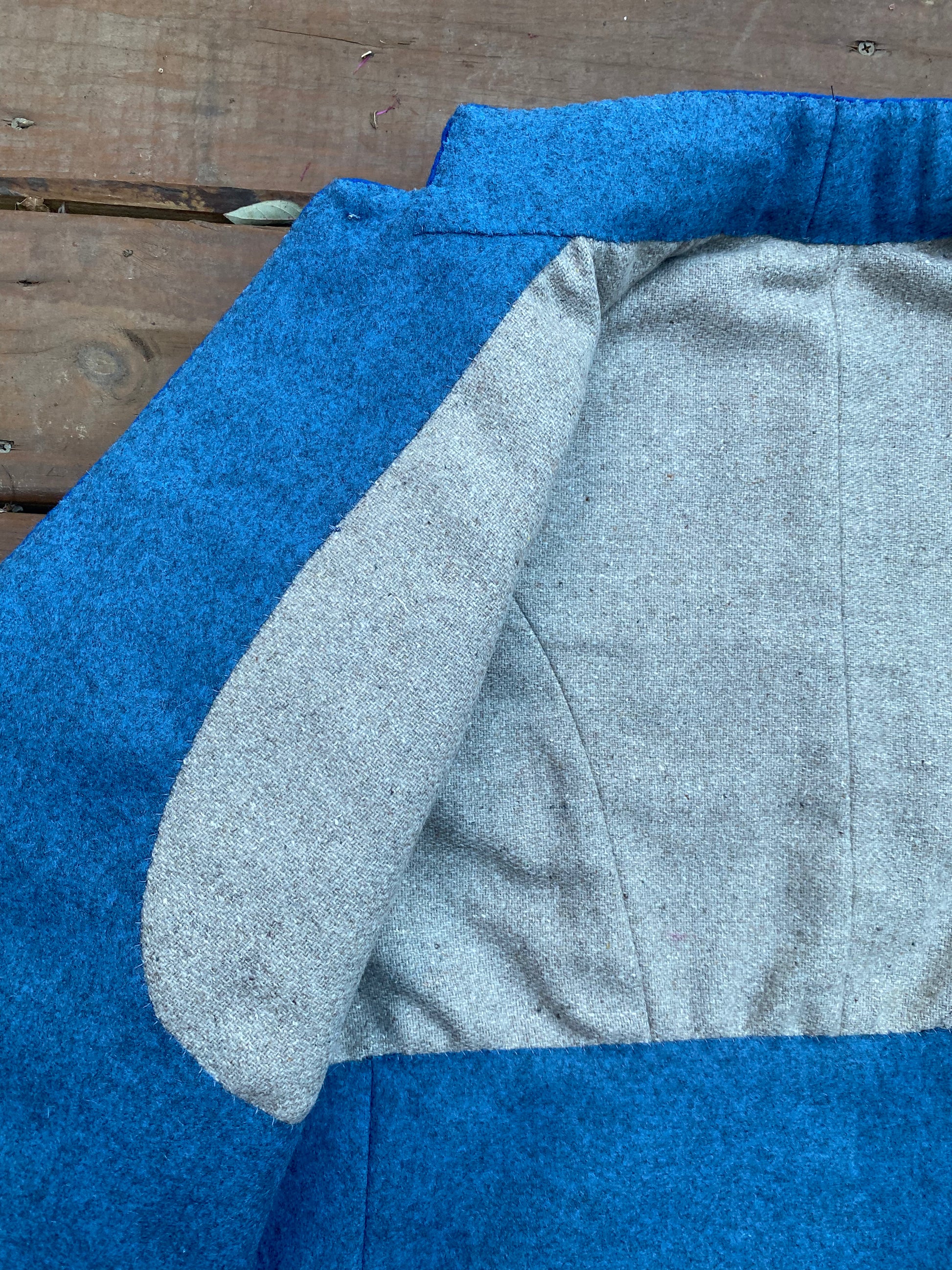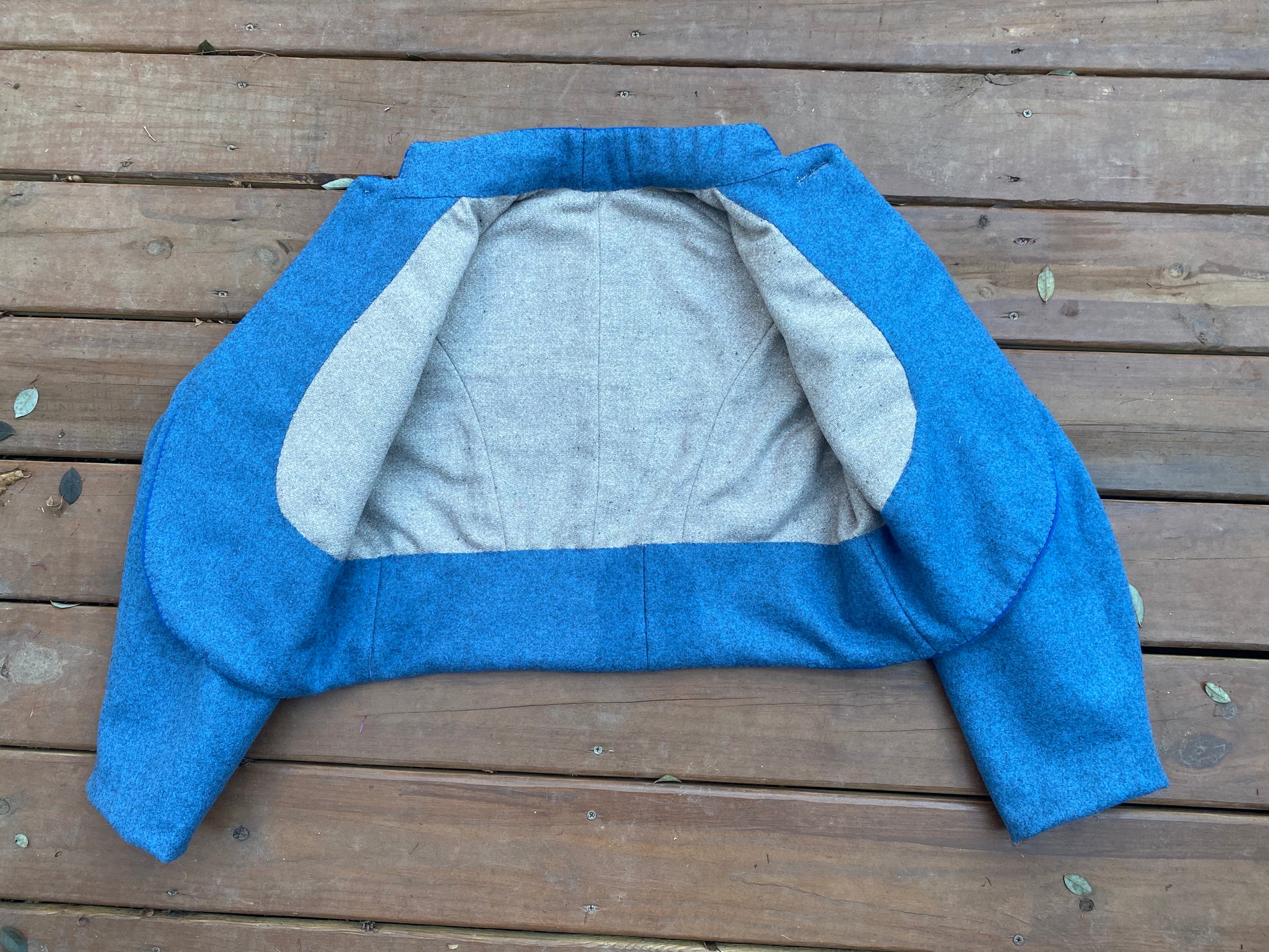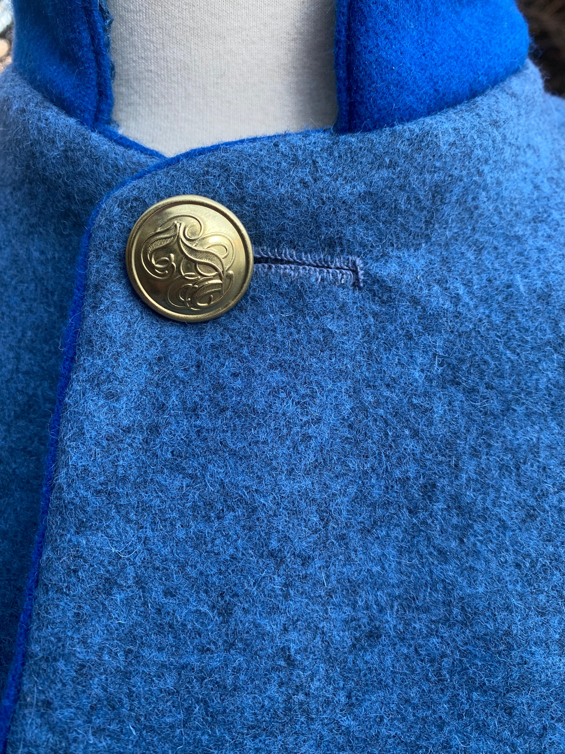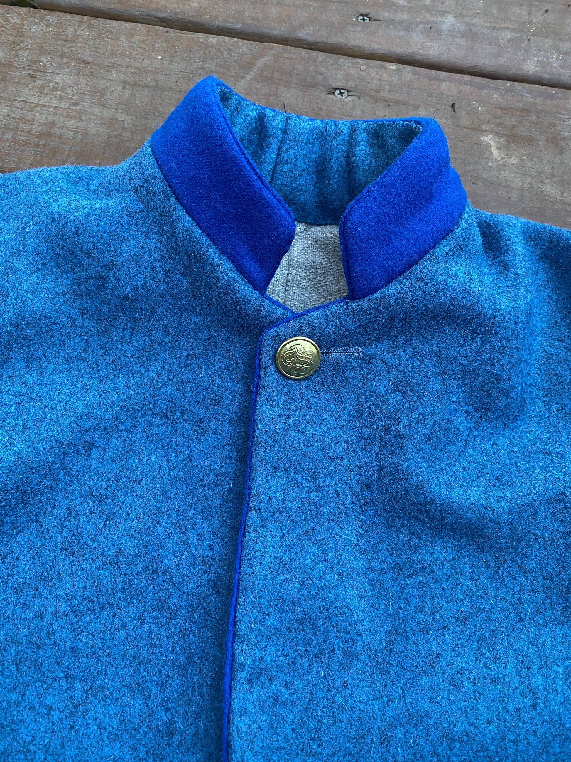Based on a jacket worn by Lt John Duncan Holiday - Tappan's Arkansas Brigade, the jacket is a usual style of almost Zouave pattern. The jacket has a single button closure, with service trim piping around the edge and collar is trimmed. The body of the coat is made from cadet gray broadcloth and lined in osanburg. Similar jackets are seen in use by various Missouri State Guards officers and other Trans-Mississippi officers.