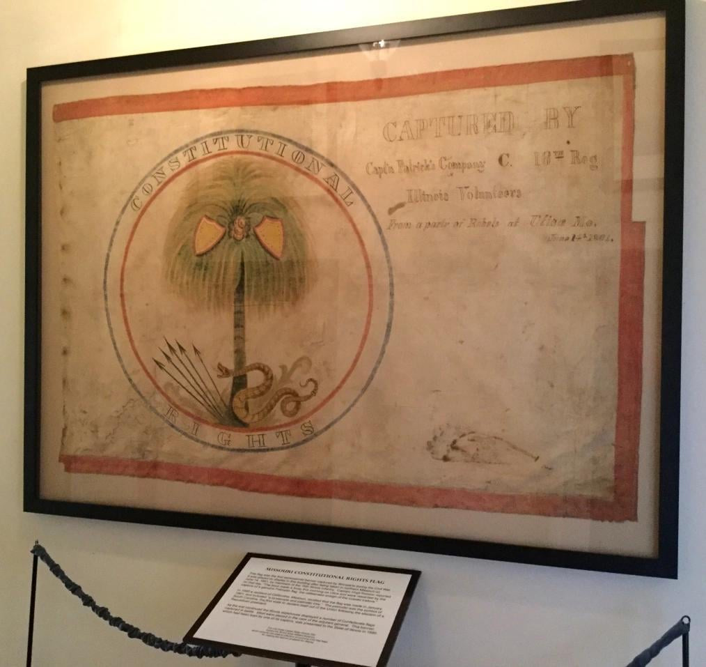 Secession flag captured with the fall of Utica Missouri by the 16th Illinois. While the pair of the Palmetto and snake is generally imagery linked to South Carolina, its usage was seen across the South as a symbol of resistance. Similar designs are noted amongst two other flags captured in Missouri.
